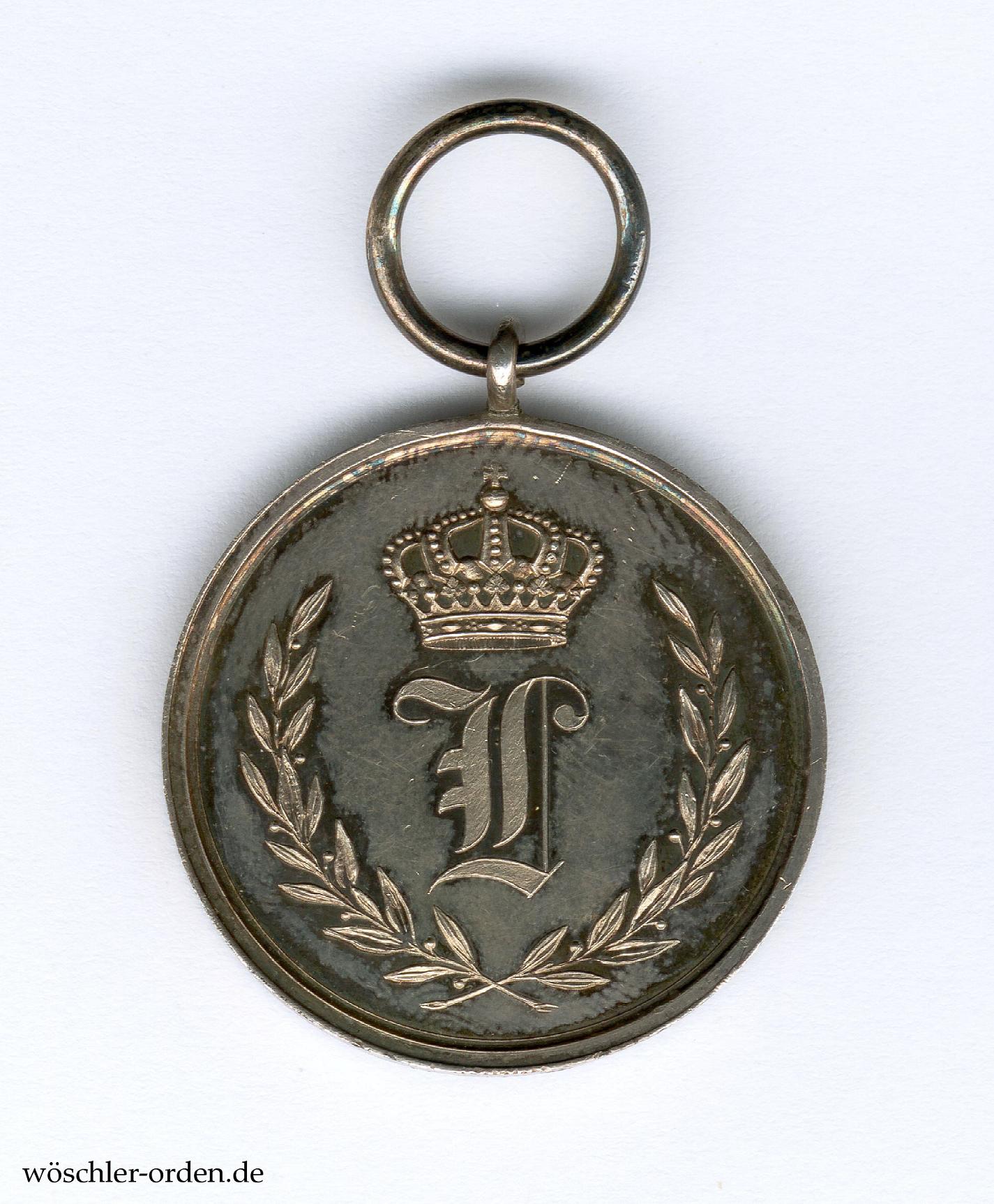 Silber geprägt, an angelöteter, rückseitig offener Ringöse mit einem geschlossenen Bandring. Vorderseitig das gekrönte Monogramm „L“ des Stifters zwischen Lorbeerzweigen. Rückseitig dreizeilige Zweckinschrift „Für / funzigjährige / Diensttreue“, darunter Querstrich sowie zwei Eichenzweige.