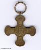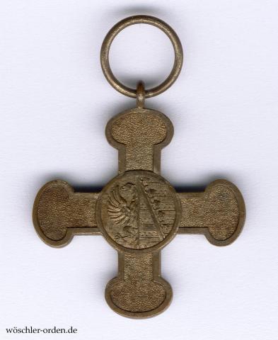 Bronze geprägt und versilbert, an einfacher, angelöteter Ringöse mit einem geschlossenen Bandring. Exemplar mit unaufgelöster und bislang unbekannter oder nicht beschriebener Punzierung „B“ in der Ringöse. Gefertigt und geliefert wurden diese Kreuze durch die Hofjuweliersfirma Otto Heinzelmanns Witwe, Dessau.