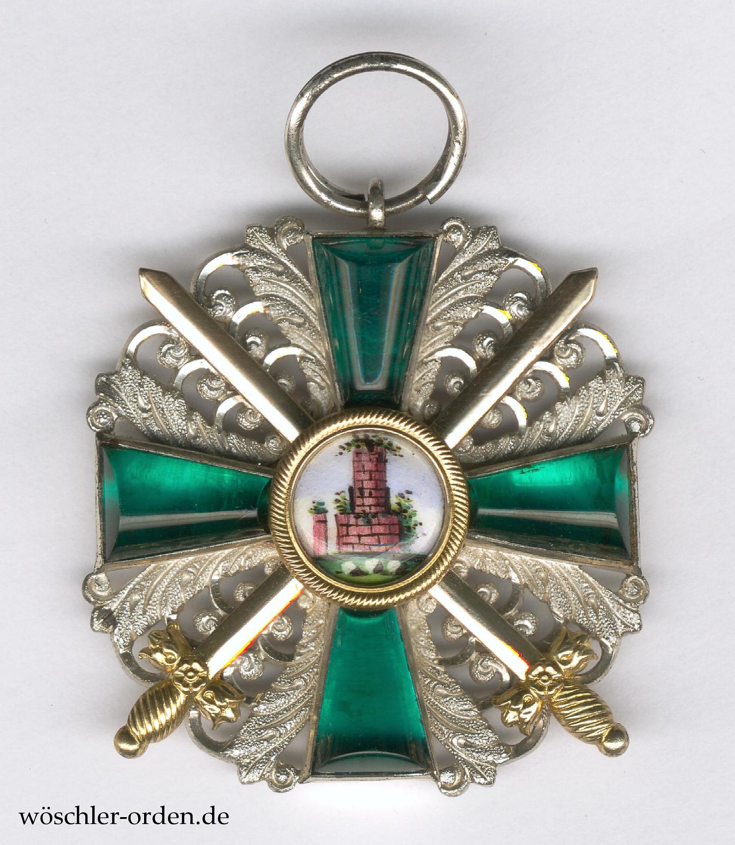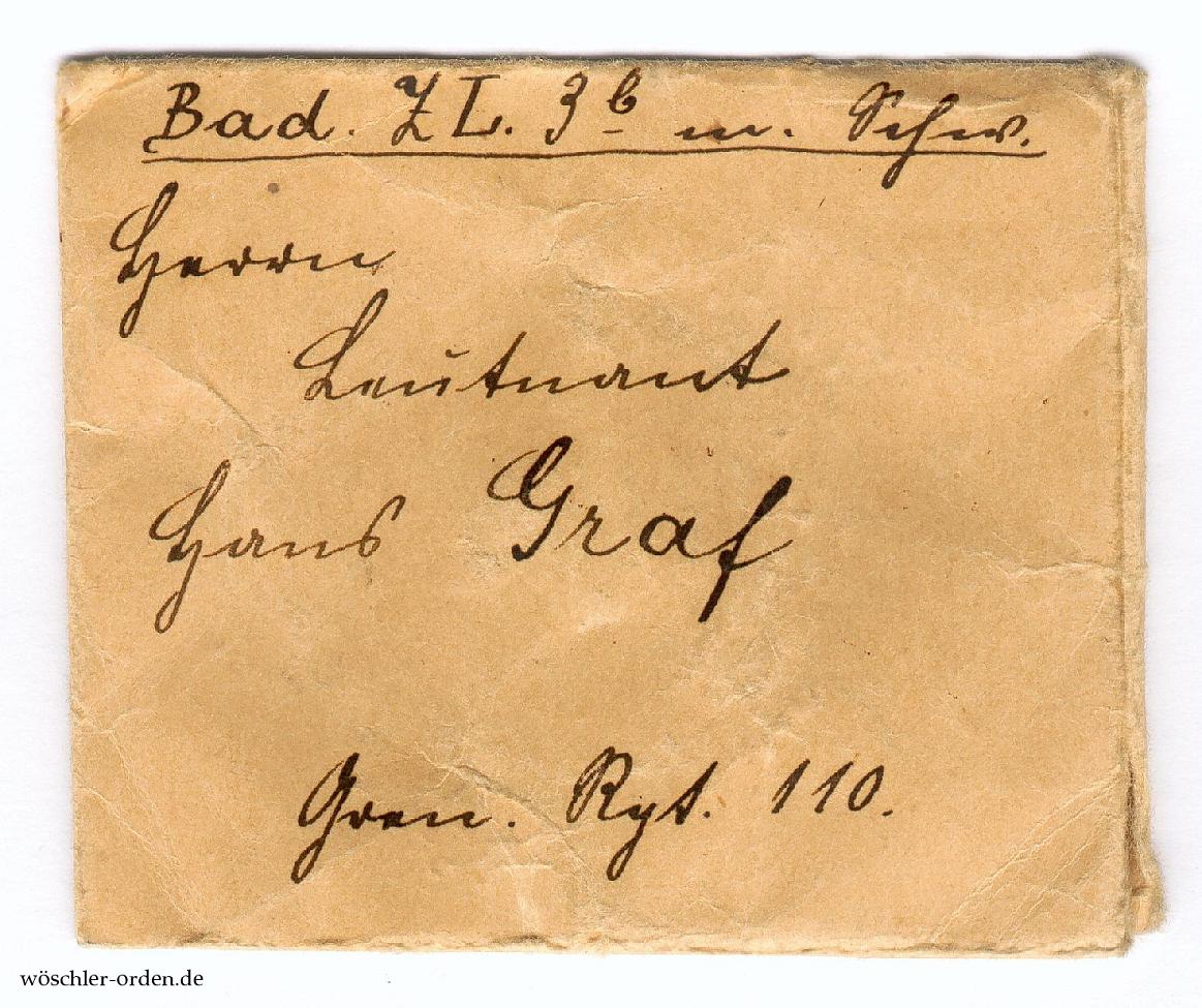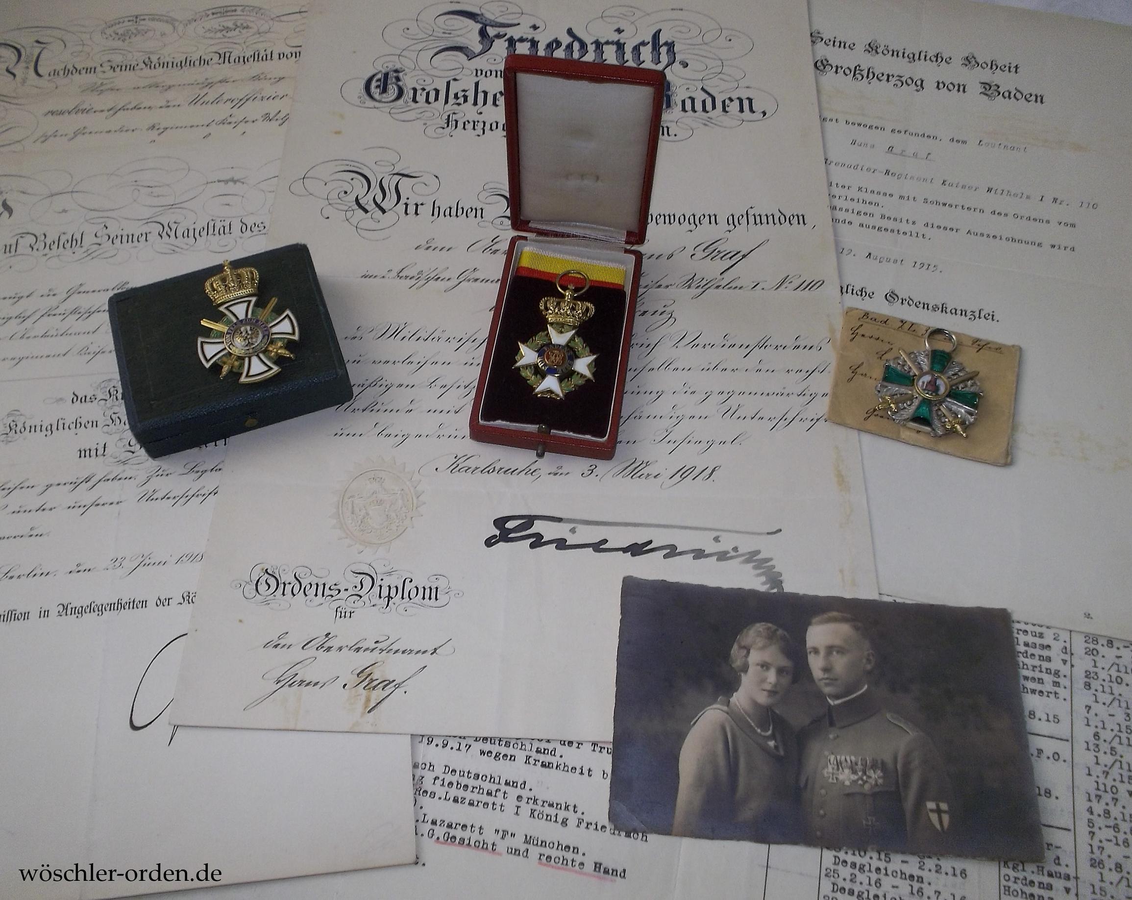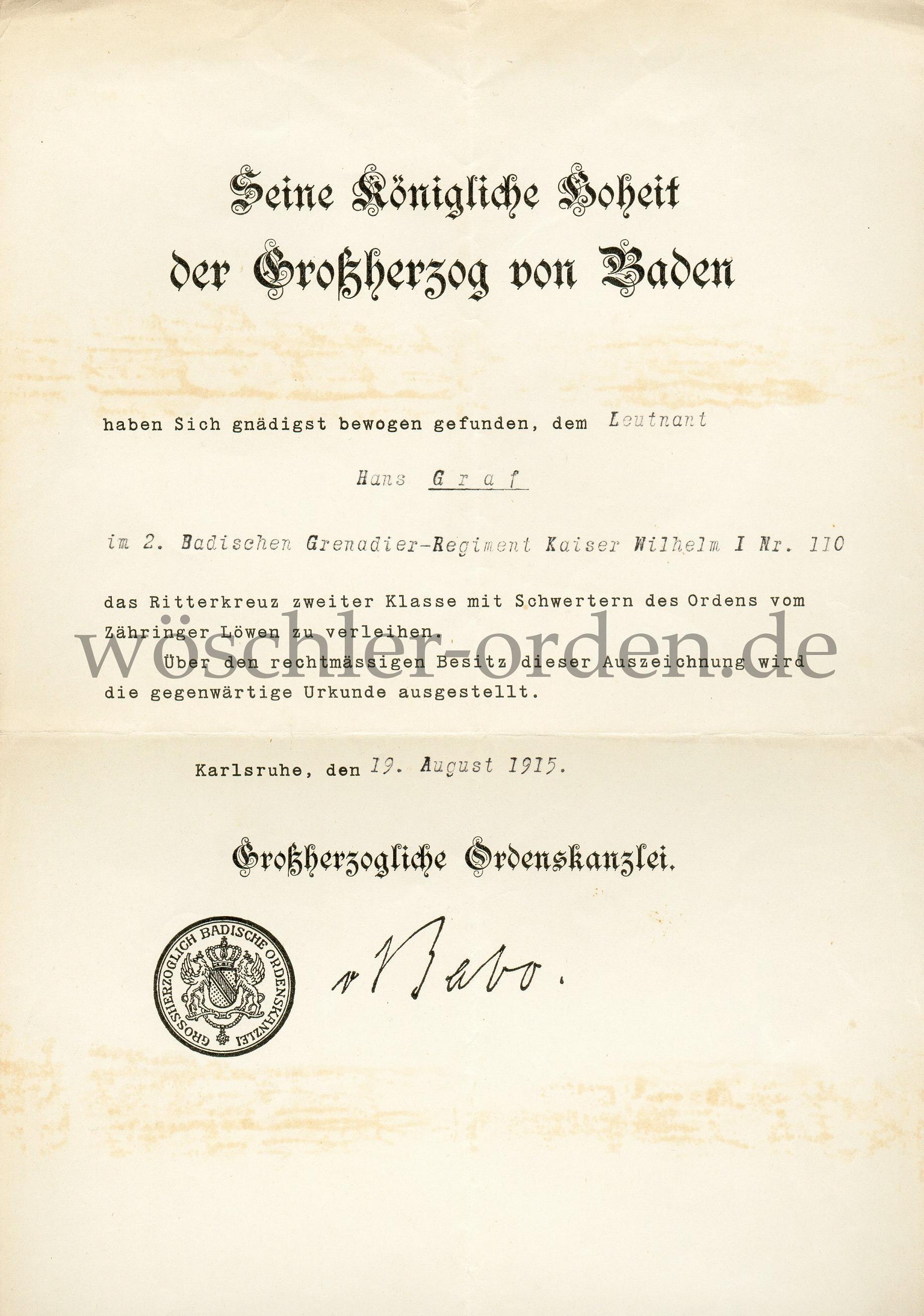 • Baden, Orden vom Zähringer Löwen, Ritterkreuz II. Klasse mit Schwertern. Ebenfalls eine Weltkriegsfertigung der Firma C. F. Zimmermann, Pforzheim. Silber, mehrteilig gefertigt, teilweise mit Goldauflage („Doublé“). Das Medaillon der Vorderseite in Emaillemalerei, das der Rückseite transluzid rot emailliert. Die Kreuzarme vorderseitig mit grünen Glassteinen besetzt. Dazu die Urkunde für den „Leutnant Hans Graf im 2. Badischen Grenadier-Regiment Kaiser Wilhelm I Nr. 110“, vollzogen Karlsruhe, 19. August 1915. Außerdem die Verleihungstüte des ersten Typs, mit der komplett handschriftlichen Personalisierung durch die Ordenskanzlei, rückseitig mit Klebesiegel.