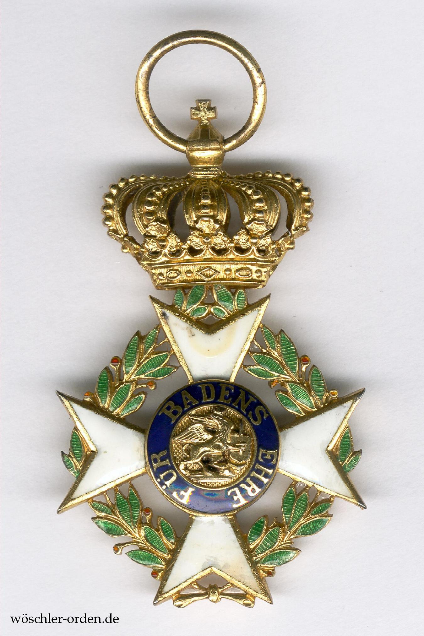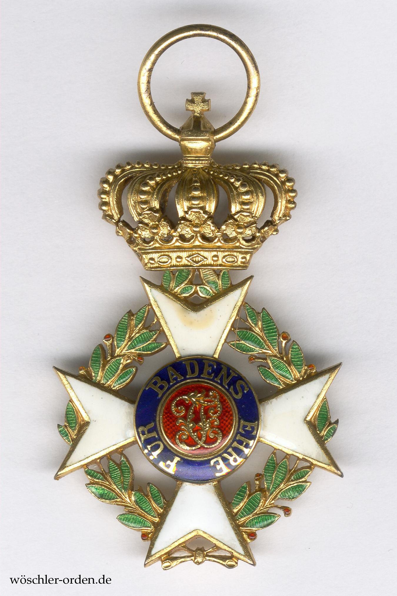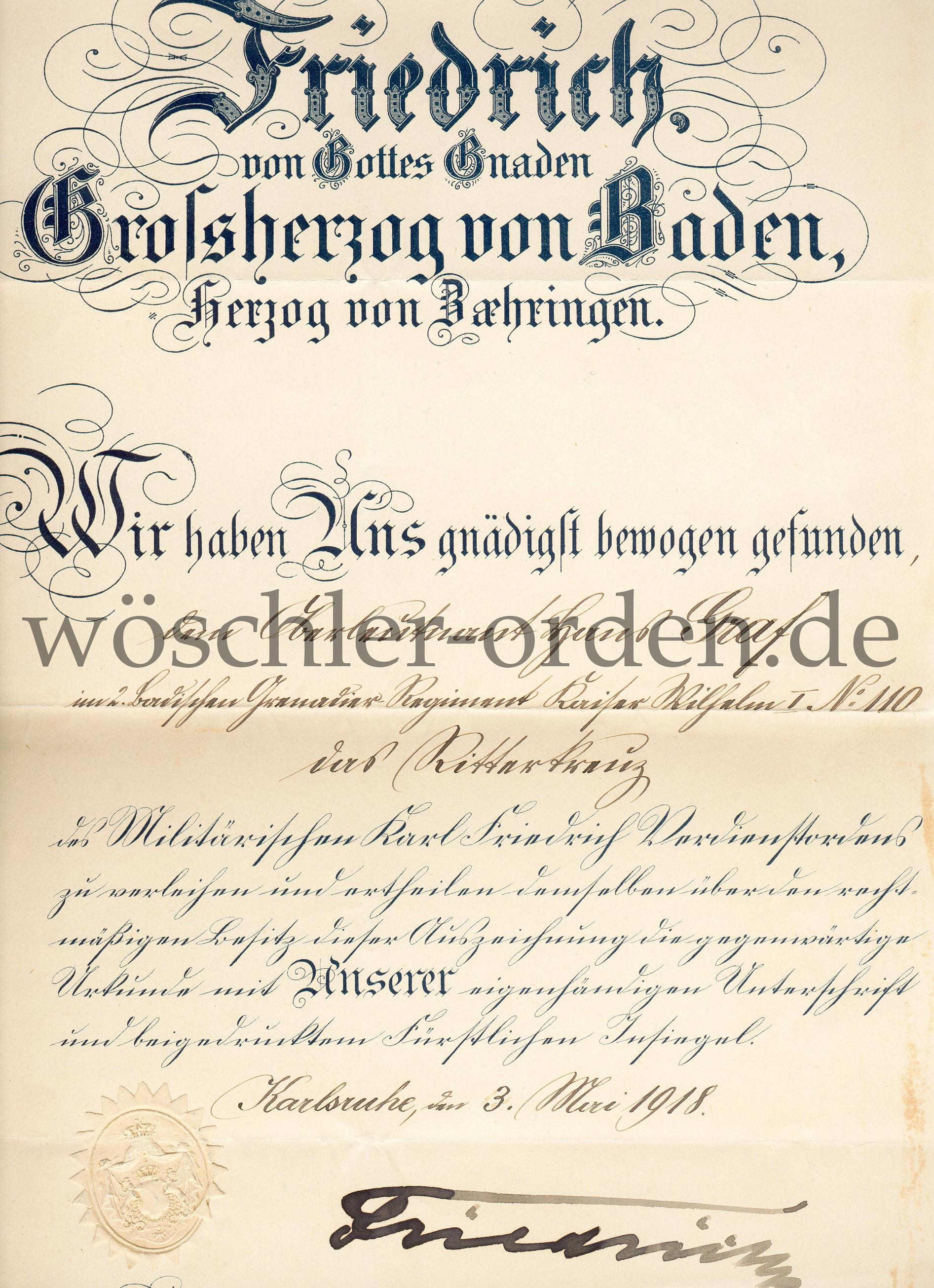 • Baden, Militärischer Karl-Friedrich-Verdienstorden, Ritterkreuz. Exemplar der letzten Ausgabe, mit den größeren Abmessungen, die ab etwa März 1916 durch die Firma C. F. Zimmermann, Pforzheim, gefertigt und geliefert wurde. Silber, mehrteilig gefertigt, vergoldet und emailliert, die Medaillonringe Gold, ebenso der gestichelte Untergrund unter dem silbernen, im rückseitigen Medaillon aufgelegten Greifen. An mittels eines Scharniers beweglich angebrachter Krone mit ebenfalls beweglichem Bandring durch deren Reichsapfel. Ohne Punzierungen. Zusammen mit ungetragenem, etwa 29 cm langem Bandstück im mit rotem Lederimitat bezogenen Verleihungsetui, dieses mit einer goldenen Zierlinie auf dem Deckel und ansonsten, wie üblich, ohne weitere Bezeichnungen. Dazu die als „Ordens-Diplom“ bezeichnete Urkunde über die Verleihung an den „Oberleutnant Hans Graf im 2ten Badischen Grenadier-Regiment Kaiser Wilhelm I. No. 110“, vollzogen Karlsruhe, 3. Mai 1918, mit Originalunterschrift Großherzog Friedrich II. in Tinte.