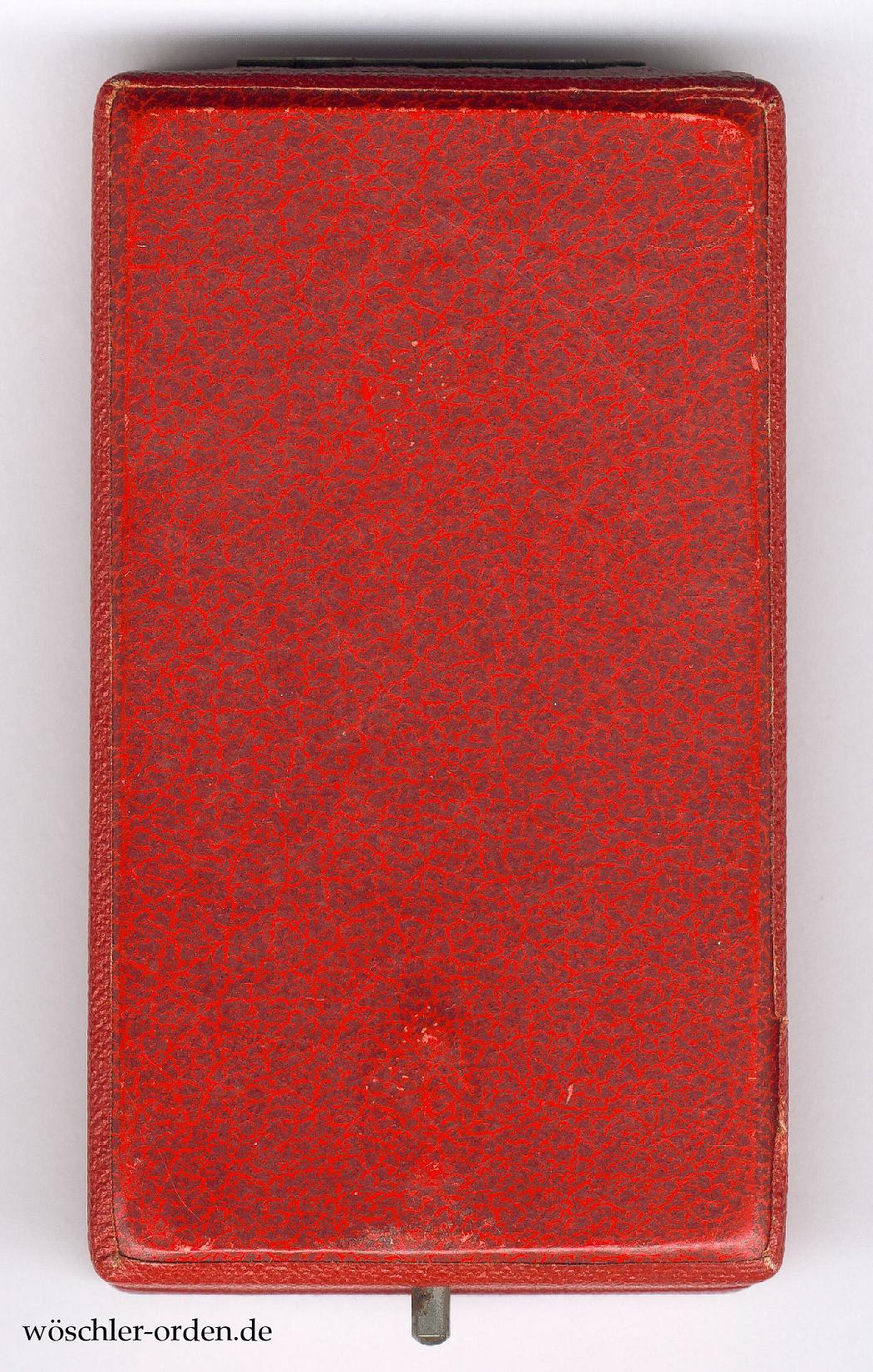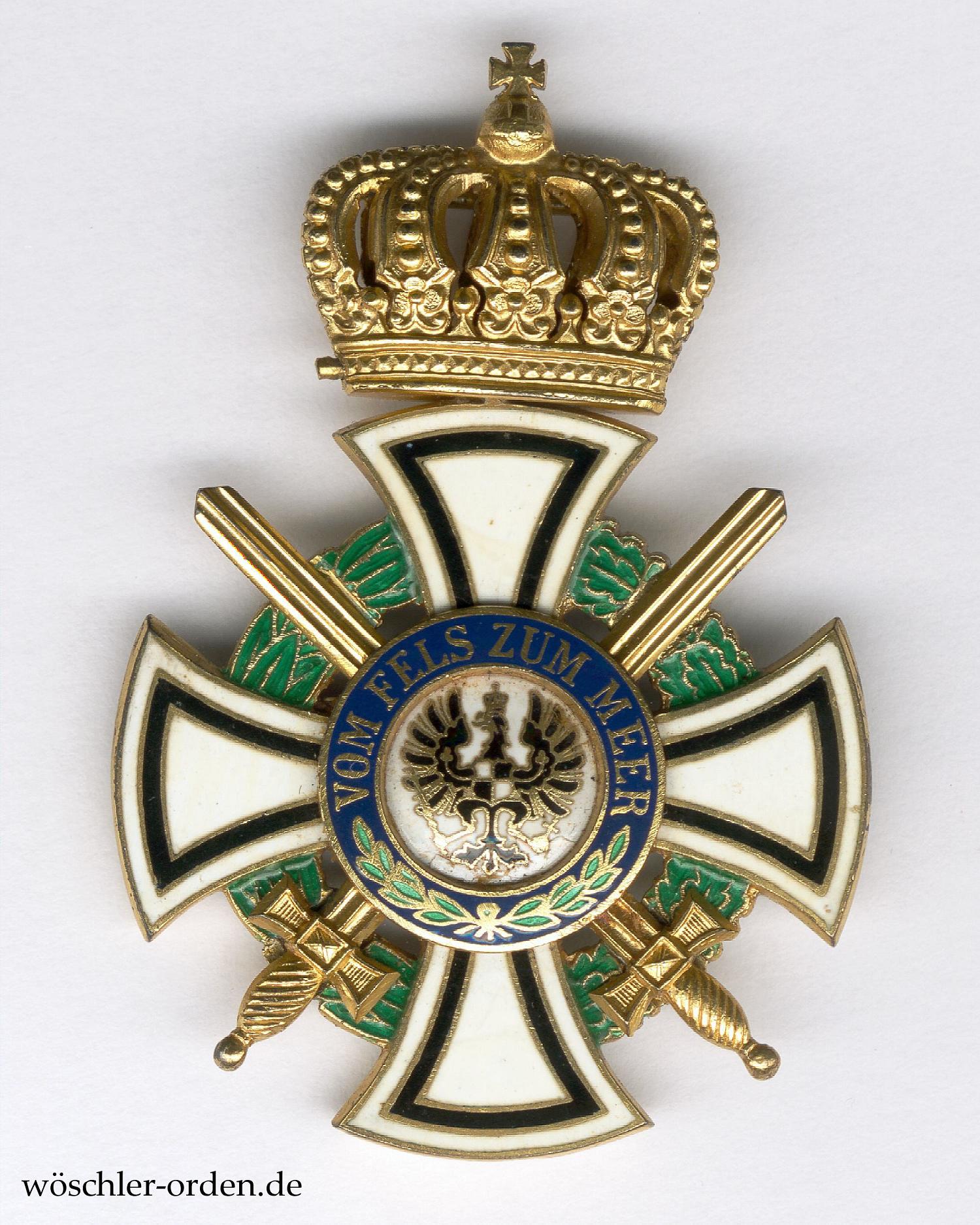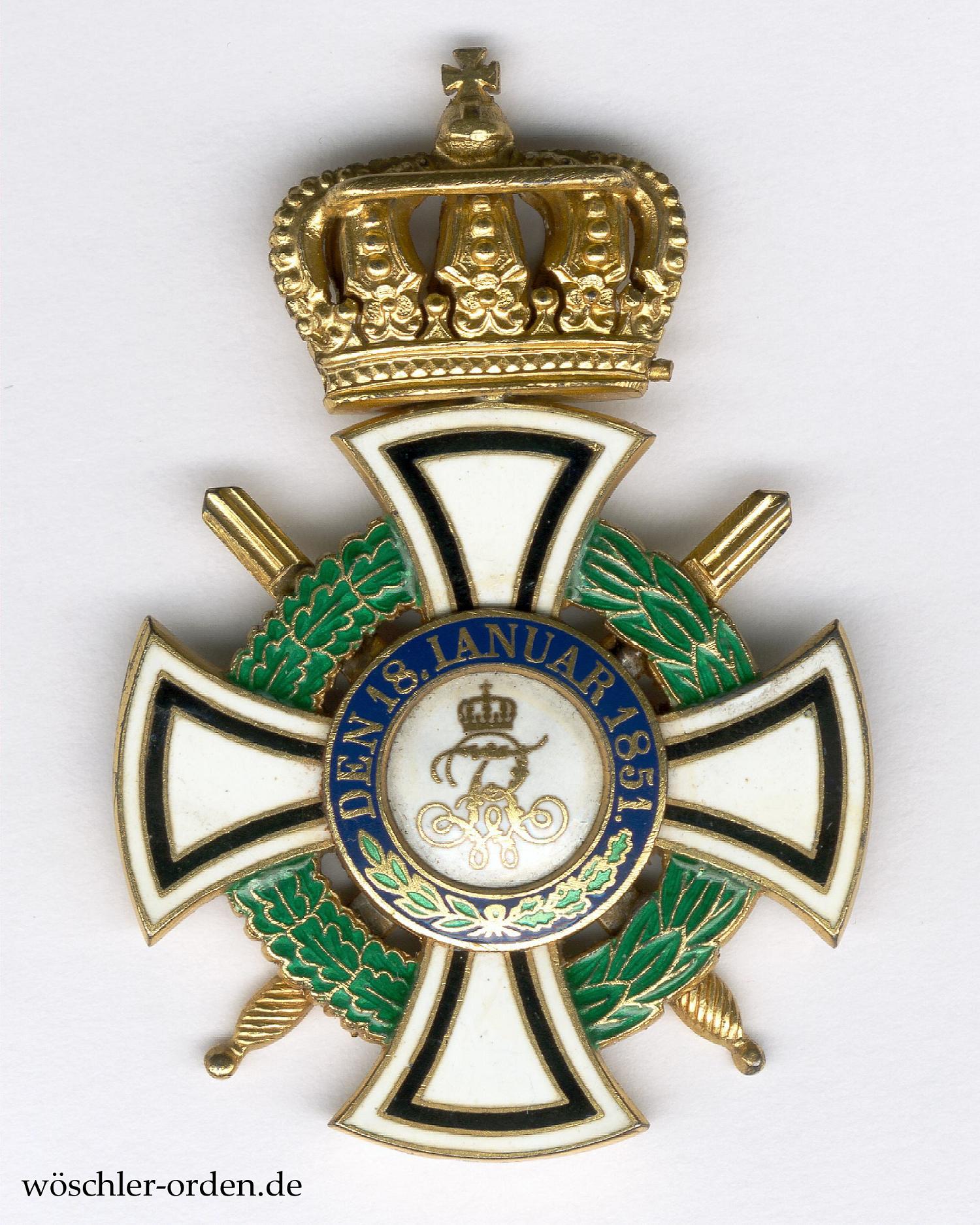 • Baden, Militärischer Karl-Friedrich-Verdienstorden, Ritterkreuz. Exemplar der letzten Ausgabe, mit den größeren Abmessungen, die ab etwa März 1916 durch die Firma C. F. Zimmermann, Pforzheim, gefertigt und geliefert wurde. Silber, mehrteilig gefertigt, vergoldet und emailliert, die Medaillonringe Gold, ebenso der gestichelte Untergrund unter dem silbernen, im rückseitigen Medaillon aufgelegten Greifen. An mittels eines Scharniers beweglich angebrachter Krone mit ebenfalls beweglichem Bandring durch deren Reichsapfel. Ohne Punzierungen. Zusammen mit ungetragenem, etwa 29 cm langem Bandstück im mit rotem Lederimitat bezogenen Verleihungsetui, dieses mit einer goldenen Zierlinie auf dem Deckel und ansonsten, wie üblich, ohne weitere Bezeichnungen. Dazu die als „Ordens-Diplom“ bezeichnete Urkunde über die Verleihung an den „Oberleutnant Hans Graf im 2ten Badischen Grenadier-Regiment Kaiser Wilhelm I. No. 110“, vollzogen Karlsruhe, 3. Mai 1918, mit Originalunterschrift Großherzog Friedrich II. in Tinte.