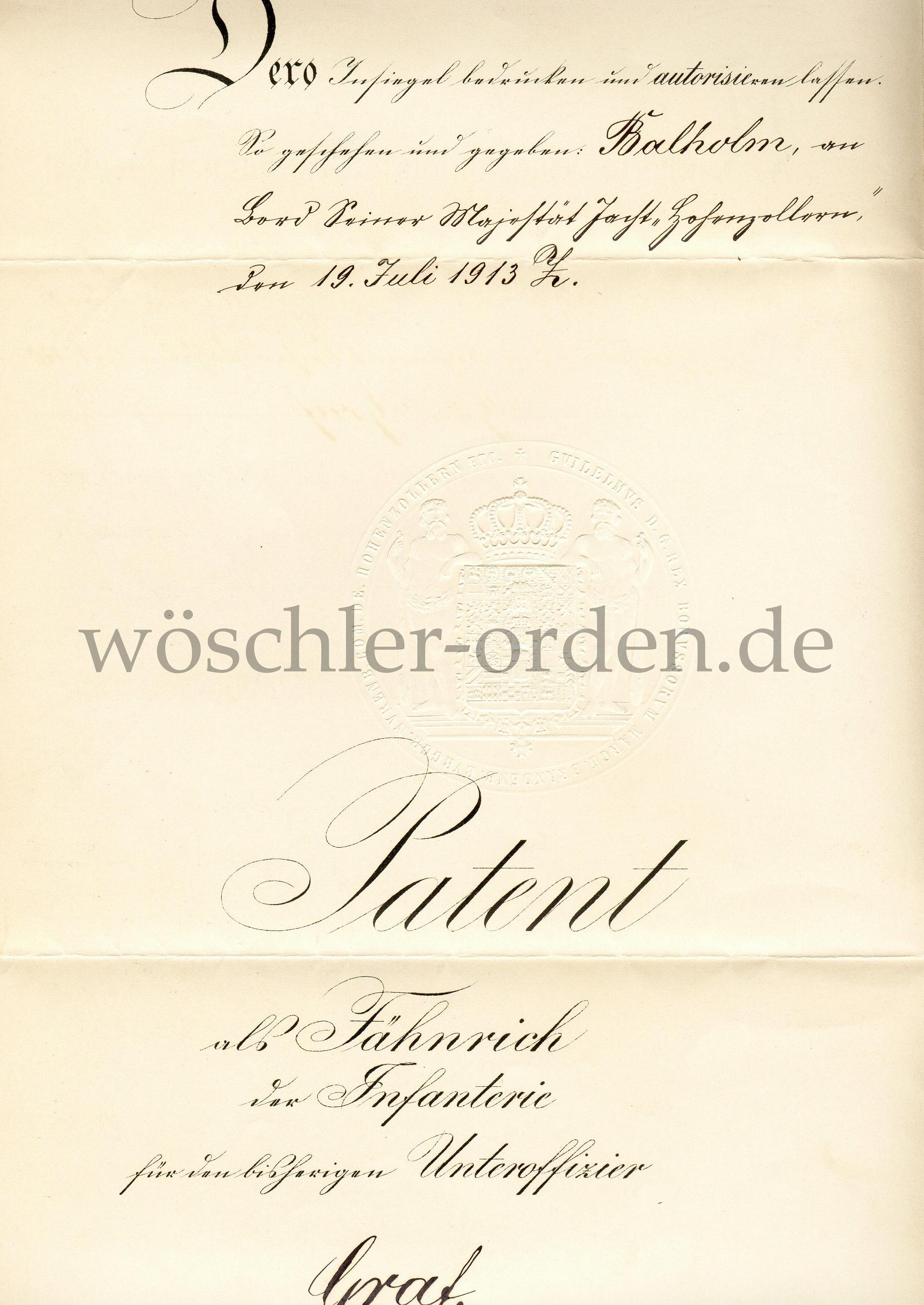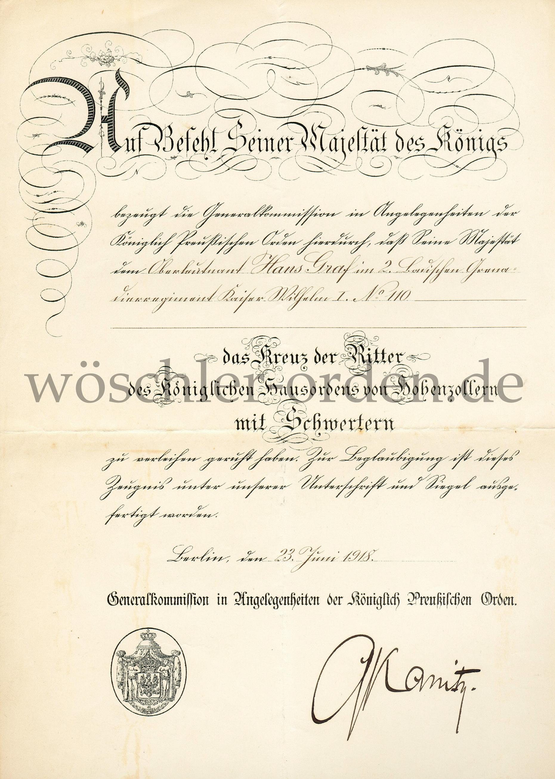 • Preußen, Königlicher Hausorden von Hohenzollern, Kreuz der Ritter mit Schwertern. Probemäßiges Exemplar der seit AKO vom 16. November 1916 gefertigten und verliehenen zweiten Ausgabe. Silber, mehrteilig gefertigt, vergoldet und emailliert, mit Herstellerpunzierung „W“ der Hofjuweliere Johann Wagner & Sohn, Berlin, sowie Feingehaltspunzierung „938“ an der Kante des unteren Kreuzarmes. Zusammen mit ungetragenem, etwa 32 cm langem Bandstück im mit dunkelgrünem Kaliko(?) bezogenen Verleihungsetui der späten Kriegsfertigung. Dazu die Urkunde für den „Oberleutnant Hans Graf im 2. Badischen Grenadierregiment Kaiser Wilhelm I. No. 110“, vollzogen Berlin, 23. Juni 1918, mit Originalunterschrift des Grafen Kanitz.