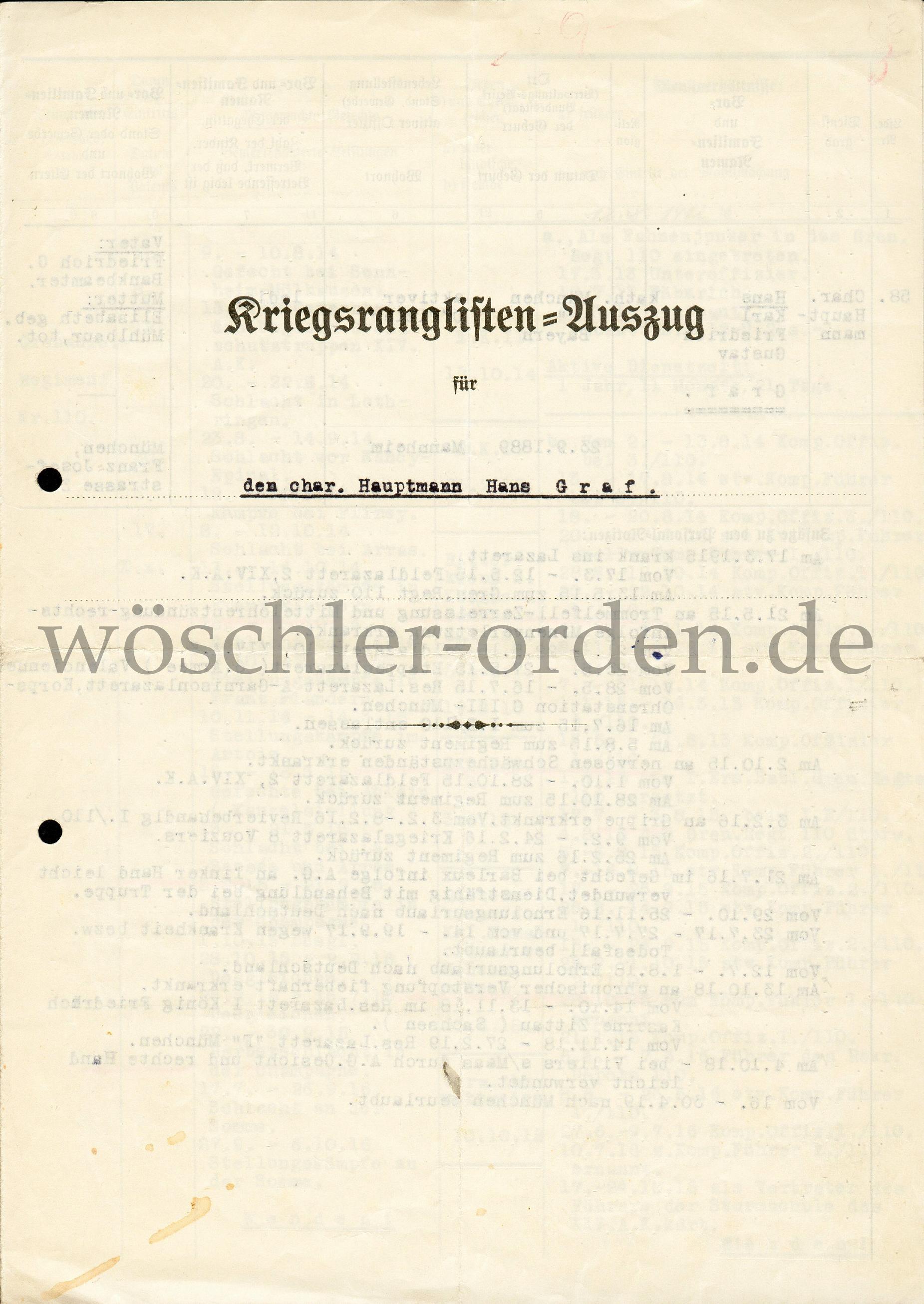 Beiliegend außerdem das „Patent als Fähnrich der Infanterie für den bisherigen Unteroffizier Graf“, ausgefertigt „Balholm, an Bord seiner Majestät Jacht „Hohenzollern“, den 19. Juli 1913, ein vierseitiger „Kriegsranglisten-Auszug“ der Reichsarchivzweigstelle vom 15.11.1935 sowie eine Photopostkarte aus der Zeit kurz nach dem Weltkrieg, die Graf in Uniform und mit seiner Gattin zeigt. Er trägt darauf die hier genannten Auszeichnungen, außerdem beide Klassen des Eisernen Kreuzes sowie das Verwundetenabzeichen in mattweiß.