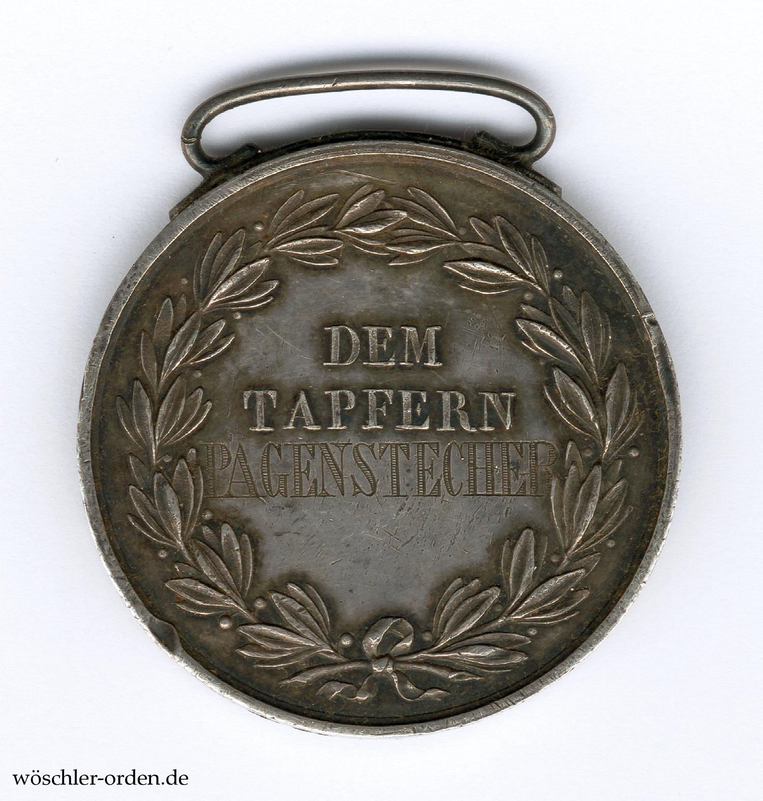 Exemplar der siebten, spätestens ab 1849 und bis 1872 verliehenen Ausgabe, hier in einem für den Deutsch-Französischen Krieg von 1870/71 verliehenen Exemplar. Silber geprägt, an mittels eines Silberblechstreifens angelötetem Bügel. Rückseitig schraffierte Namensgravur „PAGENSTECHER“. Dieser erhielt die Medaille als Vizefeldwebel im Leib-Grenadier-Regiment „in Anerkennung hervortretender Tapferkeit und ausgezeichneter Leistungen während des weiteren Verlaufs des gegenwärtigen Feldzugs“ am 4. März 1871. Für den Deutsch-Französischen Krieg sind insgesamt 574 Verleihungen der Silbernen Medaille nachweisbar, davon 51 an diesem 4. März 1871.