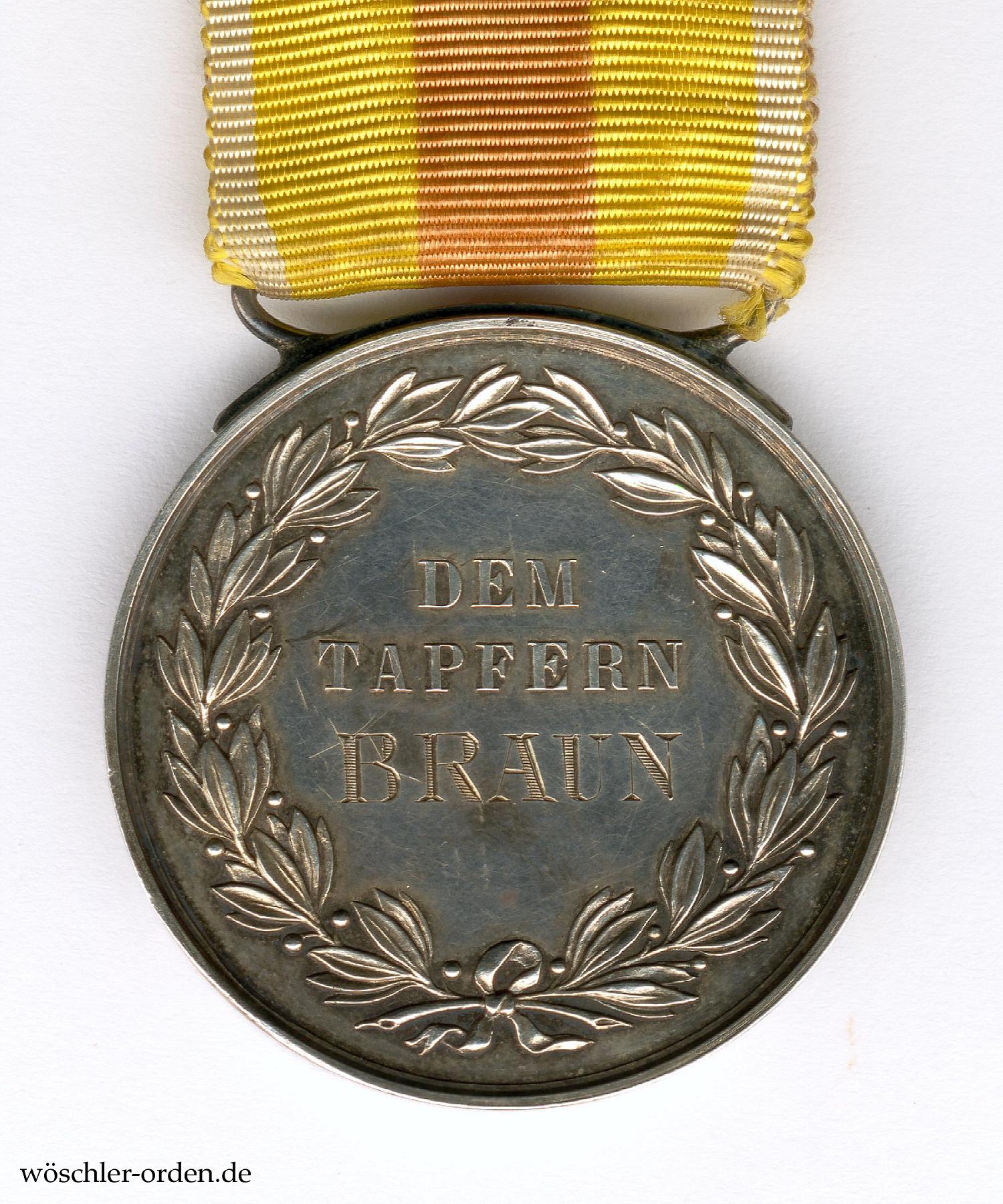 Exemplar der achten und letzten, während des Ersten Weltkrieges verliehenen Ausgabe. Silber geprägt, an mittels einem Silberblechstreifen angelötetem Bügel. Rückseitig schraffierte Namensgravur „BRAUN“. An verblasstem Bandstück.