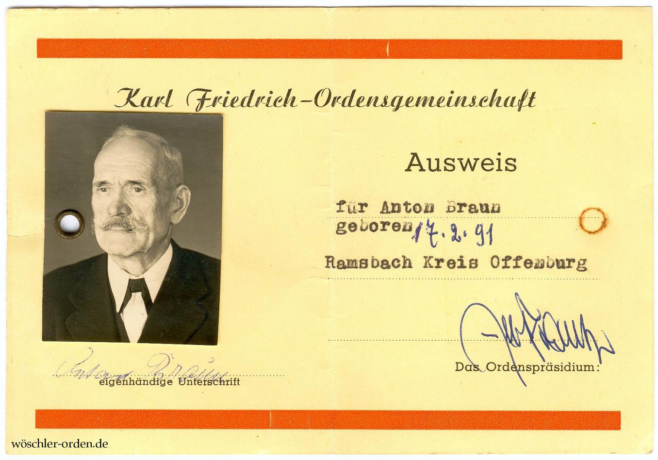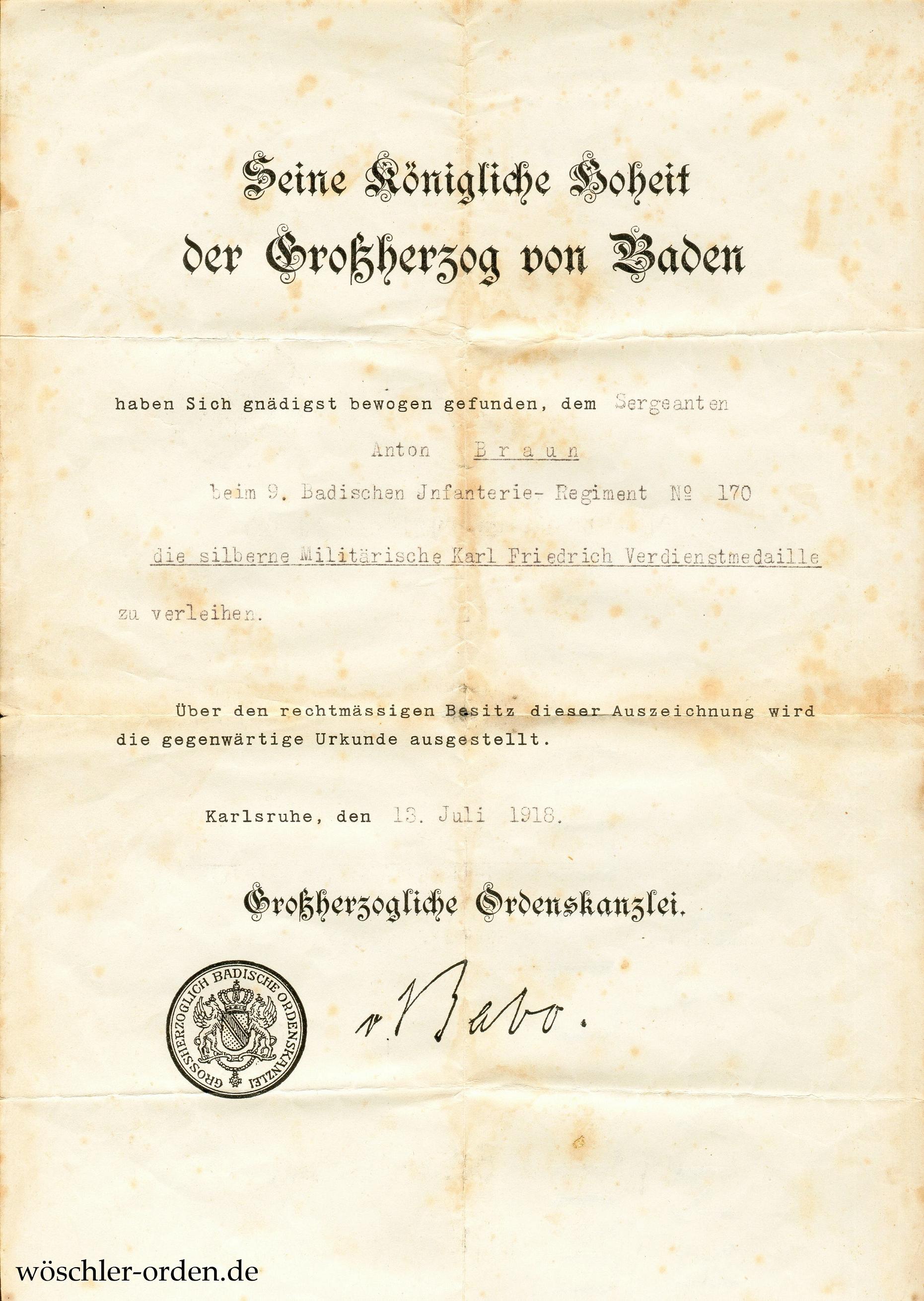 Dazu die Verleihungsurkunde für den „Sergeanten Anton Braun beim 9. Badischen Jnfanterie- Regiment No 170“ vom 13. Juli 1918 sowie dessen mit einem Lichtbild versehenen Mitgliedsausweis der „Karl Friedrich-Ordensgemeinschaft“, mutmaßlich aus den 1950er-Jahren. Desweiteren seine weiteren, von einer großen Ordensschnalle abgetrennten Auszeichnungen: Eisernes Kreuz 1914 II. Klasse, Zweitstück der badischen Silbernen Verdienstmedaille sowie die Kriegsdenkmünze 1914/18 des Kyffhäuser-Bundes, teils mit Bändern bzw. mit Bandresten.