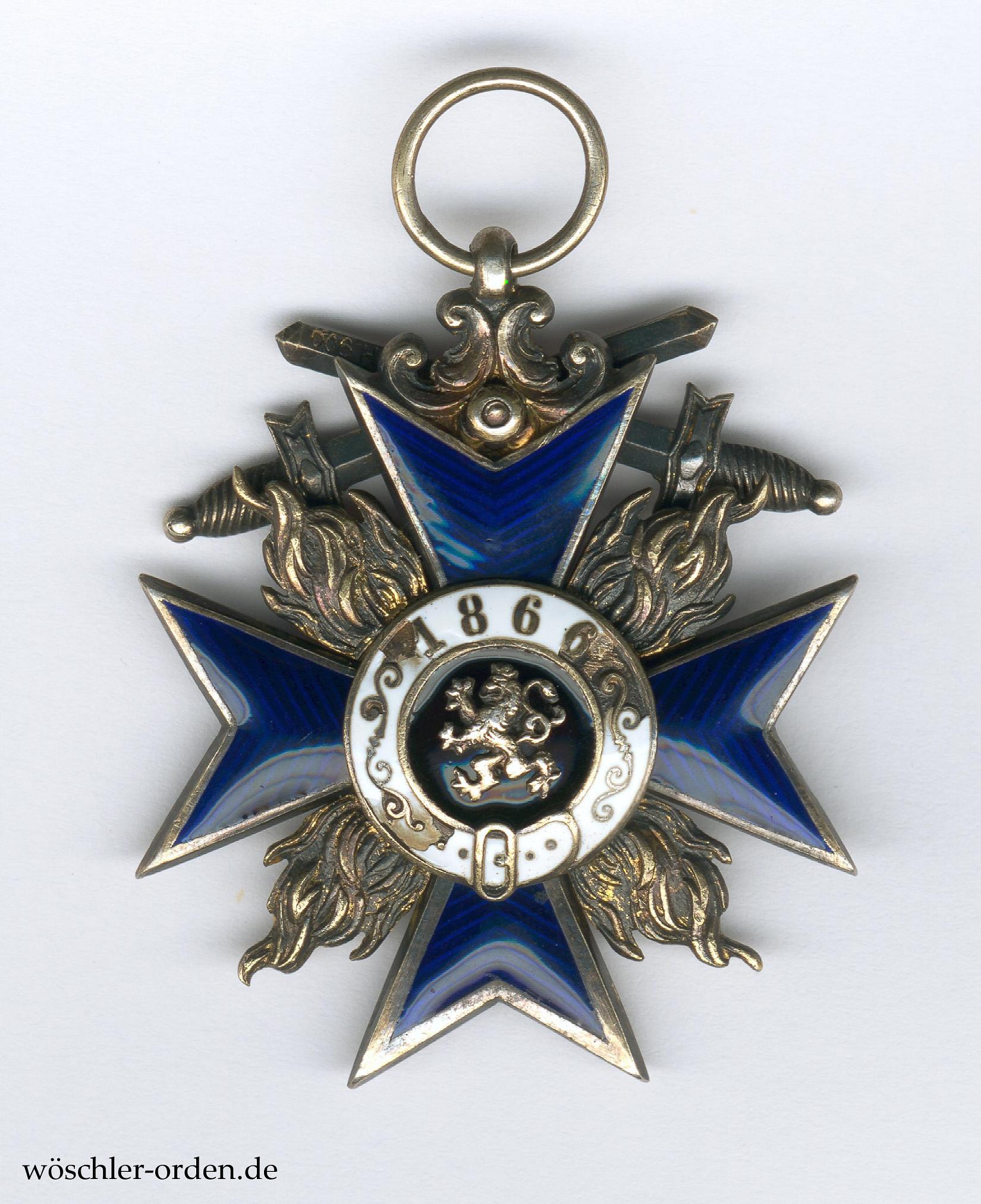 Exemplar der zweiten und letzten, ab Anfang 1917 gefertigten Ausgabe aus der Zeit des zweiten Modells des Ordens. Silber vergoldet und emailliert, auf der Agraffe vorderseitig Herstellermarkierung „G.H.“ der Firma Gebrüder Hemmerle, München, mit Feingehaltsmarke „950“. Eine Schwertklinge mit gravierter(?) Hersteller- und Feingehaltsangabe „GH 900“.