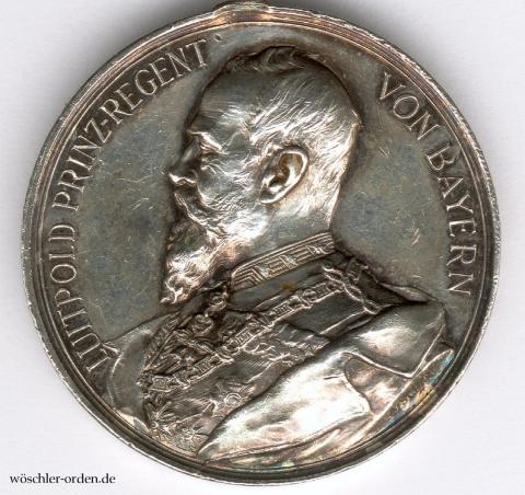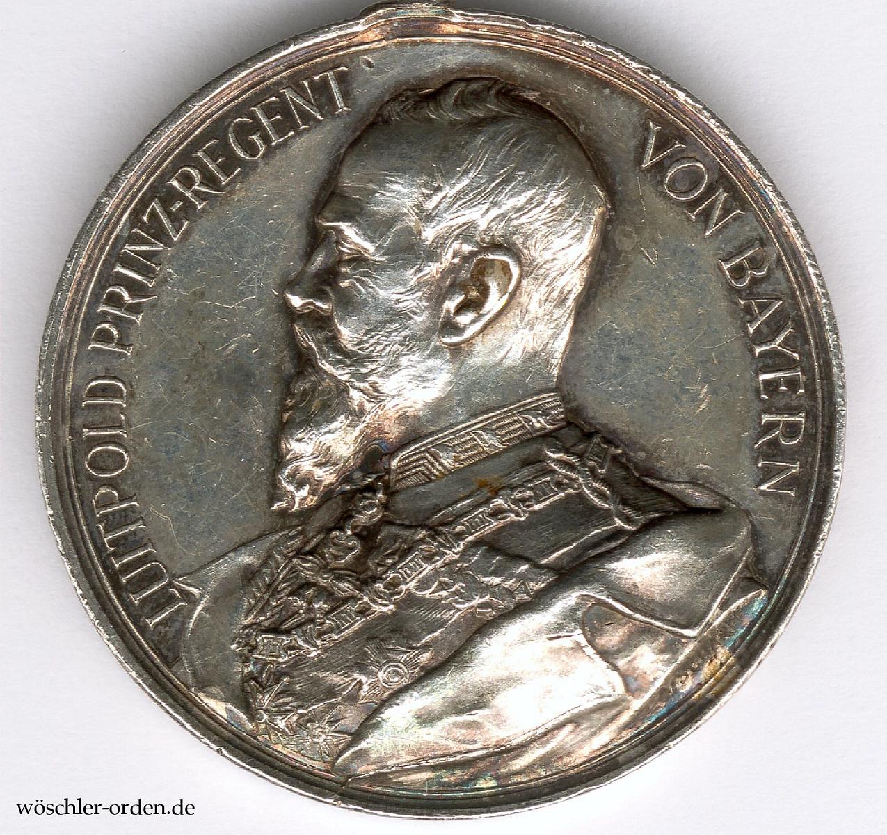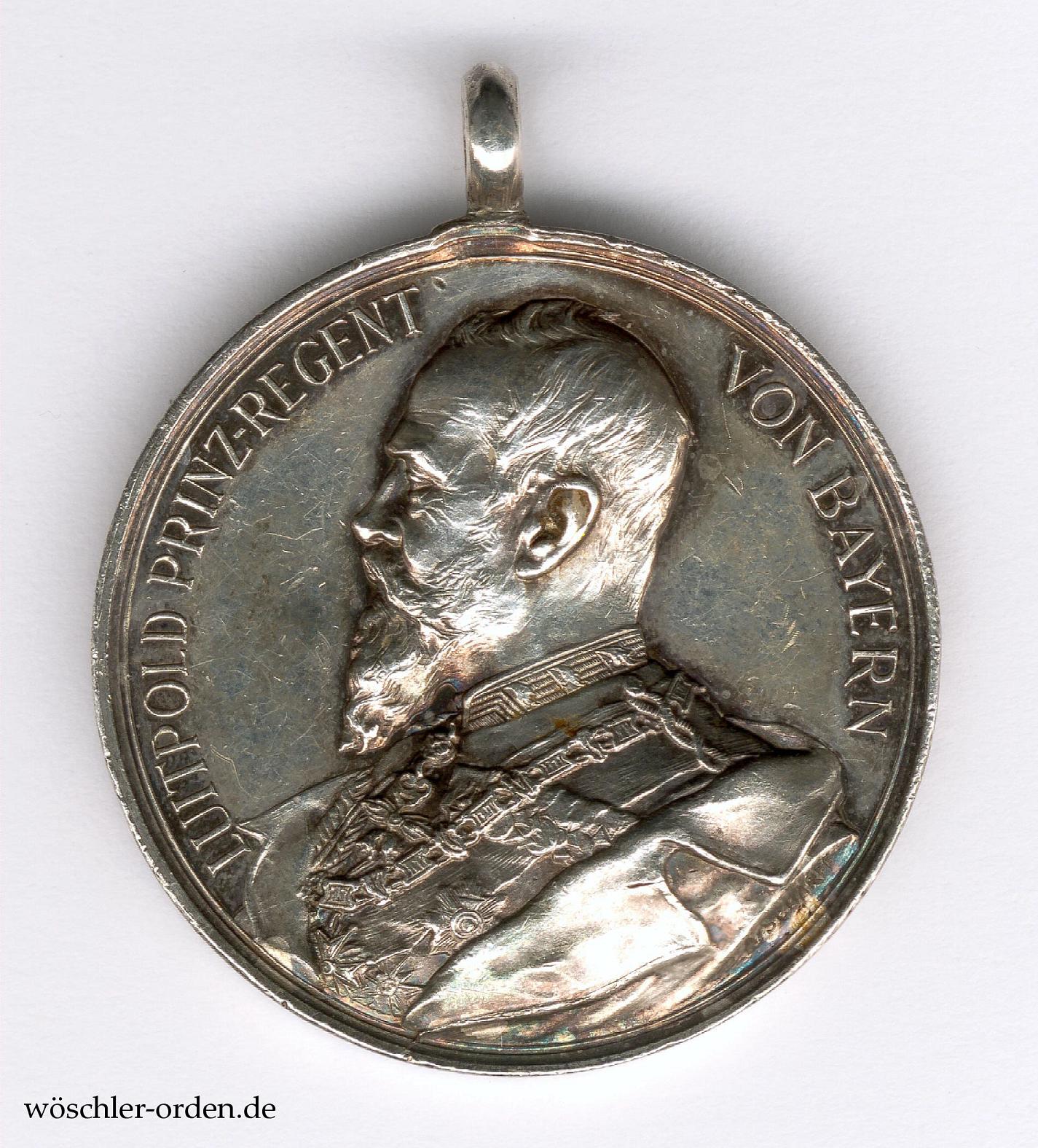 Exemplar des ersten, eigentlich monarchistischen, aber bis 1931(!) verliehenen Modells mit dem Portrait des Prinzregenten Luitpold in der älteren, mutmaßlich tatsächlich aus der Zeit der Monarchie stammenden Fertigung ohne Herstellerangabe auf dem Rand. Silber geprägt, an angelöteter, stabiler Ringöse und, wie verausgabt, ohne einen Bandring.