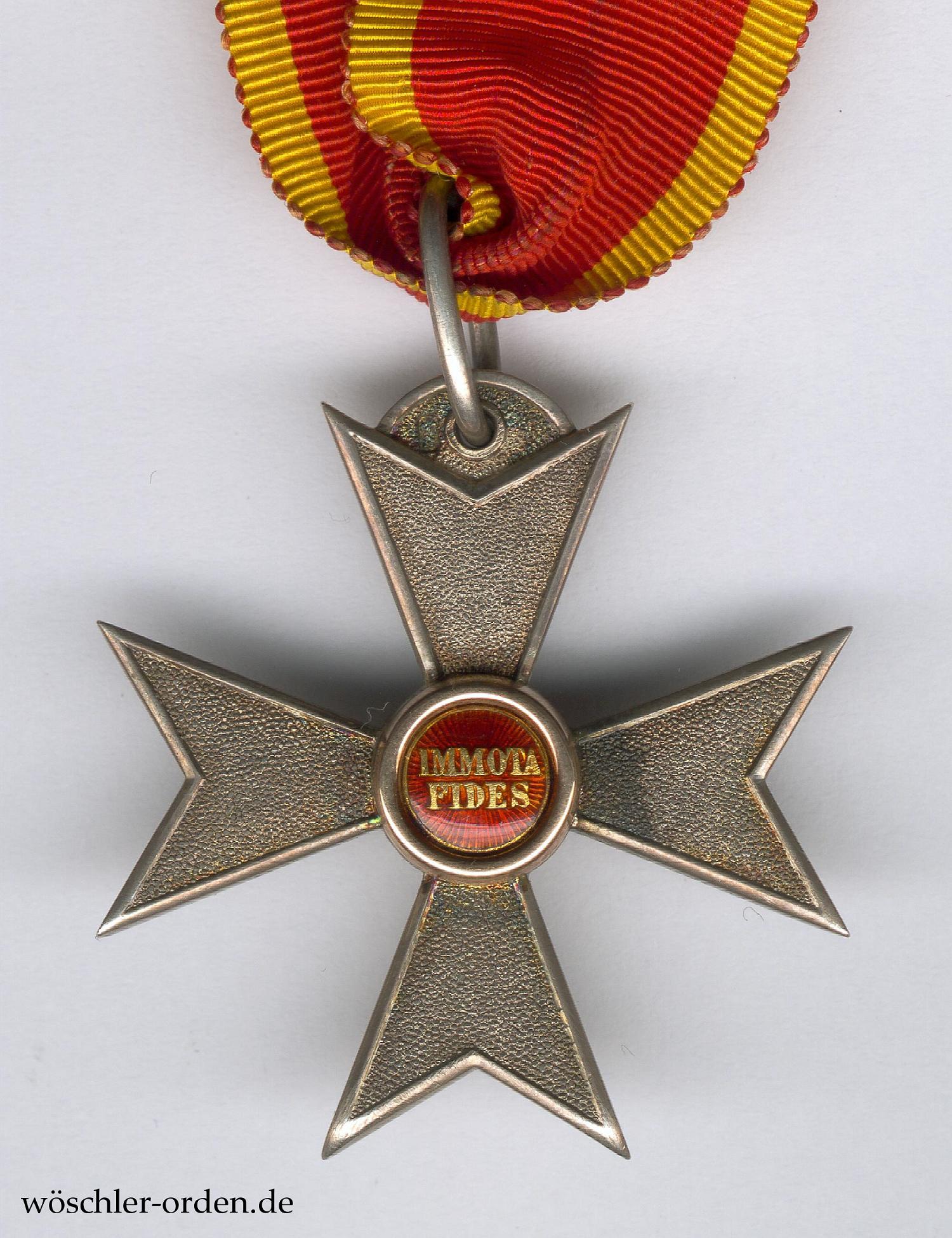 Exemplar der ersten, lediglich 1908/09 gelieferten Ausgabe in einer Fertigung der Firma C. F. Zimmermann, Pforzheim, für die Firma Carl Siebrecht. Silber, einteilig massiv geprägt, die Medaillons mehrteilig in Gold und Emaille. In der Agraffe entsprechende Hersteller- bzw. eigentlich Lieferantenpunzierung „S“ unter einem Stern. Siebrecht lieferte insgesamt nur 91 Kreuze IV. Klasse mit echt goldenen Medaillons, womit es sich um die seltenste der drei gelieferten Ausgaben handelt.