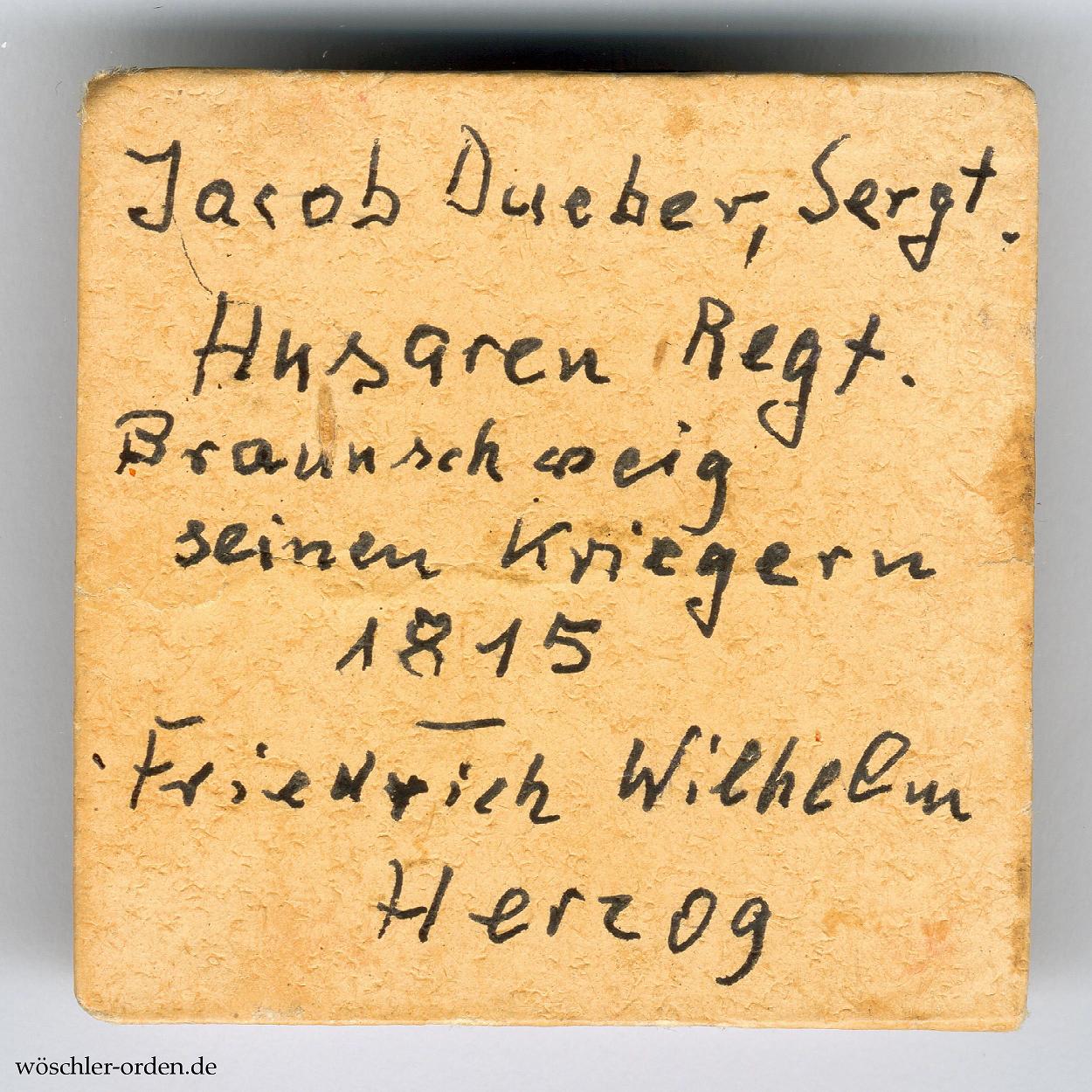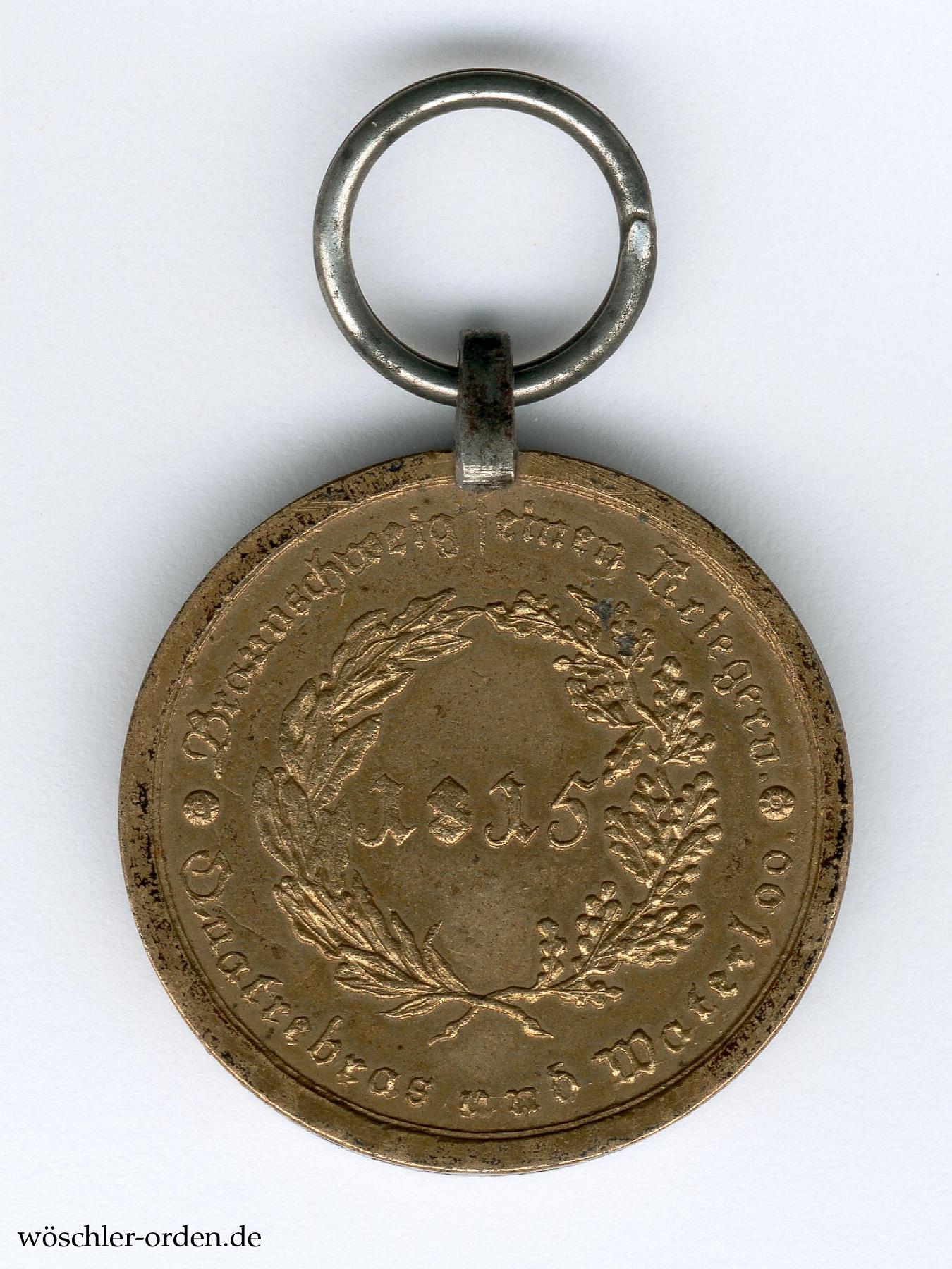 Die Waterloo-Medaille wurde durch Prinzregent Georg in vormundschaftlicher Regierung für den noch minderjährigen Herzog Carl am 11. Juli 1818 „für Alle, welche im Herzoglich Braunschweigischen Truppencorps an dem Feldzuge des Jahres 1815 teilgenommen“ hatten, gestiftet. Auf dem Rand tragen alle offiziell verausgabten Medaillen Name, Rang und Einheit des Empfängers, bezogen auf den Zeitpunkt der Schlacht bei Waterloo. Die Fachliteratur unterscheidet Prägevarianten, die jedoch lediglich auf verschiedene Prägestempel zurückzuführen sind und keine tiefere Bedeutung haben.