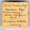 Geschützbronze geprägt, an eiserner Tragezarge mit mutmaßlich zugehörigem, ebenfalls eisernem Sprungring. Der Rand mit eingeschlagener Widmung „IAC . DUEBER . SERGT . HUS . RGT .“, wonach es sich um die Medaille des Sergeanten Jacob Dueber vom Husaren-Regiment handelt.