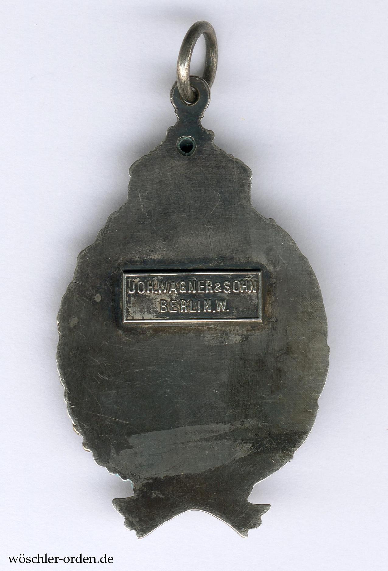 Reduktion, etwa 52 mm x 30 mm, aus Fertigung der Hofjuweliere Johann Wagner & Sohn, Berlin, zum Tragen als Anhänger. Silber hohlgeprägt und verbödet, mit Lüftungsloch und aufgelötetem Plättchen mit der zweizeiligen Herstellerangabe „JOH.WAGNER & SOHN / BERLIN.W.“ auf der glatten Rückseite.