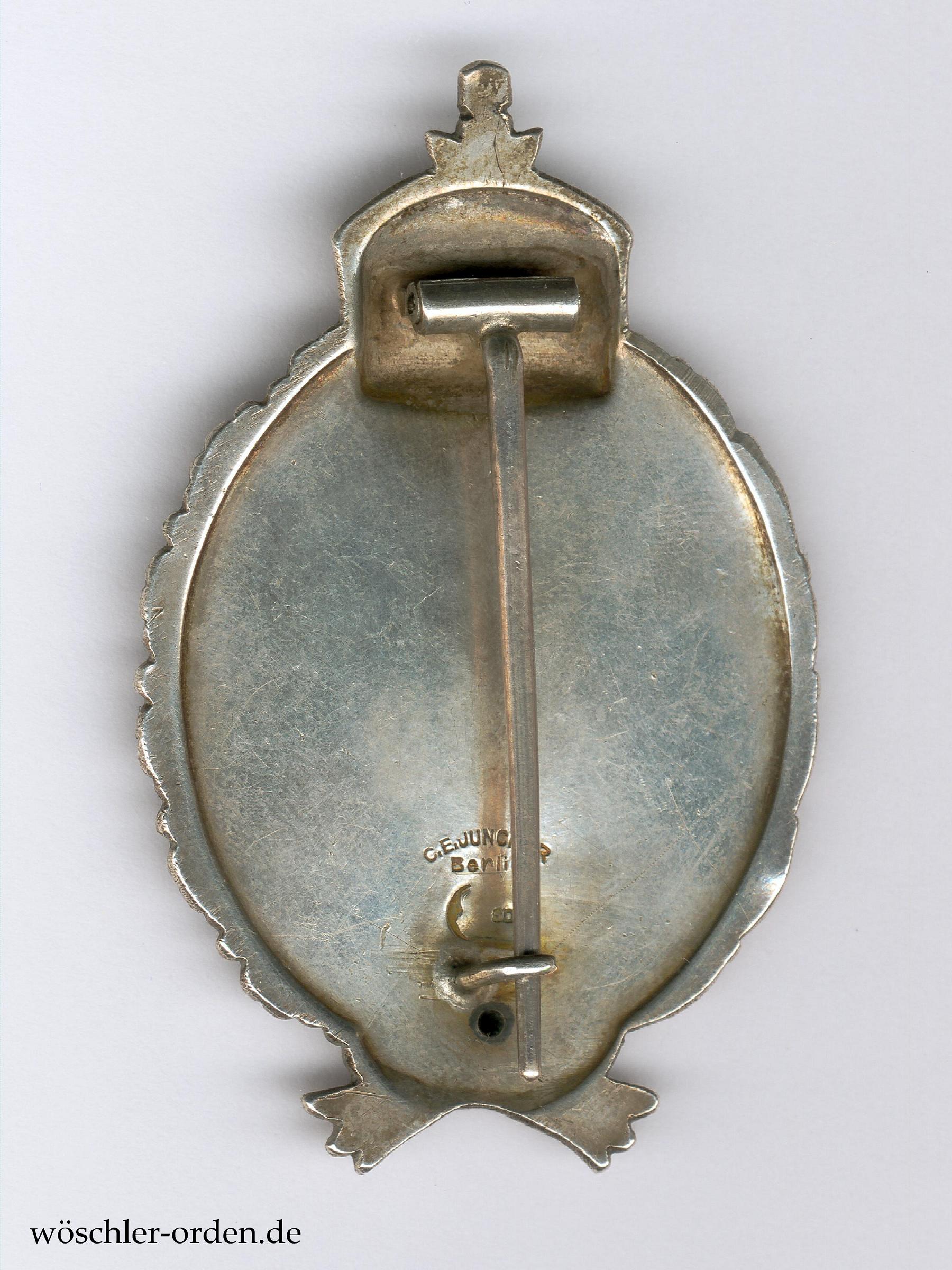Silber, hohlgeprägt und verbödet, an Rundnadel. Die Krone durchbrochen gearbeitet. Rückseitig Herstellerpunzierung „C. E. Juncker / Berlin“, darunter Silberpunzen „[Halbmond]“ und „800“.