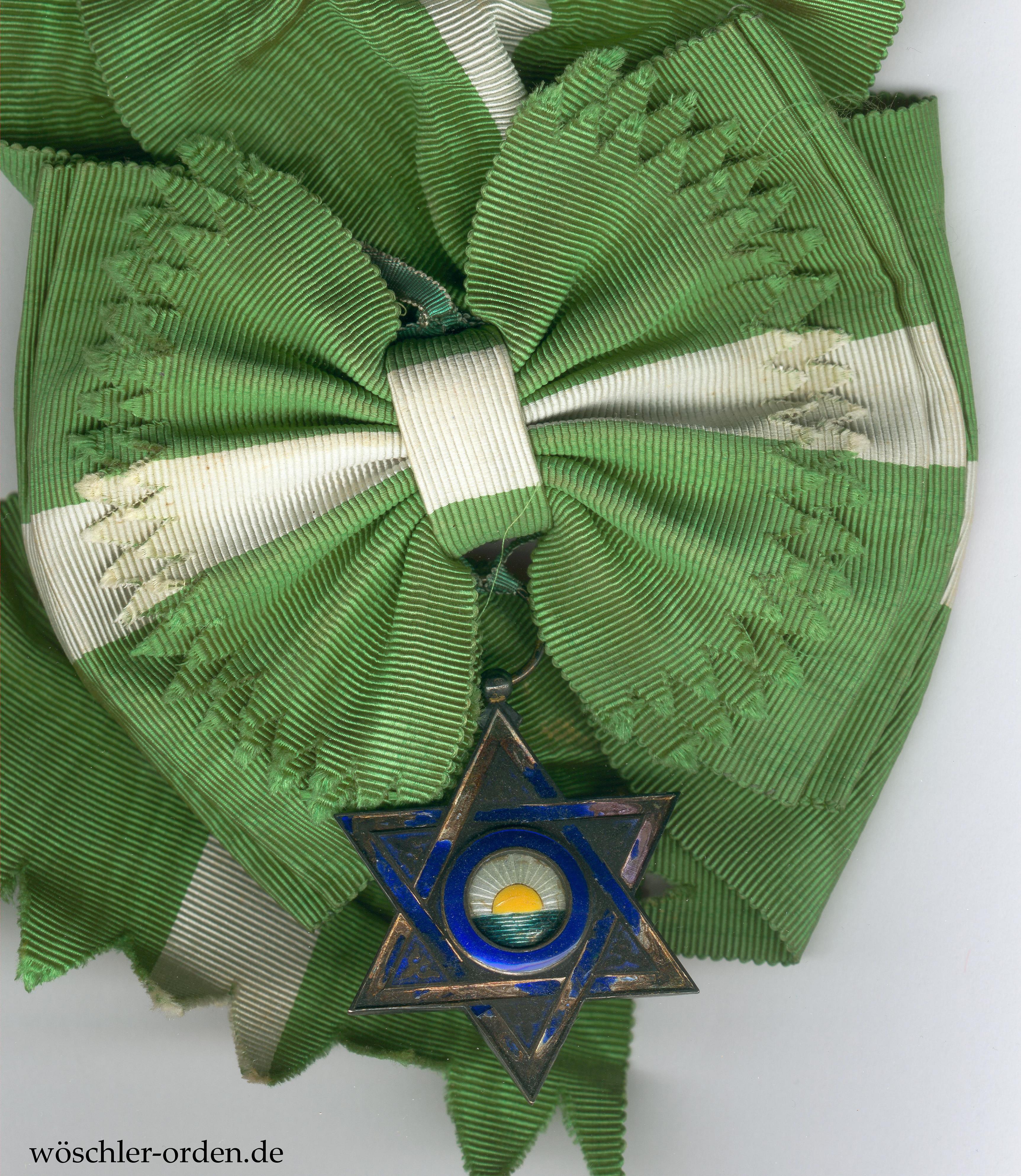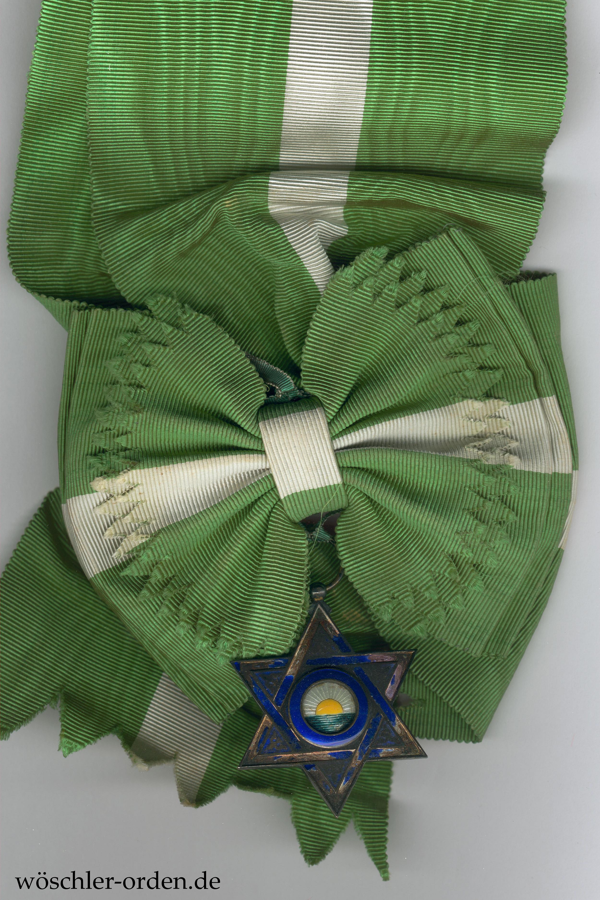 Marokko (als spanisches „Protektorat“), Mehdauia-Orden, Großkreuz-Set, bestehend aus Großkreuz-Kleinod, wohl silber-vergoldet und emailliert, an Schärpe und zugehörigem Bruststern, ebenfalls silber-vergoldet und emailliert. Rückseitig Herstellermedaillon E. Gardino succ. Cravanzola, Roma, um Wappen. Kleinod wie Bruststern mit starken Schäden der blauen Emaille!