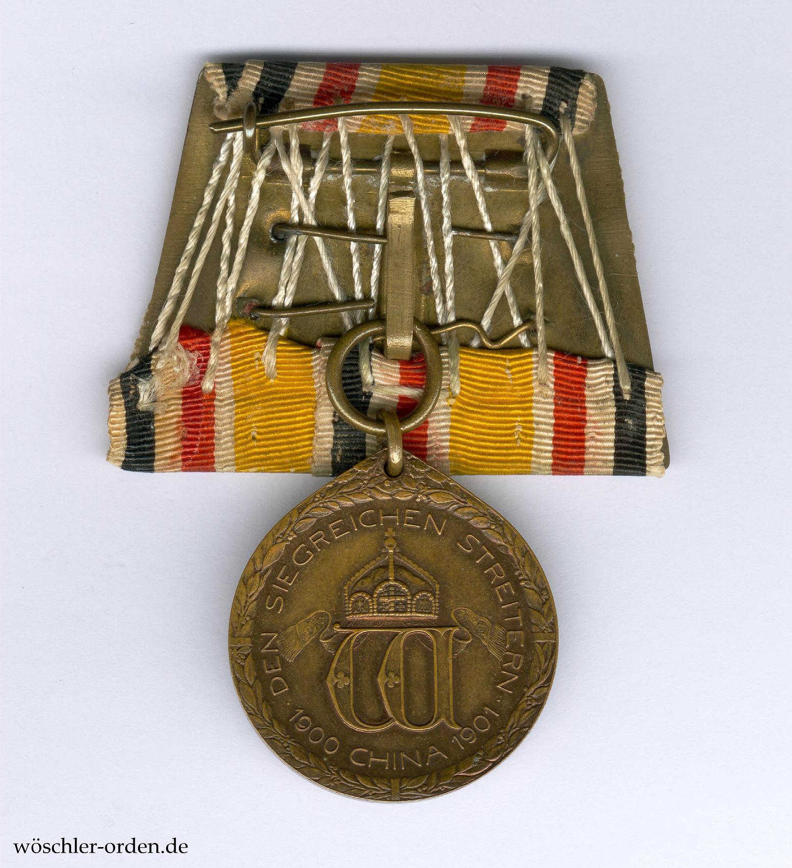 Die China-Denkmünze wurde am 10. Mai 1901 durch Kaiser Wilhelm II. gestiftet, in Bronze für alle Teilnehmer an den kriegerischen Ereignissen in Ostasien, nämlich der Bekämpfung des Boxeraufstandes, sowie auch für die bei der Kranken- und Verwundetenpflege in den Kriegsgebieten tätig gewesenen Personen beider Geschlechter. Die Denkmünze aus Stahl erhielten alle Personen, welche an den Vorbereitungen zur Aufstellung und Entsendung der deutschen Streitkräfte beteiligt waren, ebenso die Besatzungen der Transportschiffe deutscher Reedereien von Truppen und Kriegsbedarf nach und von Ostasien. Der Entwurf stammt von Kaiser Wilhelm II. selbst, die Ausführung der Medaille aber von Professor Walter Schott, Berlin. Geprägt wurden die Medaillen bei Mayer & Wilhelm, Stuttgart.