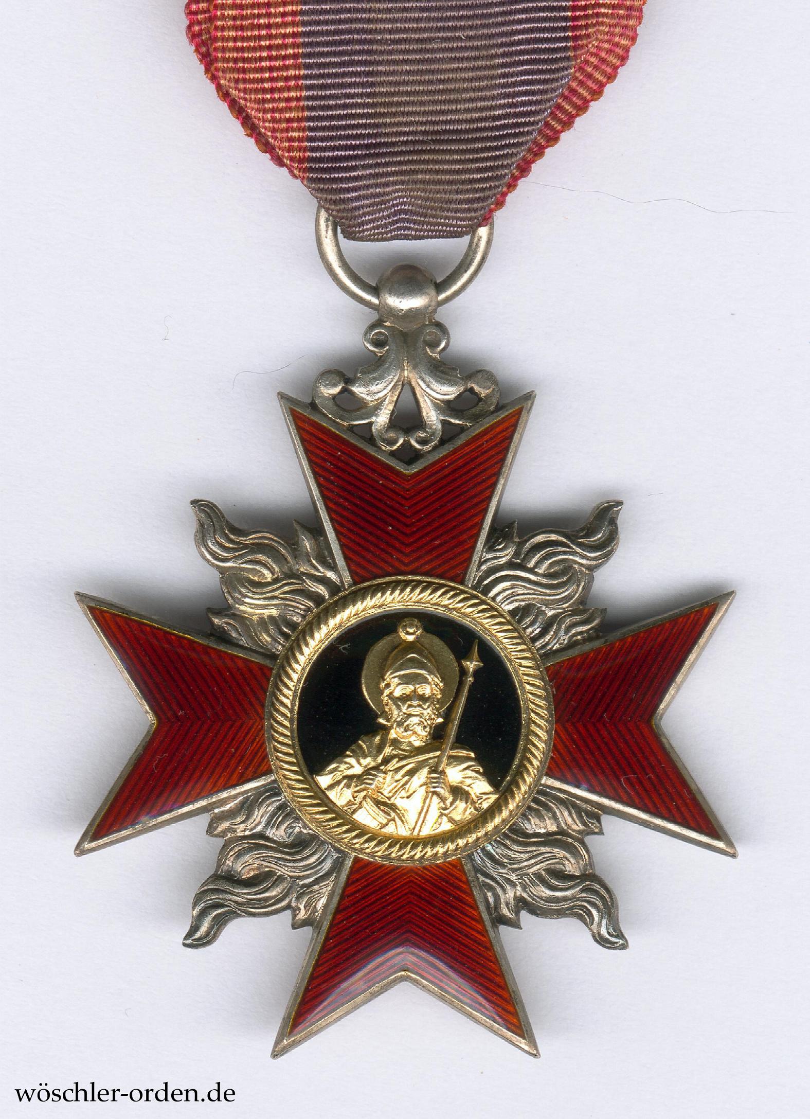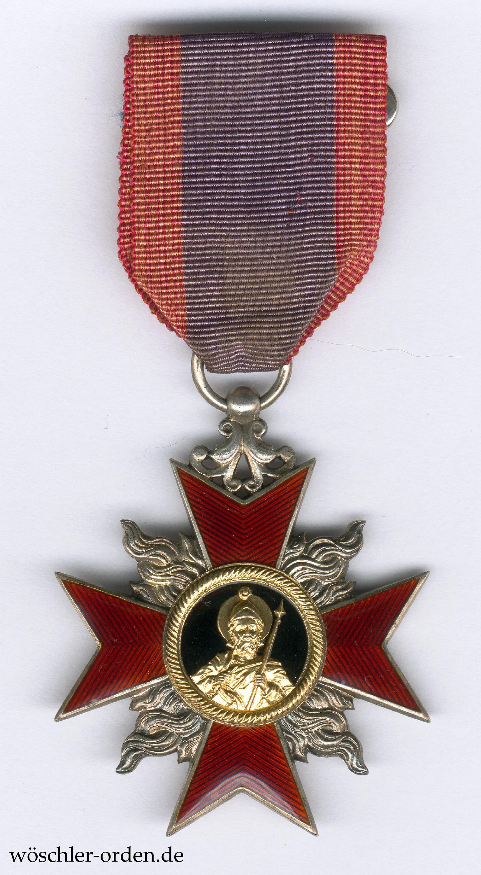 Silber, mehrteilig gefertigt, die Medaillons vergoldet. Die Kreuzarme transluzid rot, der Hintergrund des Medaillons der Vorderseite schwarz emailliert. An Zieragraffe mit geschlossenem Bandring, dieser mit etwas unleserlicher Punzierung „800“ oder „900“ für den Silber-Feingehalt. Ohne eine Herstellerangabe, jedoch wohl von der Hofkunstanstalt Jacob Leser, München, stammend; die Grundgestaltung wurde vom bayerischen Militär-Verdienstorden übernommen, den diese ebenfalls gefertigt hatte.