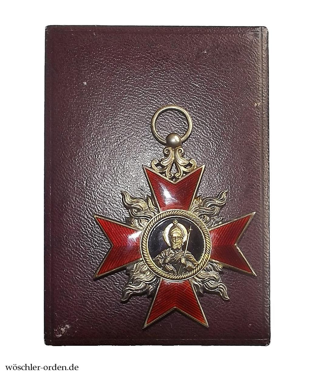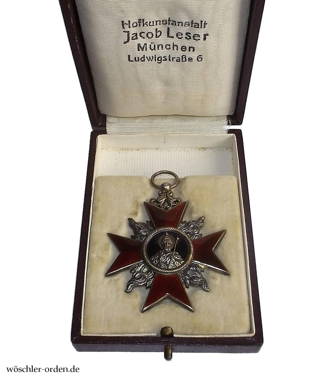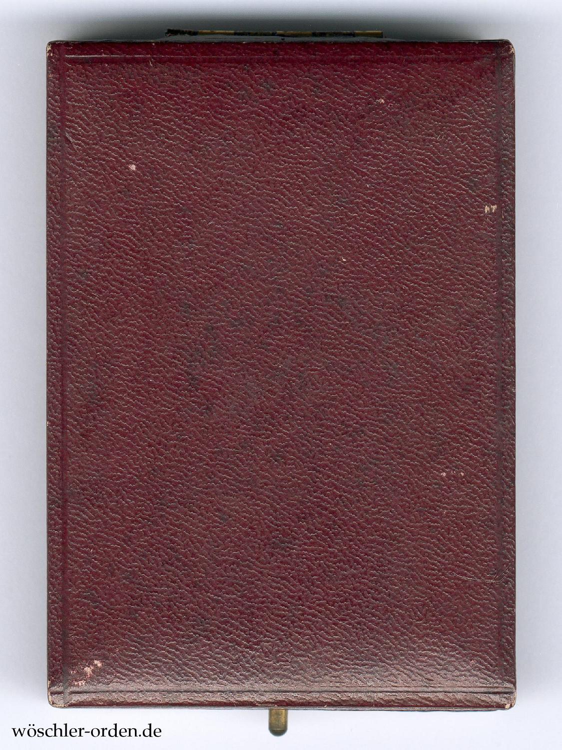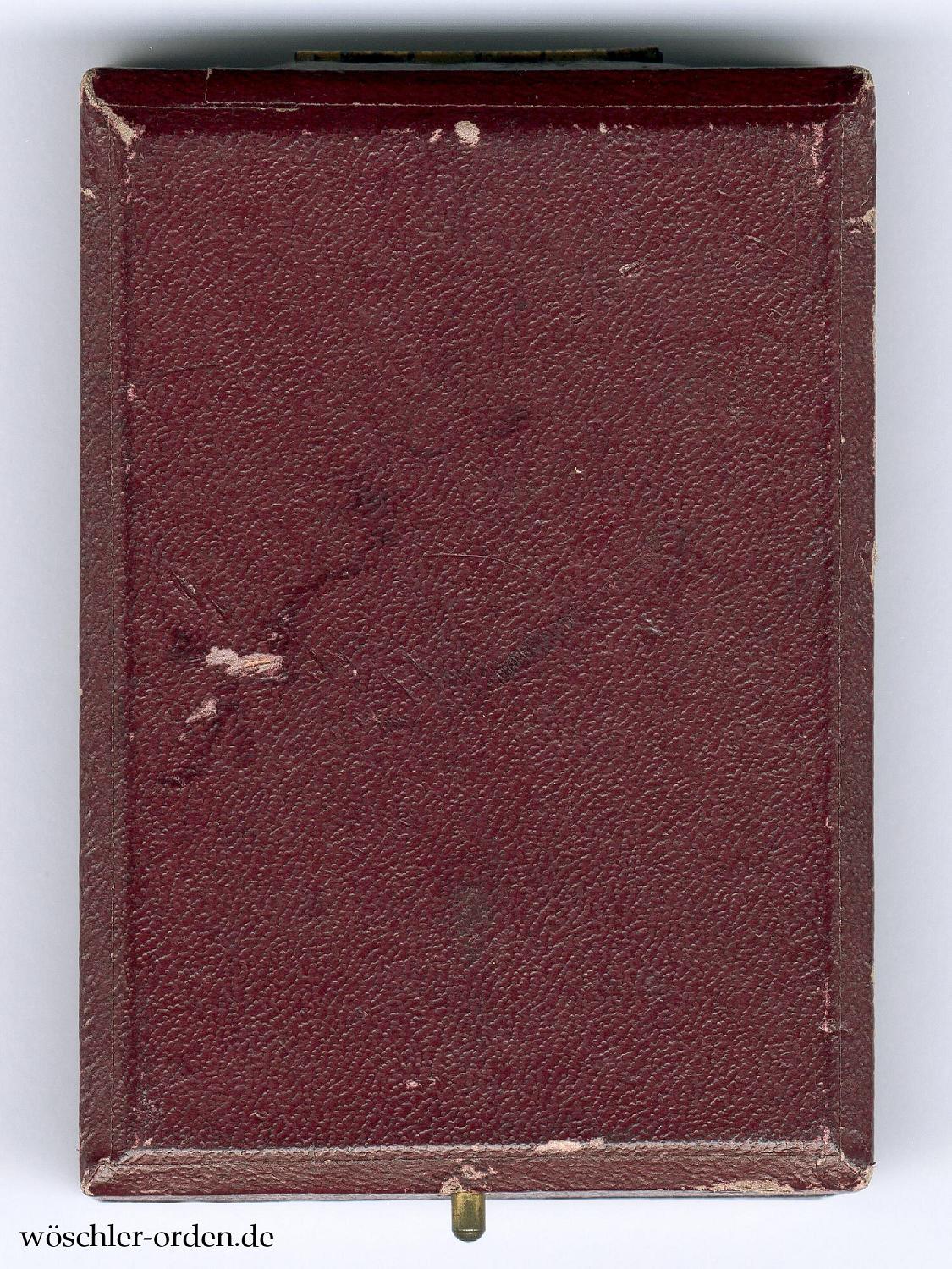 Dazu das schmucklose Verleihungsetui, außen weinrot bezogen, innen mit beiger Samteinlage mit Aussparung für das Kreuz. Der Deckel innen mit einer Verkleidung aus altweißer Kunstseide(?), diese mit vierzeiligem Signet der „Hofkunstanstalt / Jacob Leser / München / Ludwigstraße 6“ versehen.