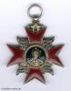 Silber, mehrteilig gefertigt, die Medaillons vergoldet. Die Kreuzarme transluzid rot, der Hintergrund des Medaillons der Vorderseite schwarz emailliert. An Zieragraffe mit geschlossenem Bandring, dieser mit etwas unleserlicher Silberpunzierung „900“.