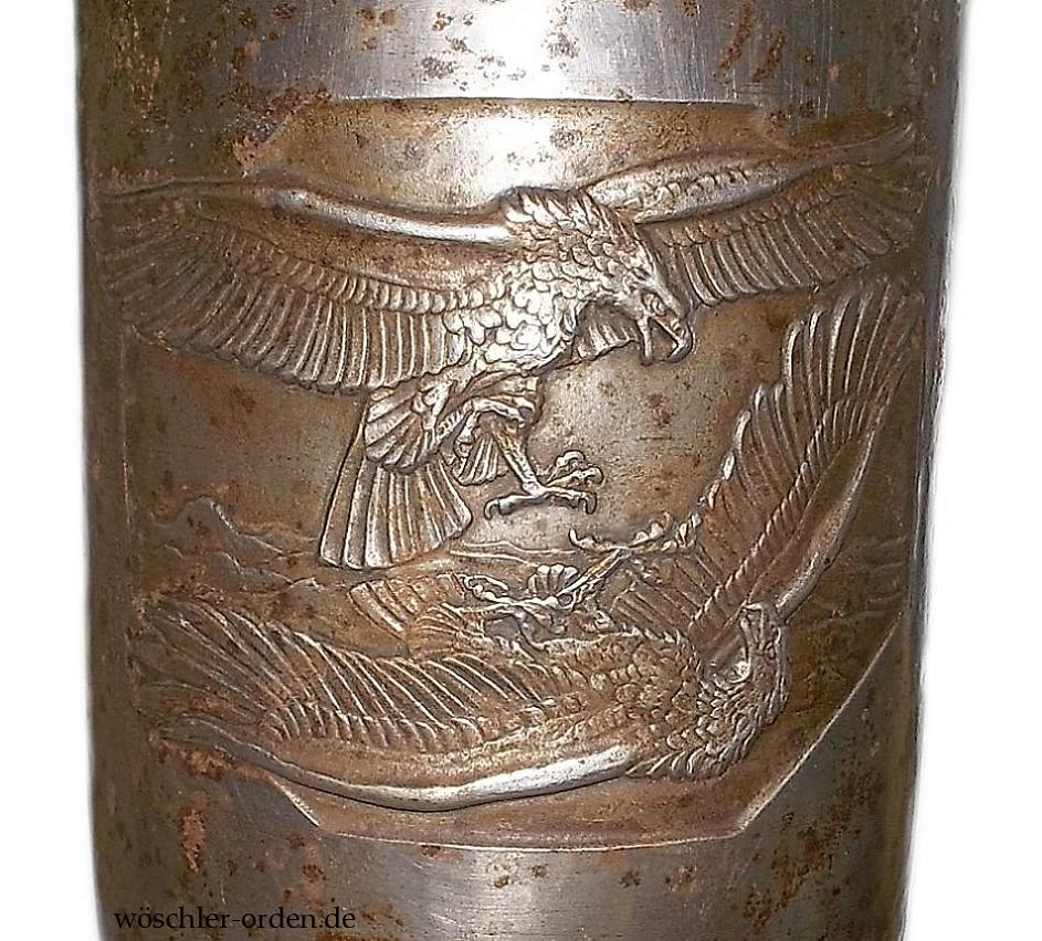 Exemplar der zweiten, wohl erst gegen Kriegsende 1918 gefertigten Ausgabe. Eisen geprägt und verlötet, die Fläche gehämmert. Vorderseitig mit dem eingeprägten Motiv der zwei sich bekämpfenden Adler. Darunter angelöteter Sockel mit Dedikationsinschrift „Dem Sieger im Luftkampfe“ auf floralem Jugendstildekor, auf vier angelöteten Kugelfüßen ruhend. Im Boden das kleine, wohl eingeschlagene Signet „CHEF DES FELDFLUGWESENS“ mit dem preußischen Adler.