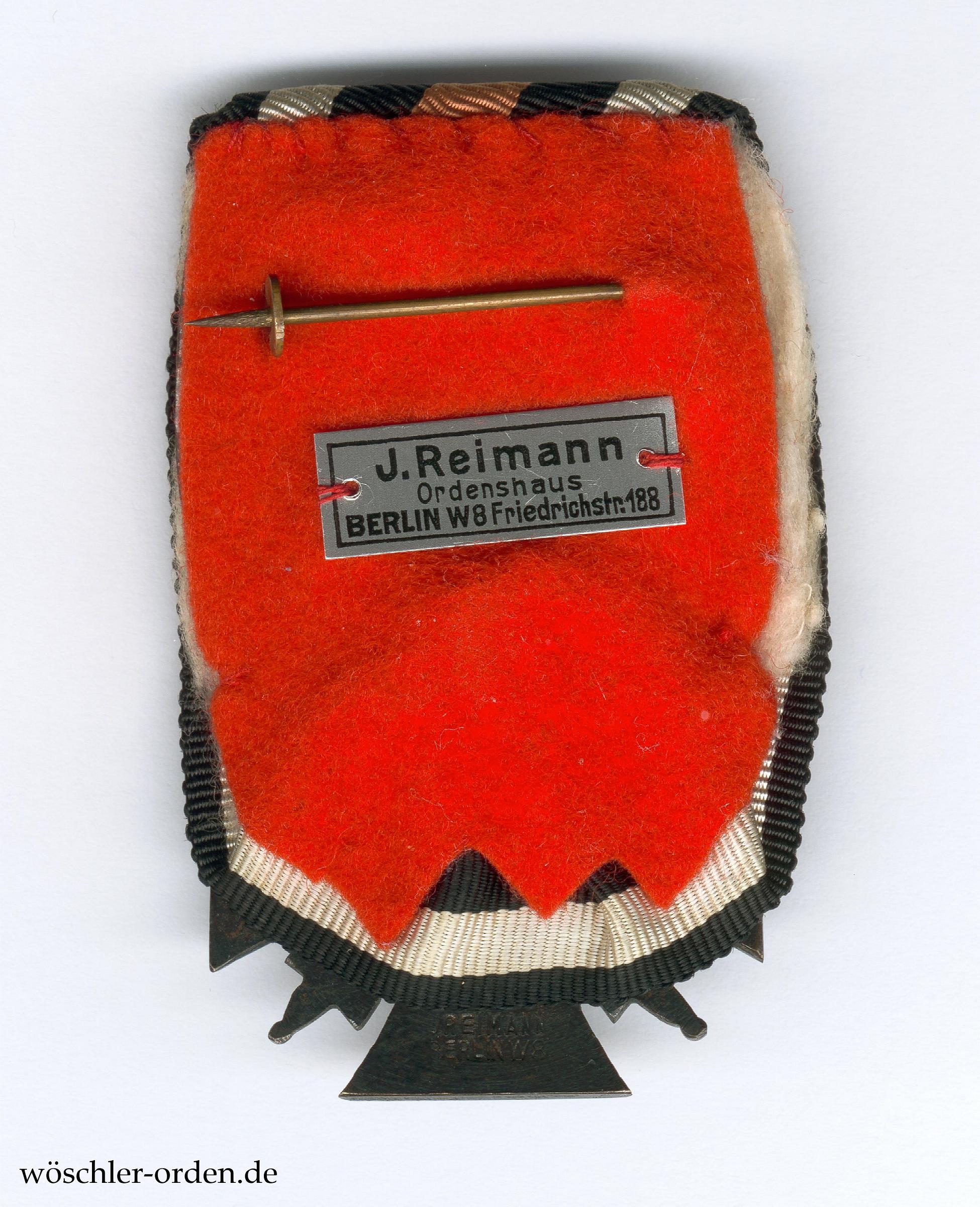 An 1er Ordensschnalle mit kraus vernähtem Band, rückseitig rote Stoffabdeckung mit metallenem Herstelleretikett ebenfalls vom Ordenshaus J. Reimann in Berlin.