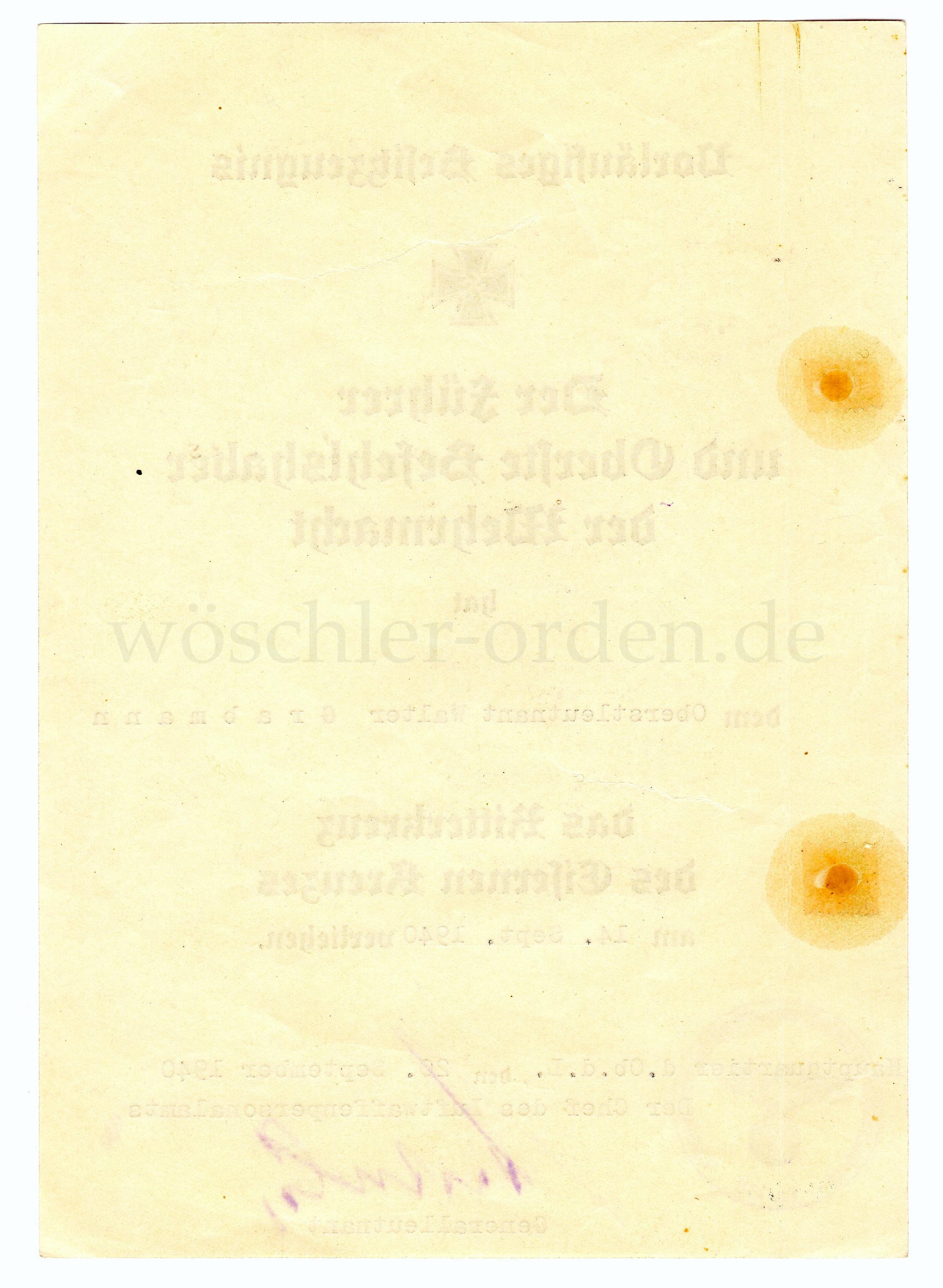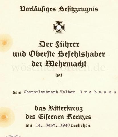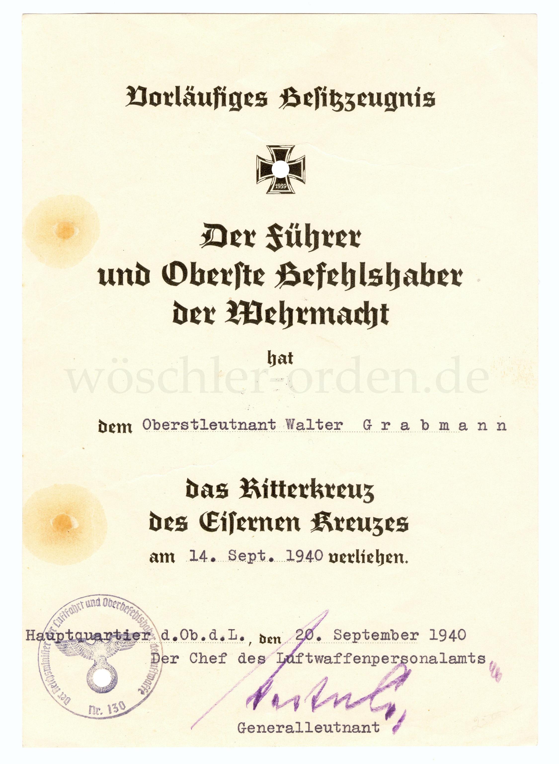 Vorläufiges Besitzzeugnis über die Verleihung an den damaligen Oberstleutnant und späteren Generalmajor der Luftwaffe Walter Grabmann (1905–1992) vom 14. September 1940, ausgestellt am 20. September 1940 im Hauptquartier des Oberbefehlshabers der Luftwaffe durch den Chef des Luftwaffenpersonalamts, den Generalleutnant und späteren General der Flieger Gustav Kastner-Kirdorf (1881–1945), mit dessen eigenhändiger Unterschrift.