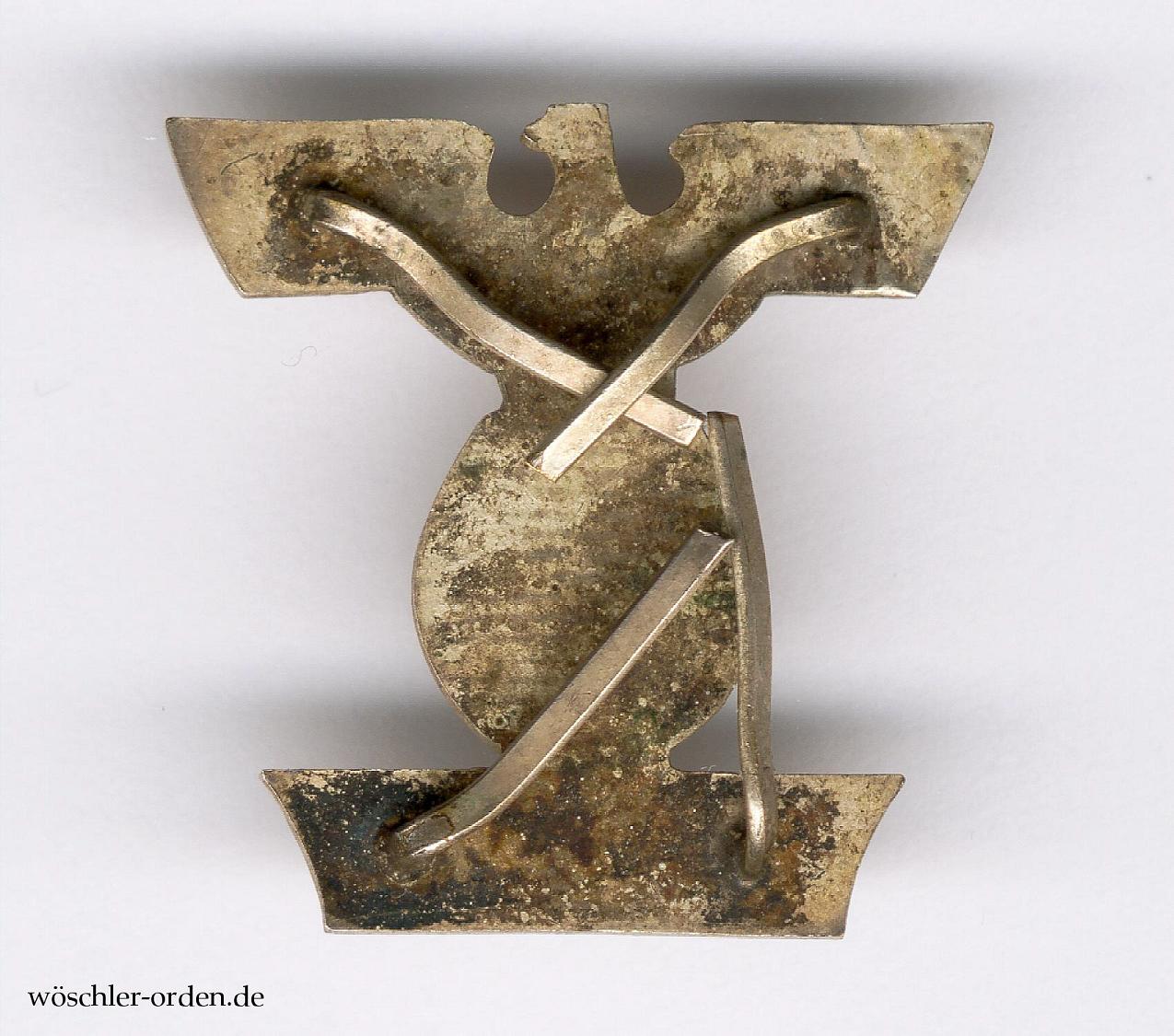 Exemplar des ersten, wohl bereits im Frühling oder Sommer 1939 gefertigten Modells in einer wohl besonders frühen Fertigung, auf der die Flügel des Adlers noch ohne „Adern“ dargestellt werden. Tombak geprägt und versilbert, rückseitig vier dezentral angelötete Splinte aus flachem Draht.