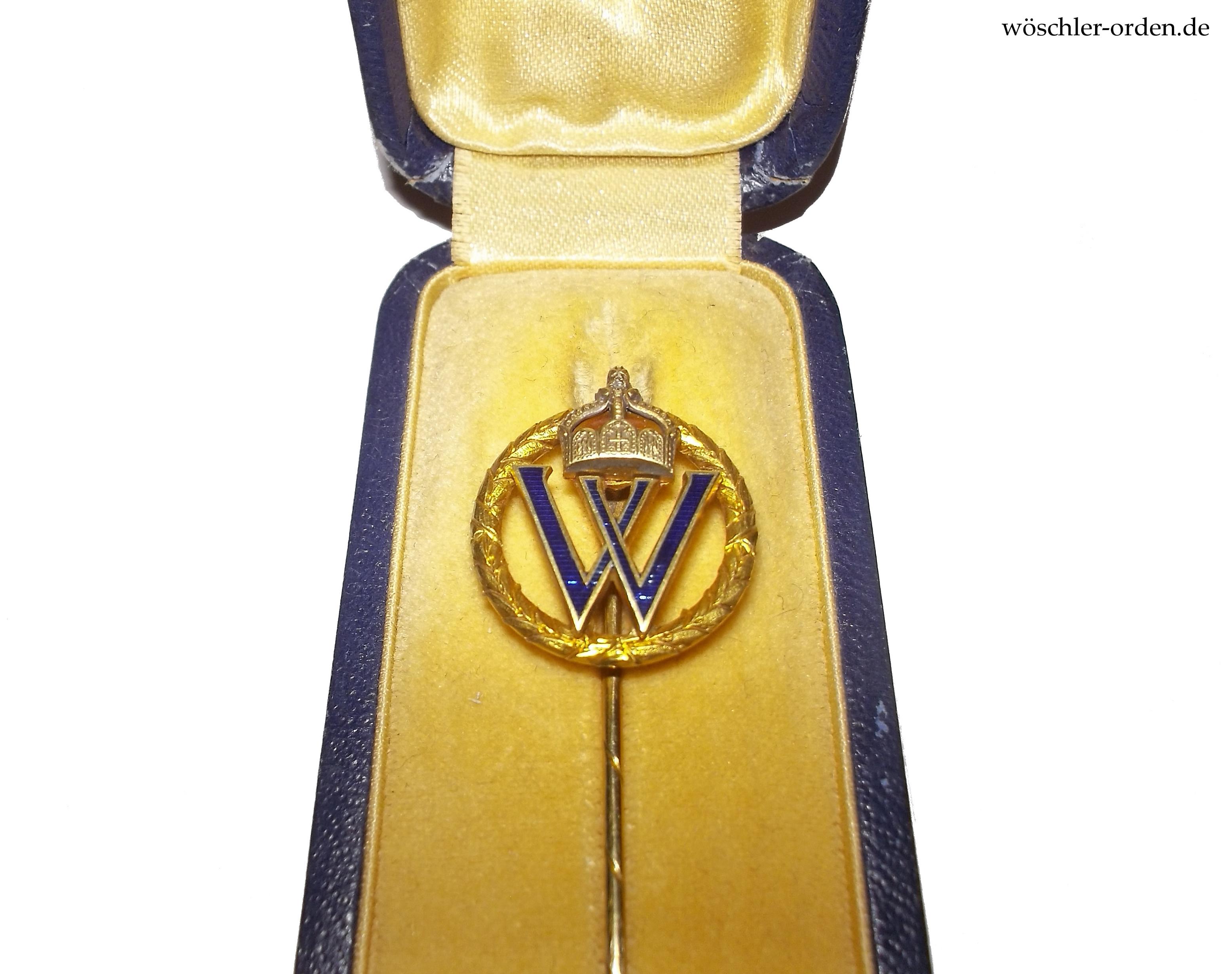 Deutsches Reich, Goldene Geschenk-Krawattennadel Kaiser Wilhelm II. in Form eines goldenen, dunkelblau emaillierten Monogrammes „W“ unter der Deutschen Kaiserkrone, diese aus vergoldetem Silber gefertigt und teilweise emailliert. Anstelle des Reichsapfel ein kleiner Edelstein, wohl ein Diamant (ungeprüft). Das Monogramm umgeben von einem eng gebundenen Lorbeerkranz, dessen Durchmesser etwa 18 mm beträgt.