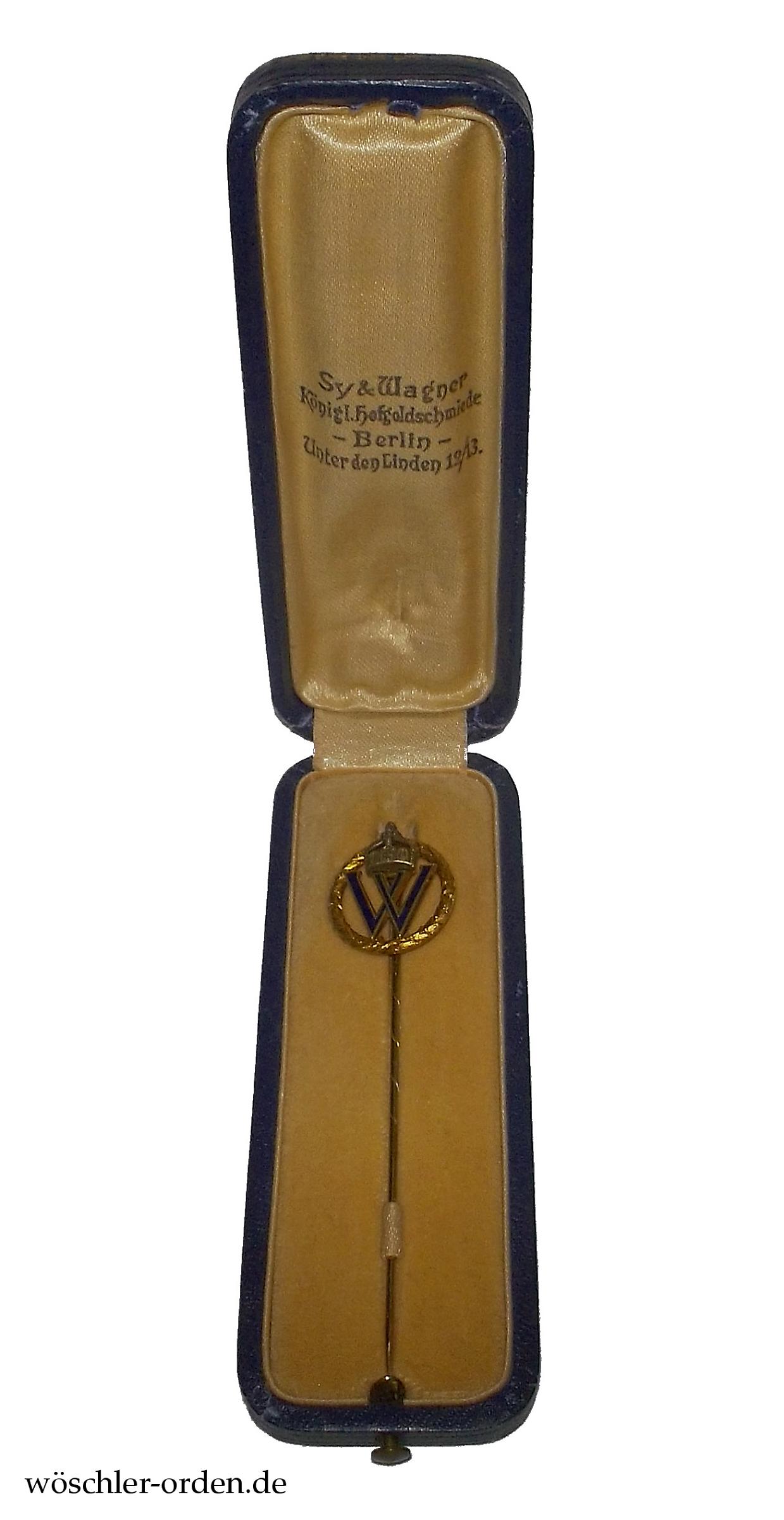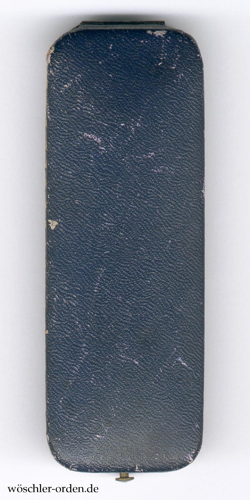 Dazu das von einer goldenen Dekorleiste abgesehen schmucklose, mit blauem Lederimitat bezogene Verleihungs- bzw. Vergabeetui, innen mit Einlage von cremefarbenem Samt mit Aussparung für die Tragenadel, der Himmel in ebenfalls cremefarbener Seide, mit schwarz eingedrucktem Signet von „Sy & Wagner / Königl. Hofgoldschmiede / – Berlin – / Unter den Linden 12/13.“