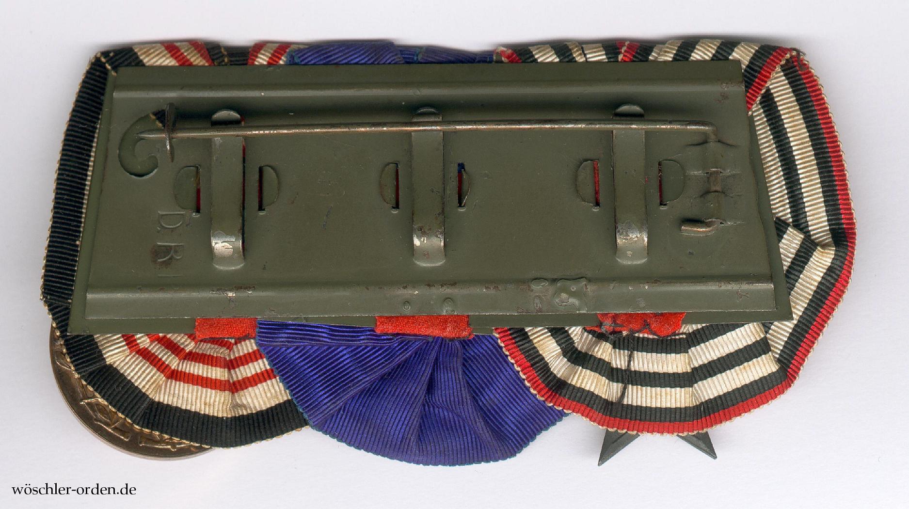 Die Ordensschnalle mit bogenförmig konfektionierten Bändern, diese von links nach rechts angeordnet. Rückseitig feldgrau lackiertes „D.R.P.“-Patentblech nebst stabiler Tragenadel.