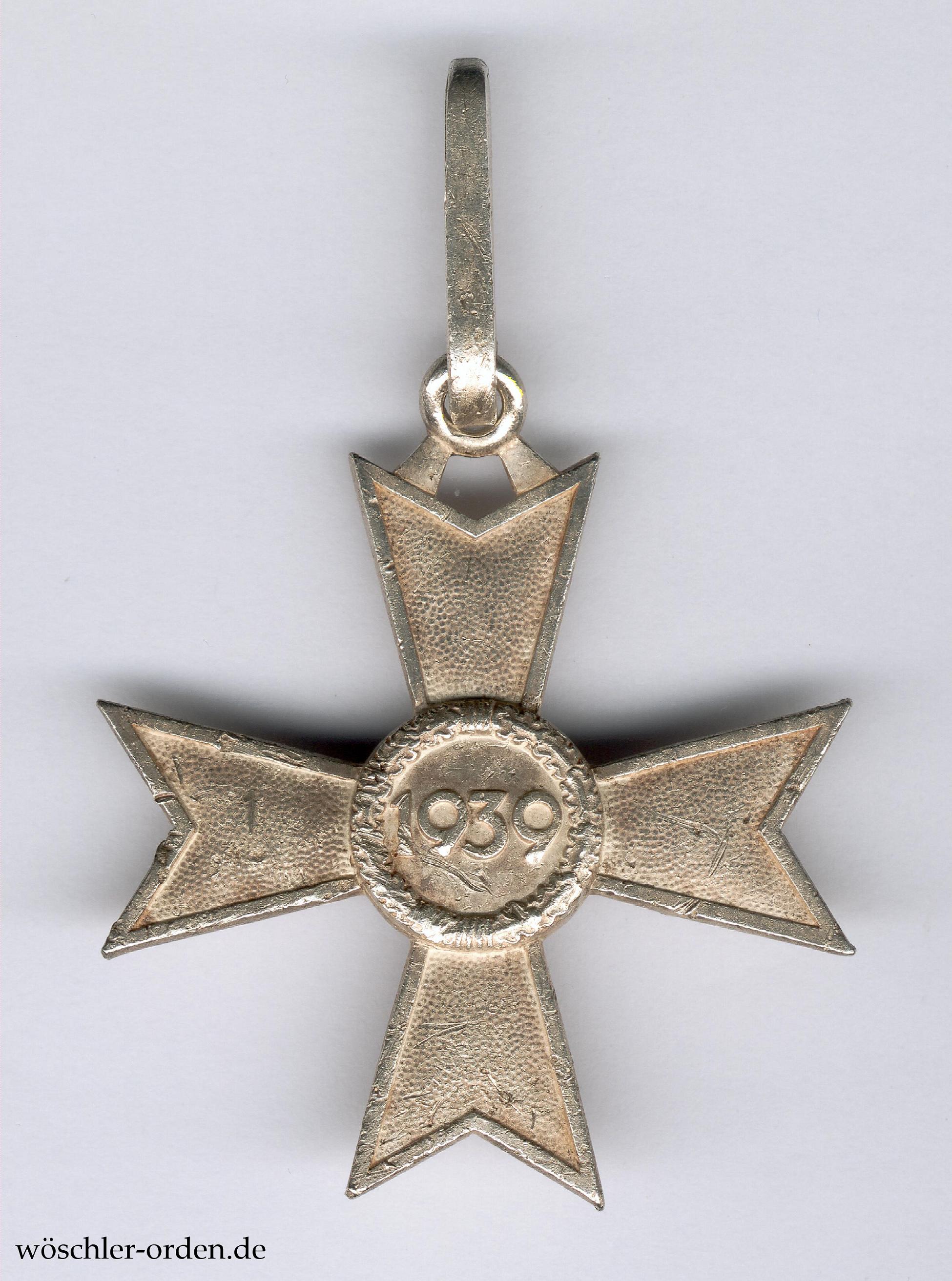 Silber, einteilig geprägt und weißgesiedet, an länglichem, geschlossenen Bandring. Am unteren Kreuzarm schwach geschlagene Punzierungen „900“ für den Feingehalt sowie Herstellerpunze „1“ der Firma Deschler & Sohn, München. In dieser Stufe sind ohne Schwerter insgesamt lediglich 59 Verleihungen nachweisbar.