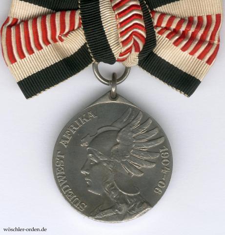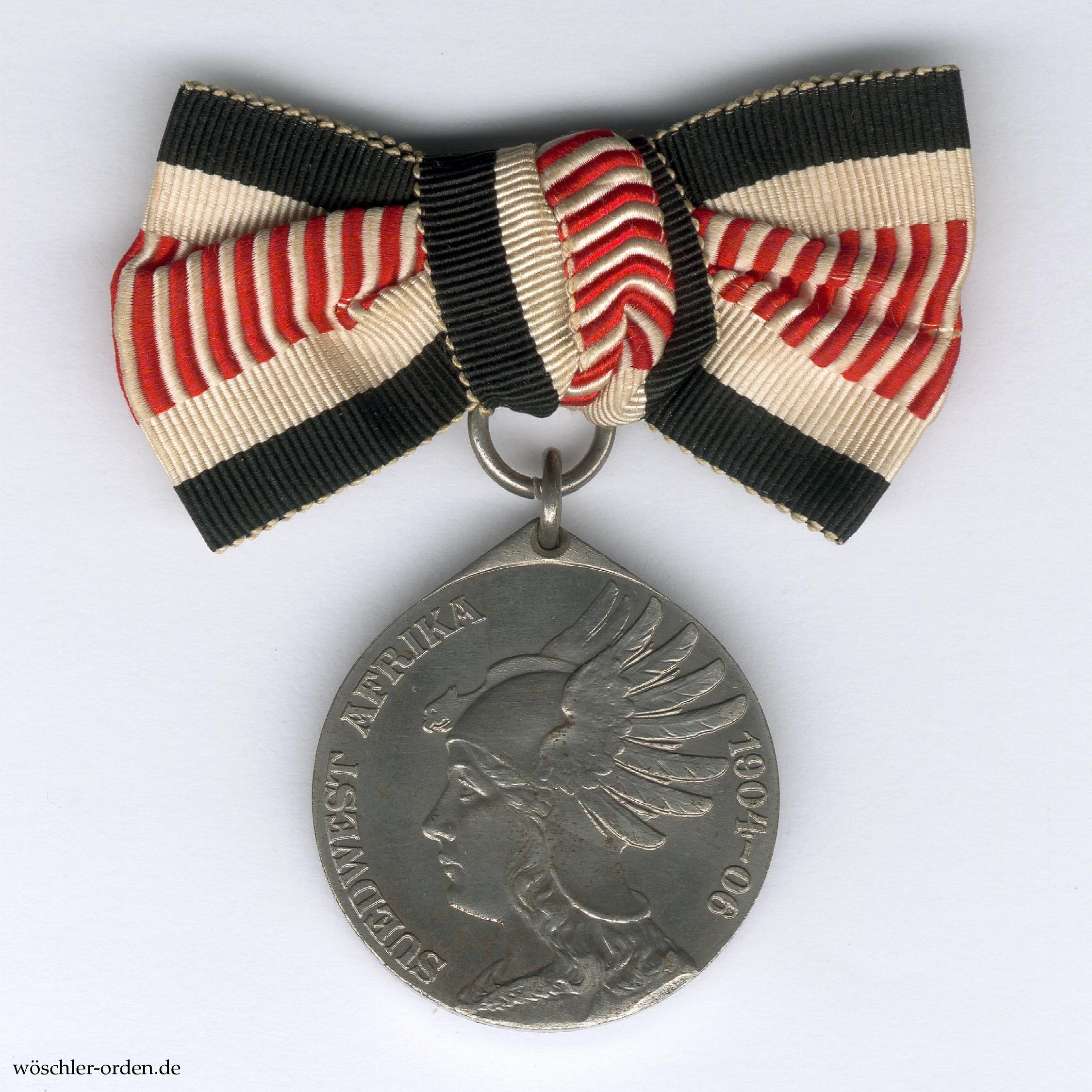 Die Südwestafrika-Denkmünze wurde durch Kaiser Wilhelm II. am 19. März 1907 gestiftet, und zwar in Bronze für alle an der Niederwerfung der „Eingeborenen-Aufstände“ in der deutschen Kolonie Südwestafrika 1904 bis 1906 beteiligt gewesenen Streitkräfte, sowie für die an der Kranken- und Verwundetenpflege beteiligten Personen. In Stahl erhielten die Medaille solche Personen, die an den Vorbereitungen zur Entsendung der Streitkräfte in außergewöhnlichem Maße beteiligt waren, ebenso Angehörige der Besatzung von Schiffen deutscher Reedereien, die zur Beförderung von Truppen und Kriegsbedarf nach und von Südwestafrika gechartert waren. Wie bereits bei der China-Denkmünze stammt auch hier der Entwurf von Kaiser Wilhelm II., die Prägestempel schnitt der Medailleur Schultz von der Berliner Hauptmünze.