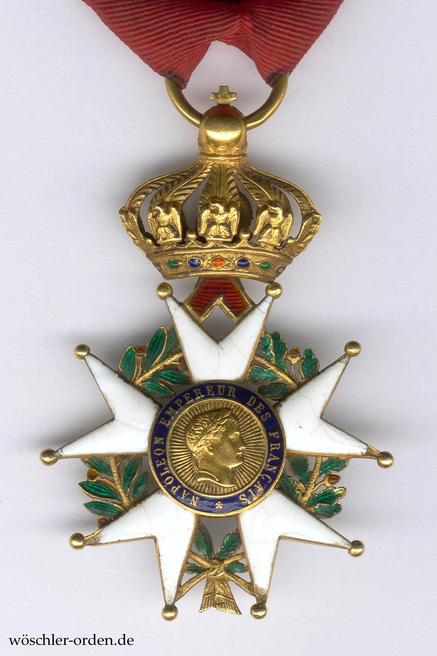Exemplar des zehnten, von 1852 bis 1870 verliehenen Modells der Zeit des Zweiten Kaiserreichs. Gold und Emaille, mehrteilig gefertigt, im Medaillonring unleserliche Hersteller- oder Feingehaltspunzierung.