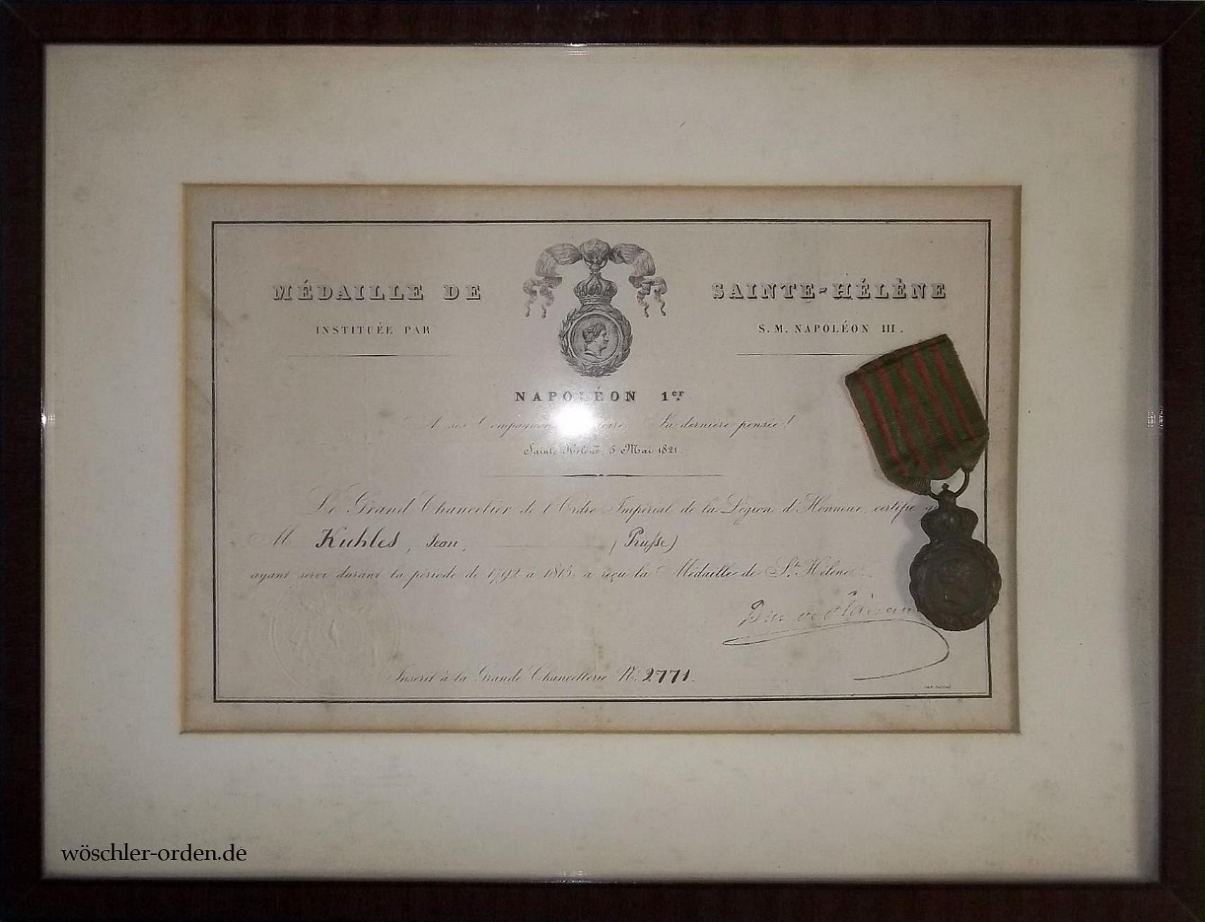 Zusammen mit Originalband und der Verleihungsurkunde mit Matrikelnummer „2771“ für den (ehemals) preußischen Soldaten Jean (Johann?) Kuhles in schönem, jedoch deutlich jüngerem Rahmen.