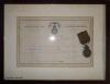 Die Medaille in sehr guter, wohl ungetragener Erhaltung, ebenso das Band. Die Urkunde stellenweise leicht stockfleckig, insgesamt ebenfalls gut erhalten.