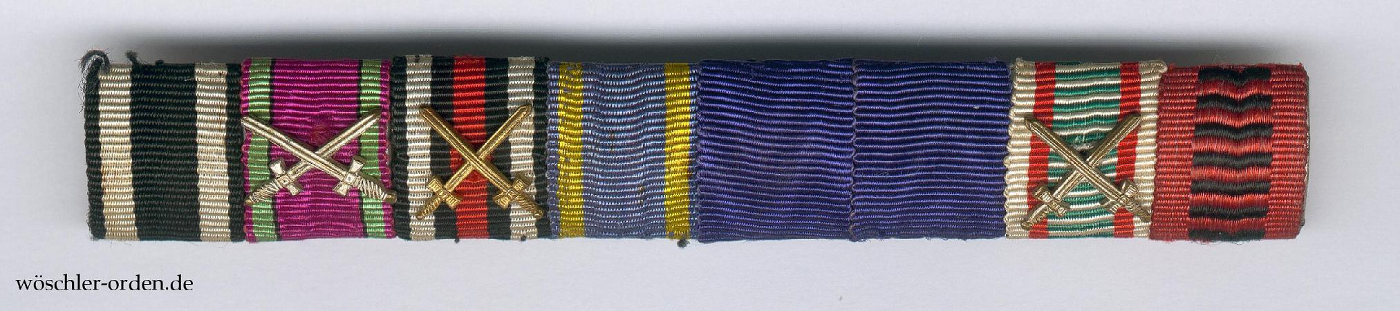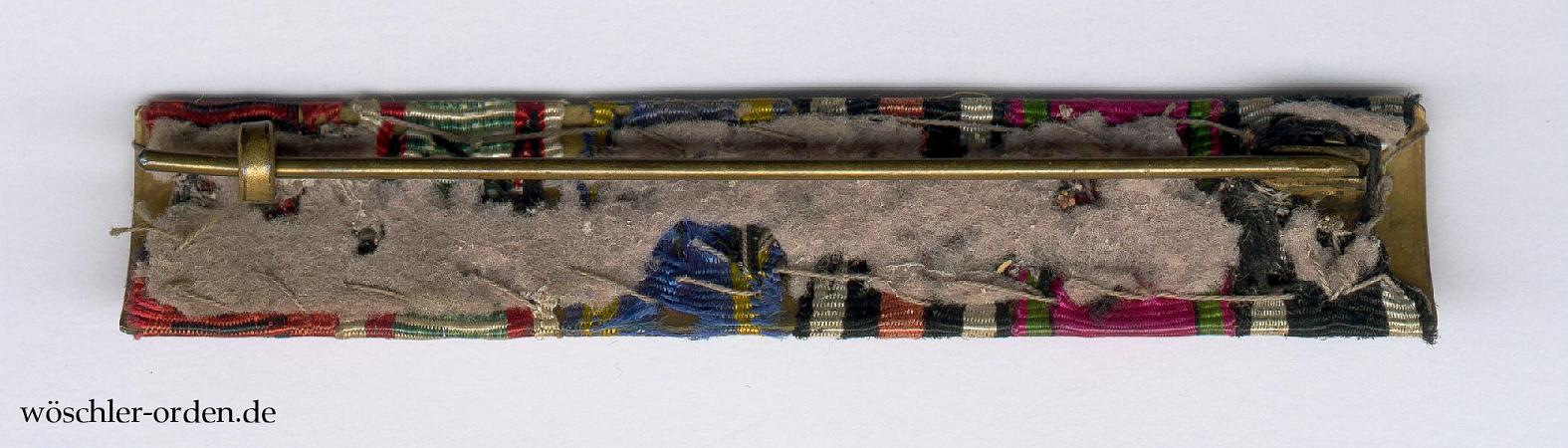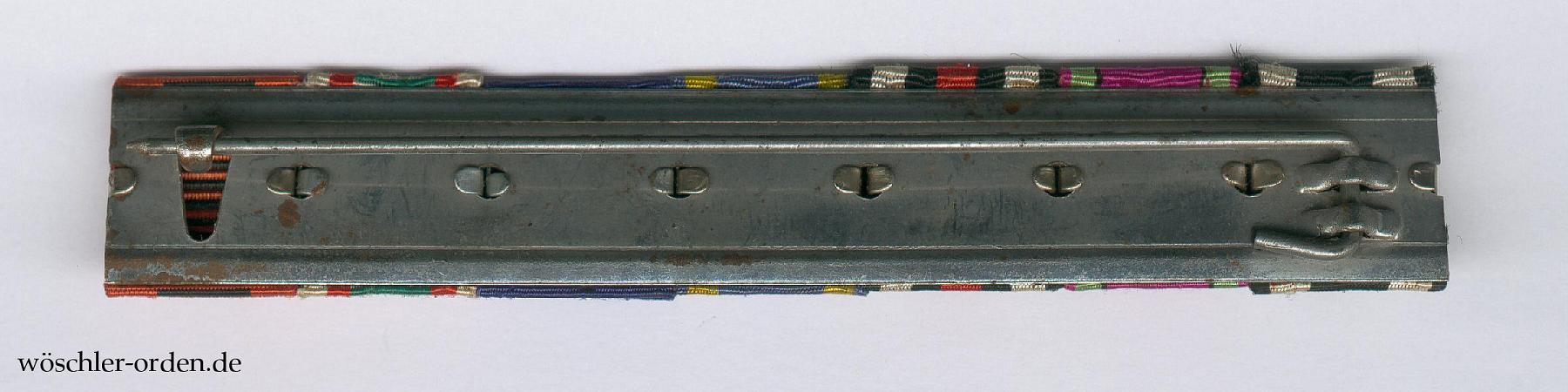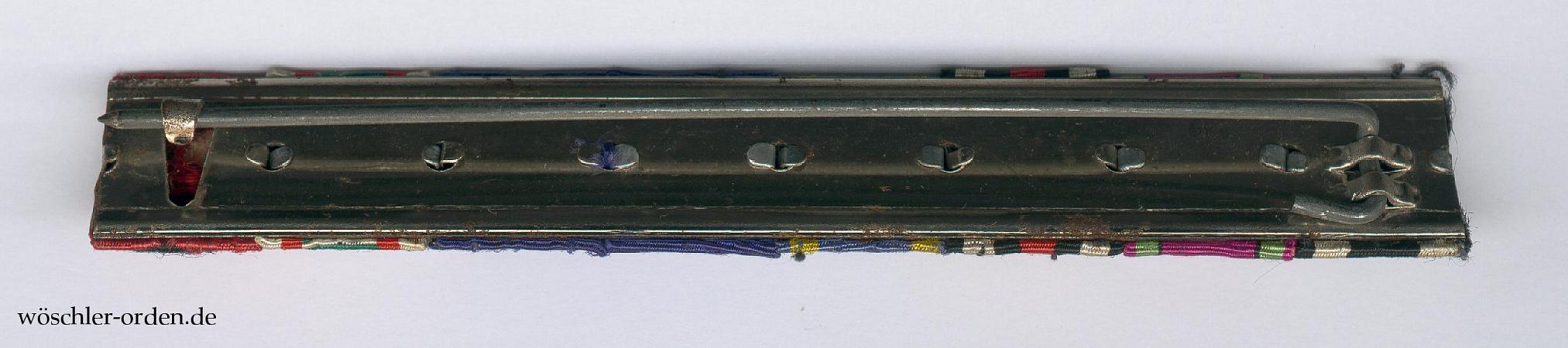 Die Feldspangen jeweils mit straff montierten Bändern, das je zweite, dritte und vorletzte Band mit aufgelegten gekreuzten Schwertern. Bei der 6er Spange handelt es sich um eine Fertigung der Firma Gebr. Godet & Co., Berlin, mit dem typischem Nadelsystem und der grauen Rückseitenabdeckung; die beiden späteren auf wohl vernickeltem Patentblech.