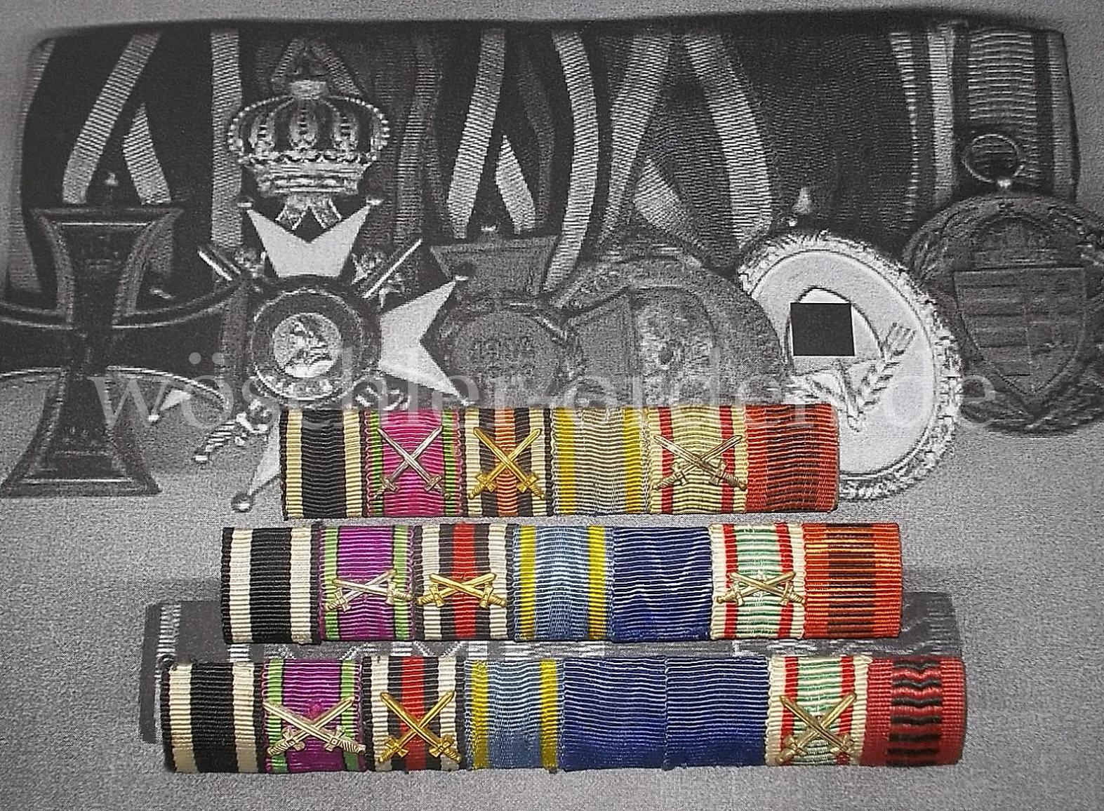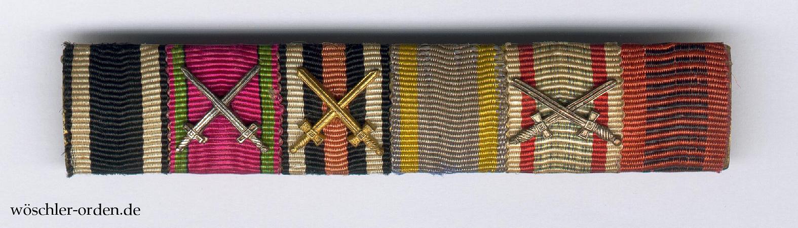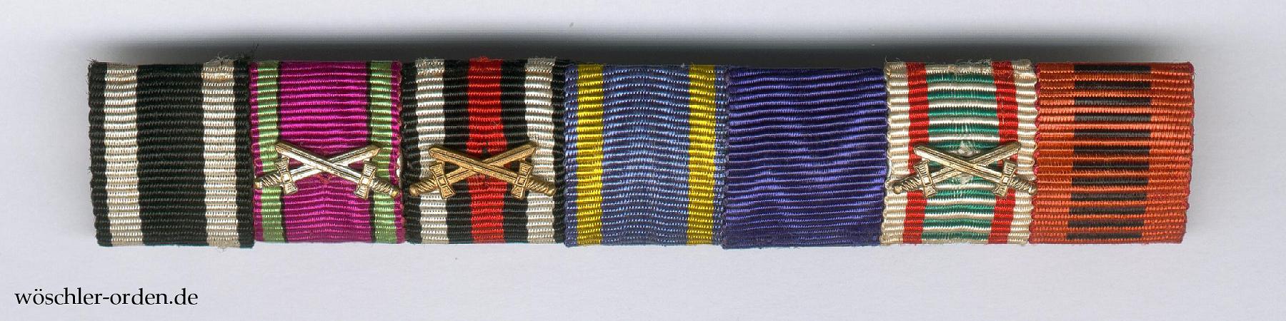 Die Feldspangen jeweils mit straff montierten Bändern, das je zweite, dritte und vorletzte Band mit aufgelegten gekreuzten Schwertern. Bei der 6er Spange handelt es sich um eine Fertigung der Firma Gebr. Godet & Co., Berlin, mit dem typischem Nadelsystem und der grauen Rückseitenabdeckung; die beiden späteren auf wohl vernickeltem Patentblech.