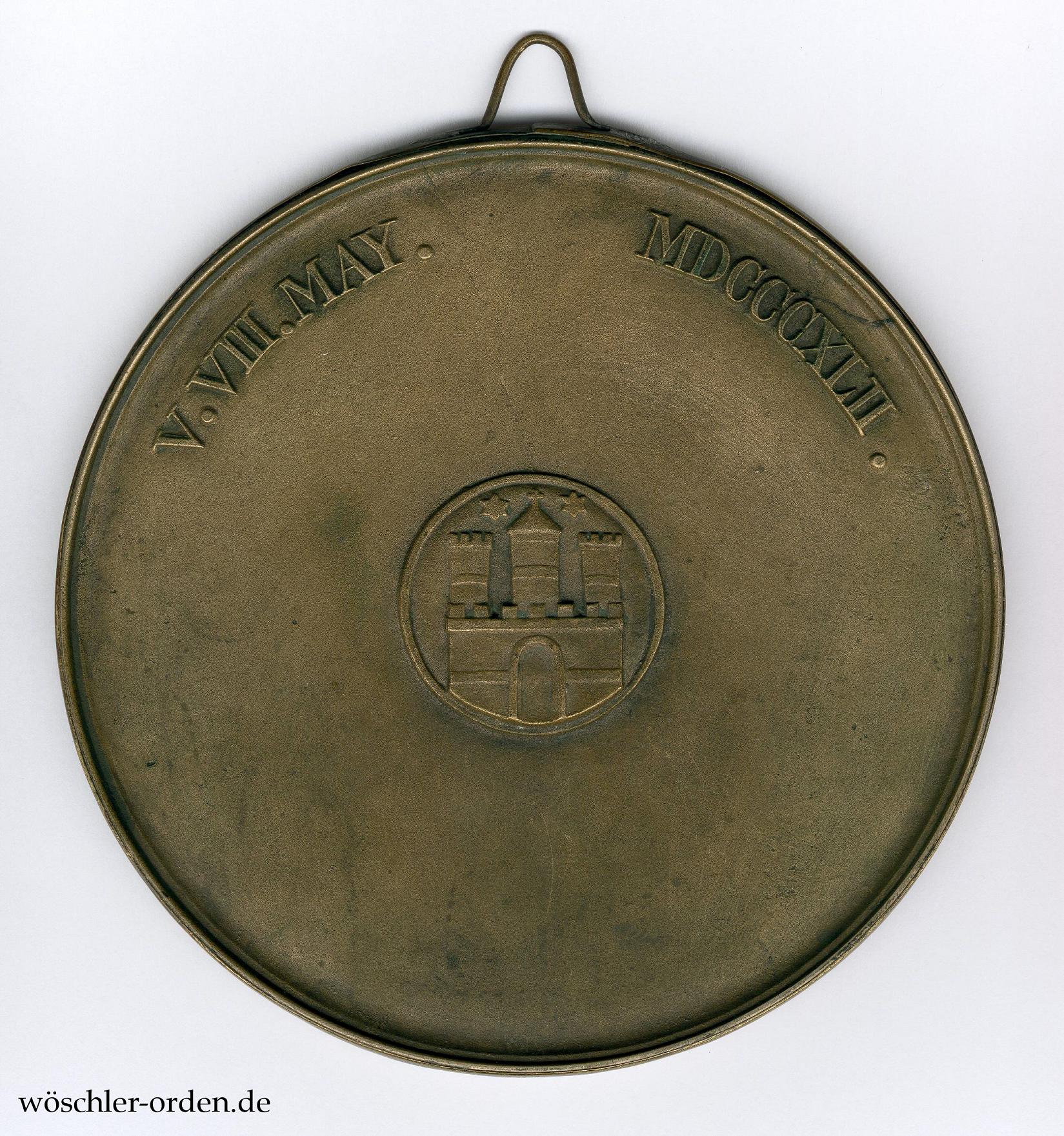 Bronzeguss, etwa 167 mm, wohl aus dem Glockenmetall der 1842 abgebrannten Hauptkirche. Vorderseitig sitzende Hammonia mit Mauerkrone, die Hand der vor ihr stehenden Germania haltend, die ein Füllhorn im linken Arm hält. Oben Inschrift „DEM DEUTSCHEN VATERLANDE DANK.“, unten das Stiftungsdatum „HAMBURG . MDCCCXLIII / VIII MAY“. Rückseitig in der Mitte das Hamburger Stadtwappen, oben „V. VIII. MAY.“ und „MDCCCXLII.“, also das Datum des „Großen Brandes“.