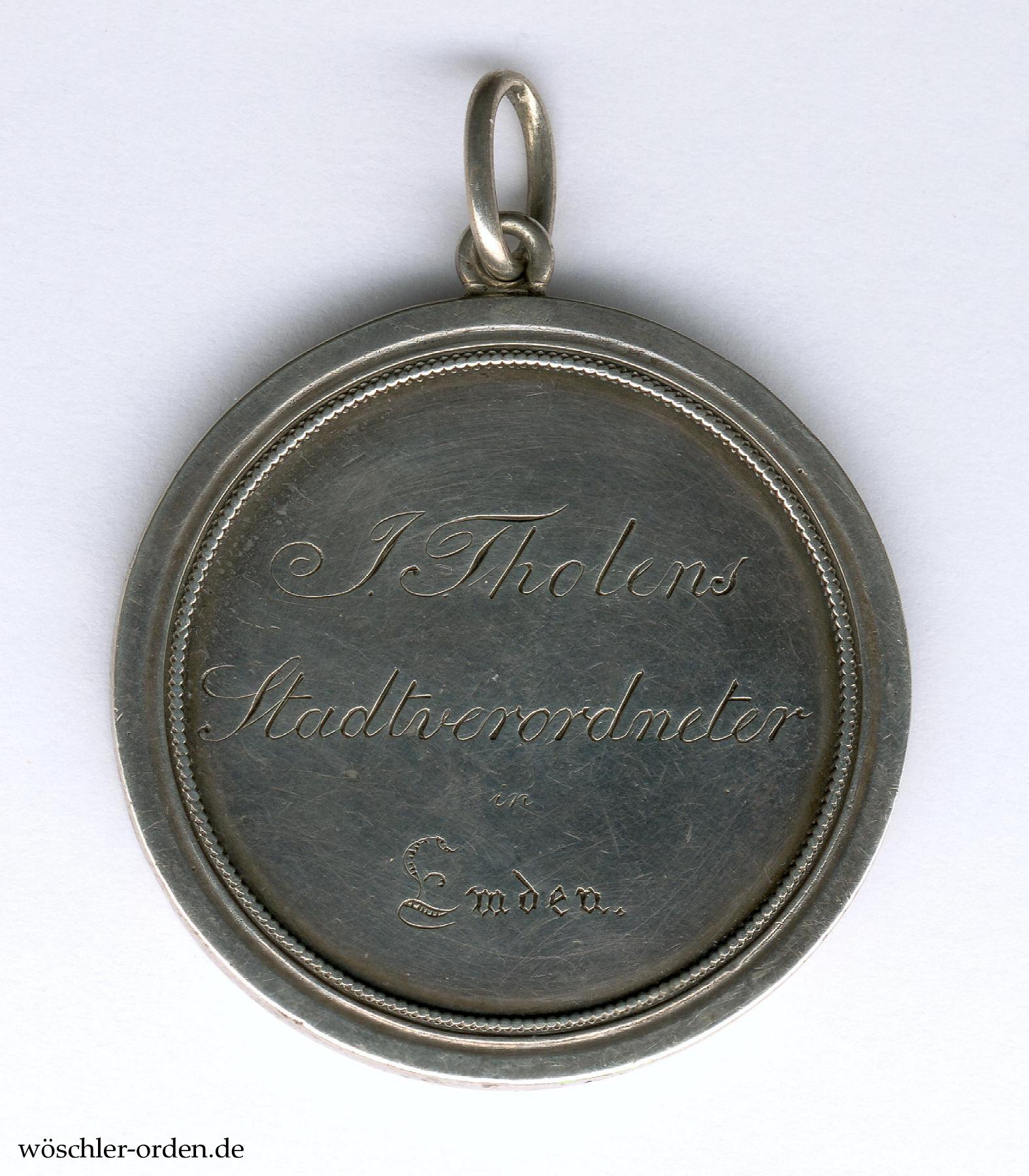 Kreisrunde, silberne Medaille, etwa 41 mm, beidseitig graviert. Vorderseitig das Wappen der Stadt Emden mit dem „Engelke up de Muer“ („Engelchen auf der Mauer“) zwischen Lorbeerzweigen und unter einer Krone. Bei dem „Engelchen“ handelt es sich tatsächlich um eine Harpyie, die sich auf das Wappen der Familie Cirksena, dem früher über die Stadt herrschenden Adelsgeschlecht, bezieht. Über dem Wappen unaufgelöste Gravur „WYK 5“ oder „WYKS“, möglicherweise als Angabe des Herstellers, darunter Gravur „Introducirt d. 10. Febr. 1845.“ bezüglich des Datums der Amtseinführung. Rückseitig vierzeilige, ebenfalls gravierte Widmungsinschrift „J. Tholens / Stadtverordneter / in / Emden“. An parallel angelötetem Ringchen, daran etwas größerer Tragering.