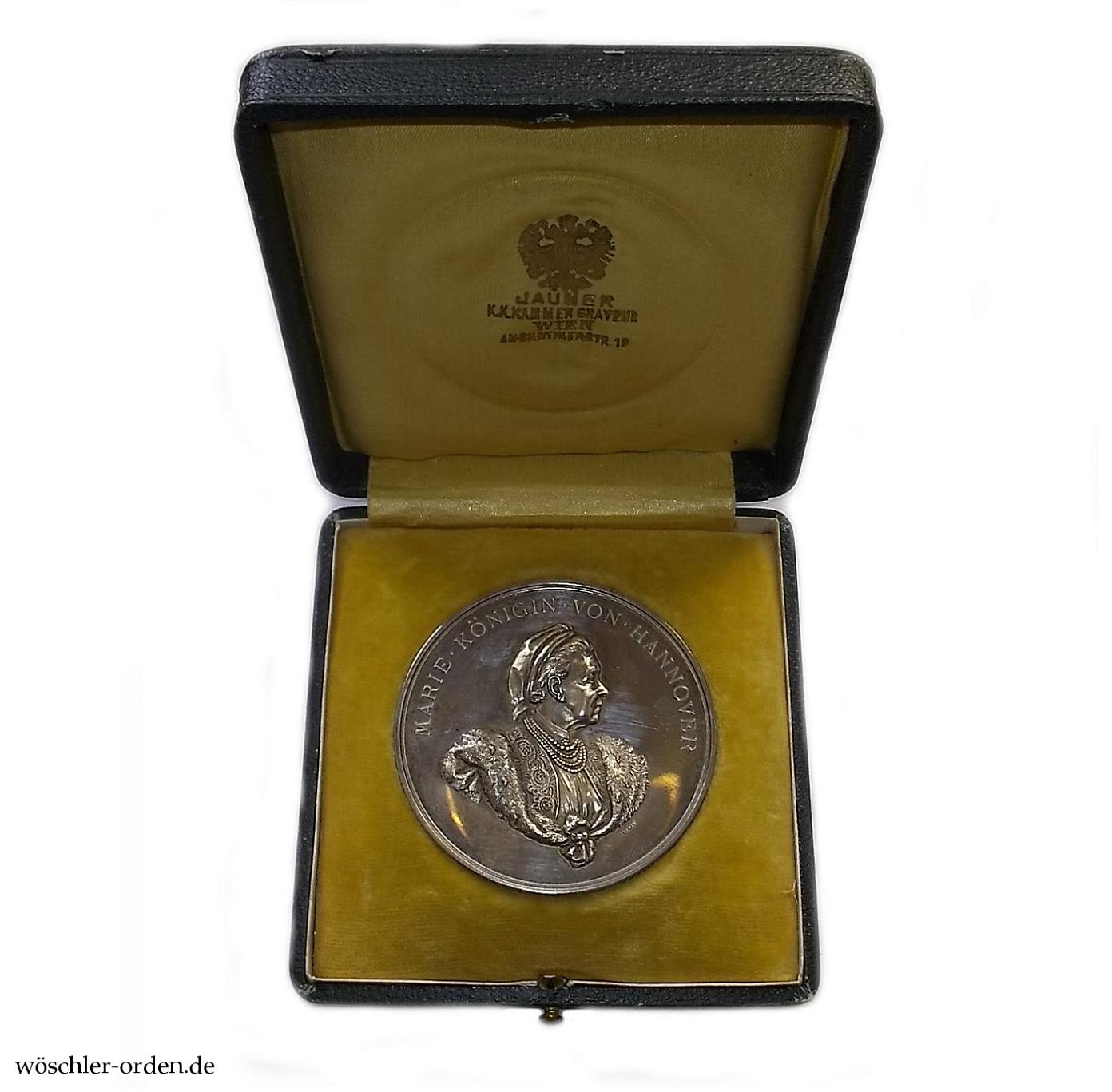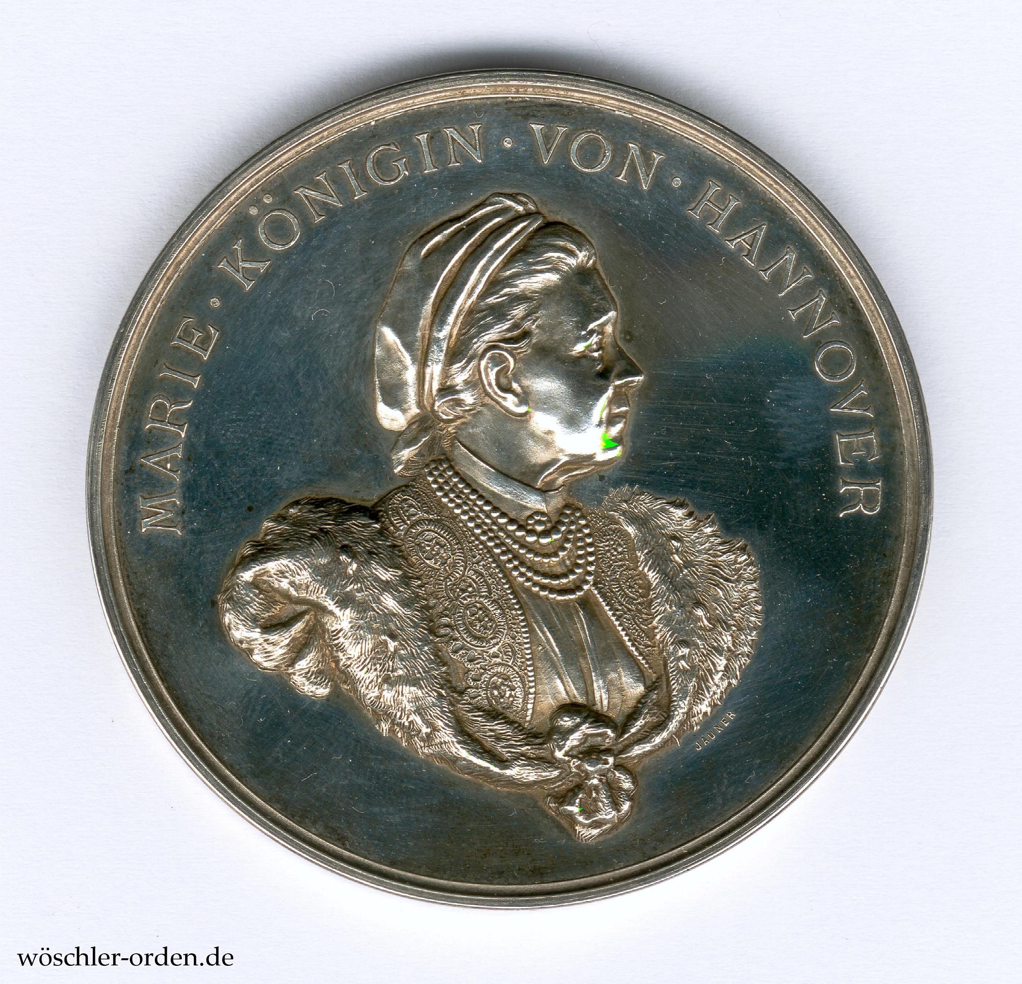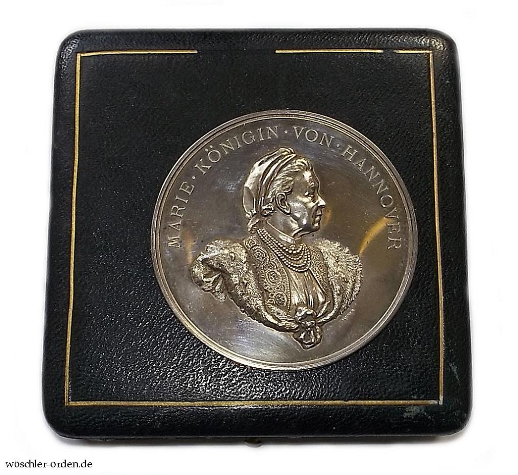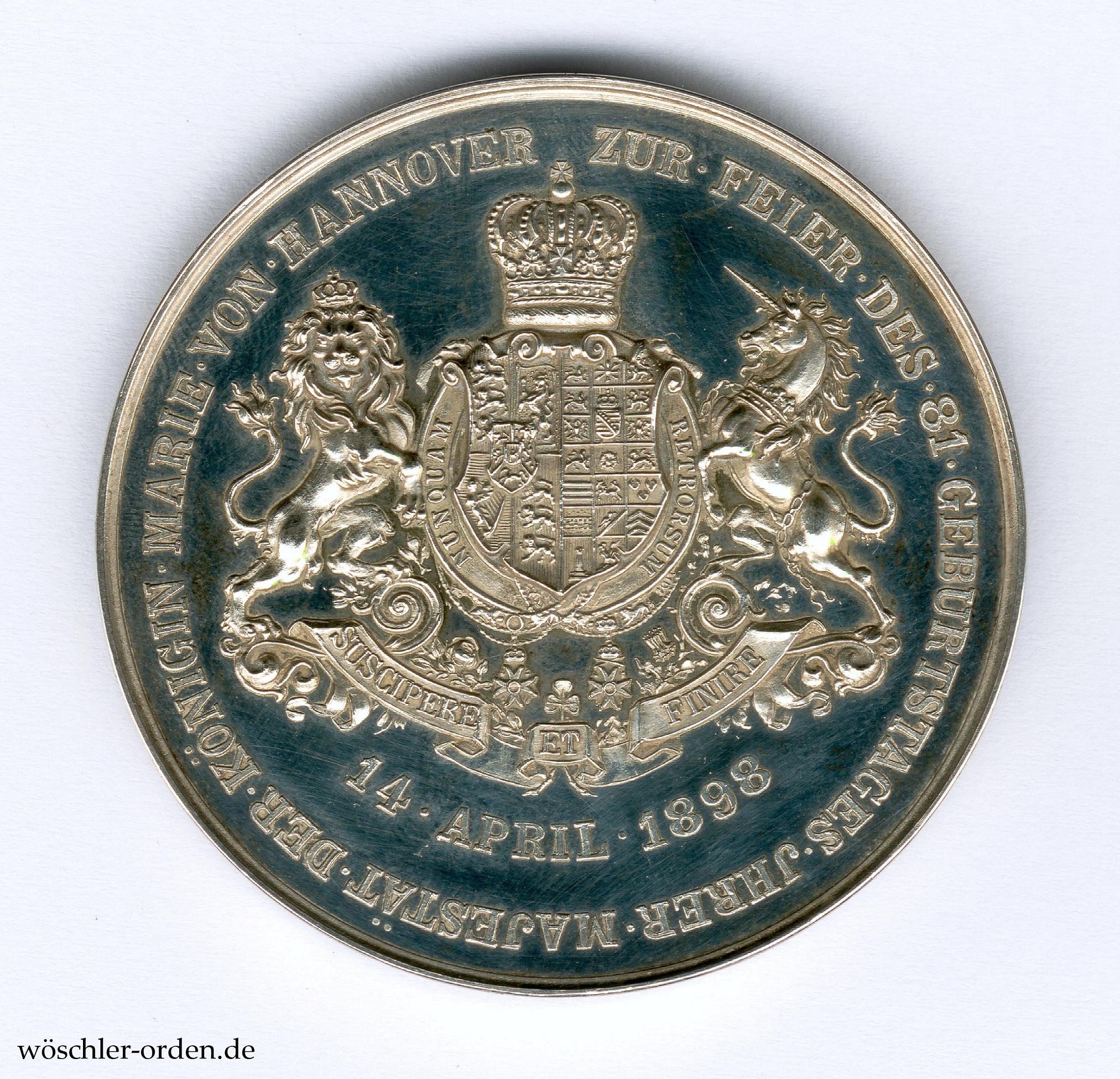 Silber geprägt, etwa 56 mm. Vorderseitig das Portrait der Königin nach rechts unter Umschrift „MARIE . KÖNIGIN . VON . HANNOVER“, rückseitig das Hannoversche Wappen mit Spruchband „SUSCIPERE ET FINIRE“ sowie Zweckinschrift „ZUR . FEIER . DES . 81 . GEBURTSTAGES . JHRER . MAJESTÄT . DER . KÖNIGIN . MARIE . VON . HANNOVER“, innen „14 . APRIL . 1898“. Am Rand Hersteller- und wohl altösterreichische Feingehaltspunzierung.