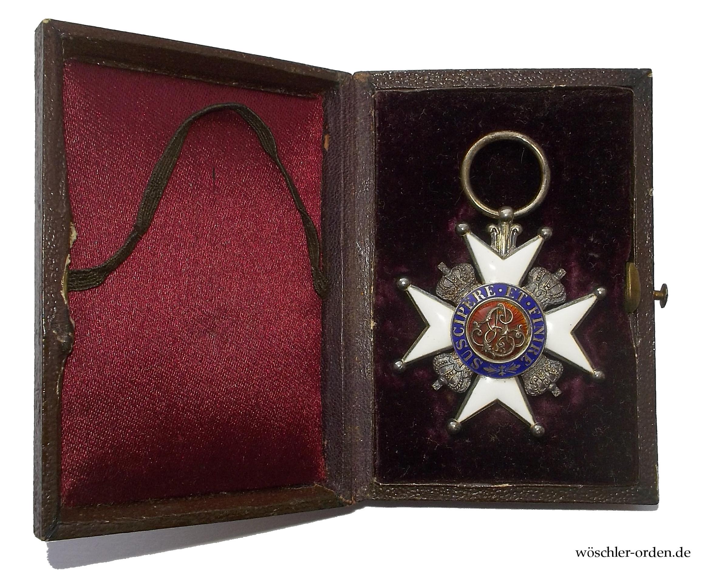 Exemplar aus Fertigung der Firma Carl Büsch, Hannover, deren Erstlieferung aus 96 Exemplaren dieser Klasse bestand. Silber, mehrteilig gefertigt und emailliert. Wohl erste Ausführung mit „geschlossenen“ Kronen zwischen den Kreuzarmen. Das Monogramm im Medaillon der Vorderseite separat gefertigt und aufgelegt, das in dem der Rückseite plan in der transluzid roten Emaille liegend. An länglicher Zieragraffe mit starrer Kugelöse, durch diese der geschlossene Bandring.