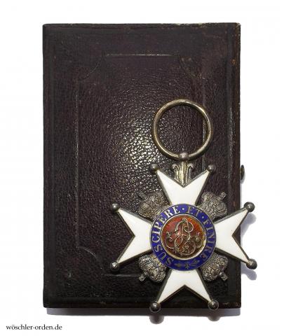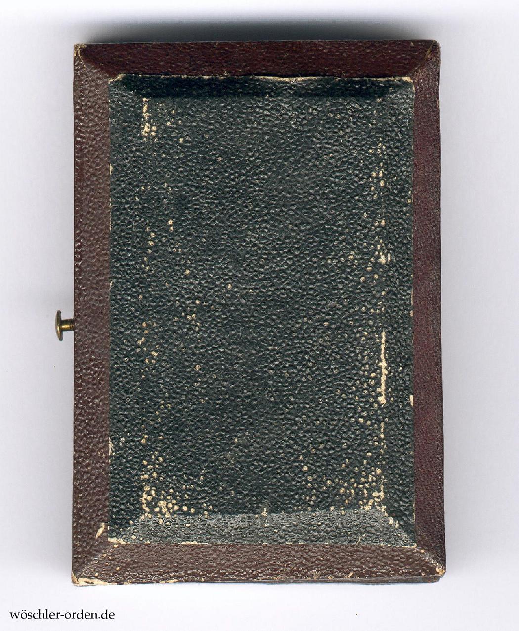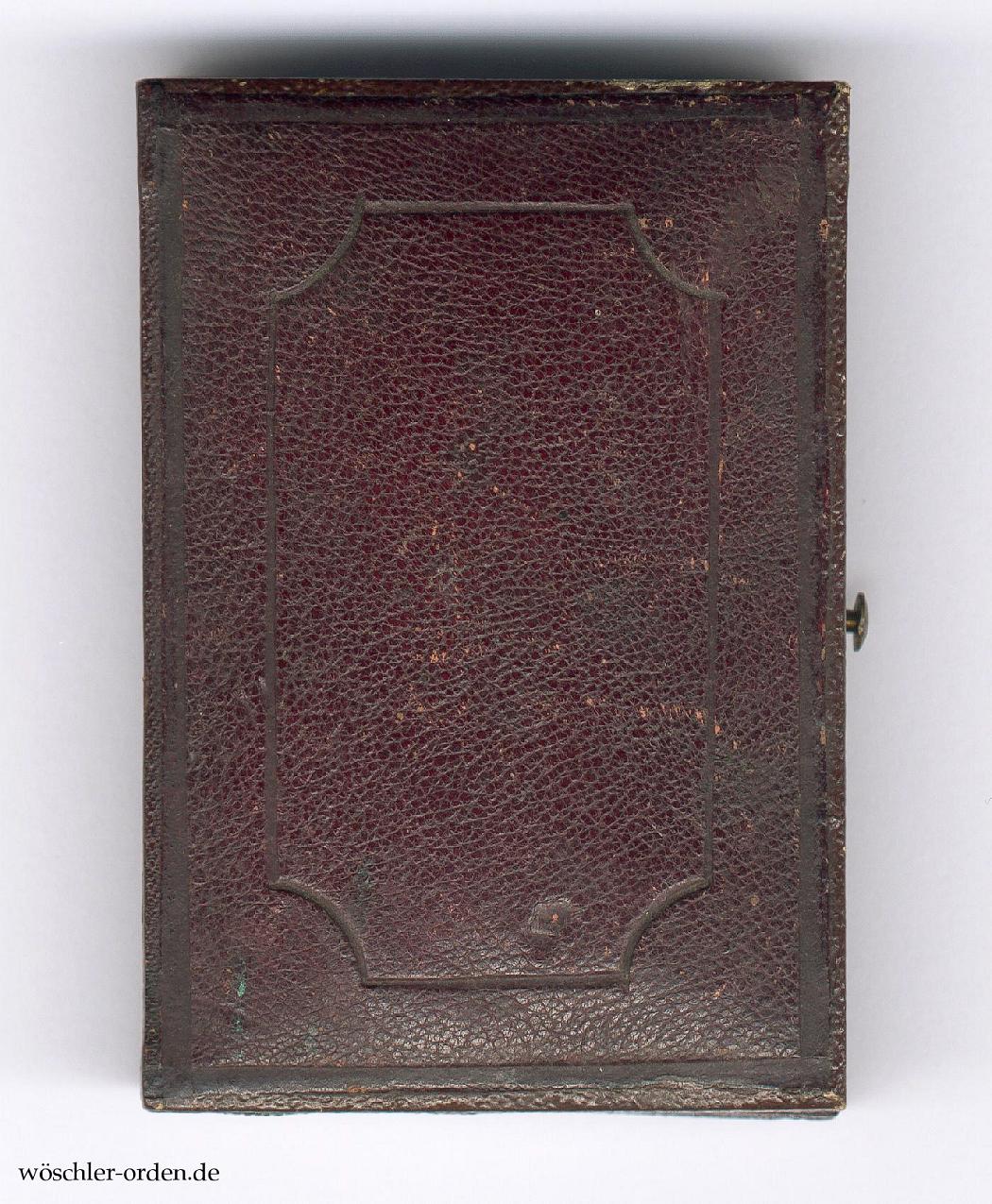 Dazu das mit braunem Leder mit eingeprägtem Dekor bezogene Verleihungsetui, gänzlich ohne ein Wappen oder eine Beschriftung. Innen mit einer Einlage aus weinrotem Samt mit Aussparung für das Ordenskreuz nebst Bandring, der Himmel in ebenfalls weinroter Seide sowie einem Bändchen zur Halterung des Ordensbandes.