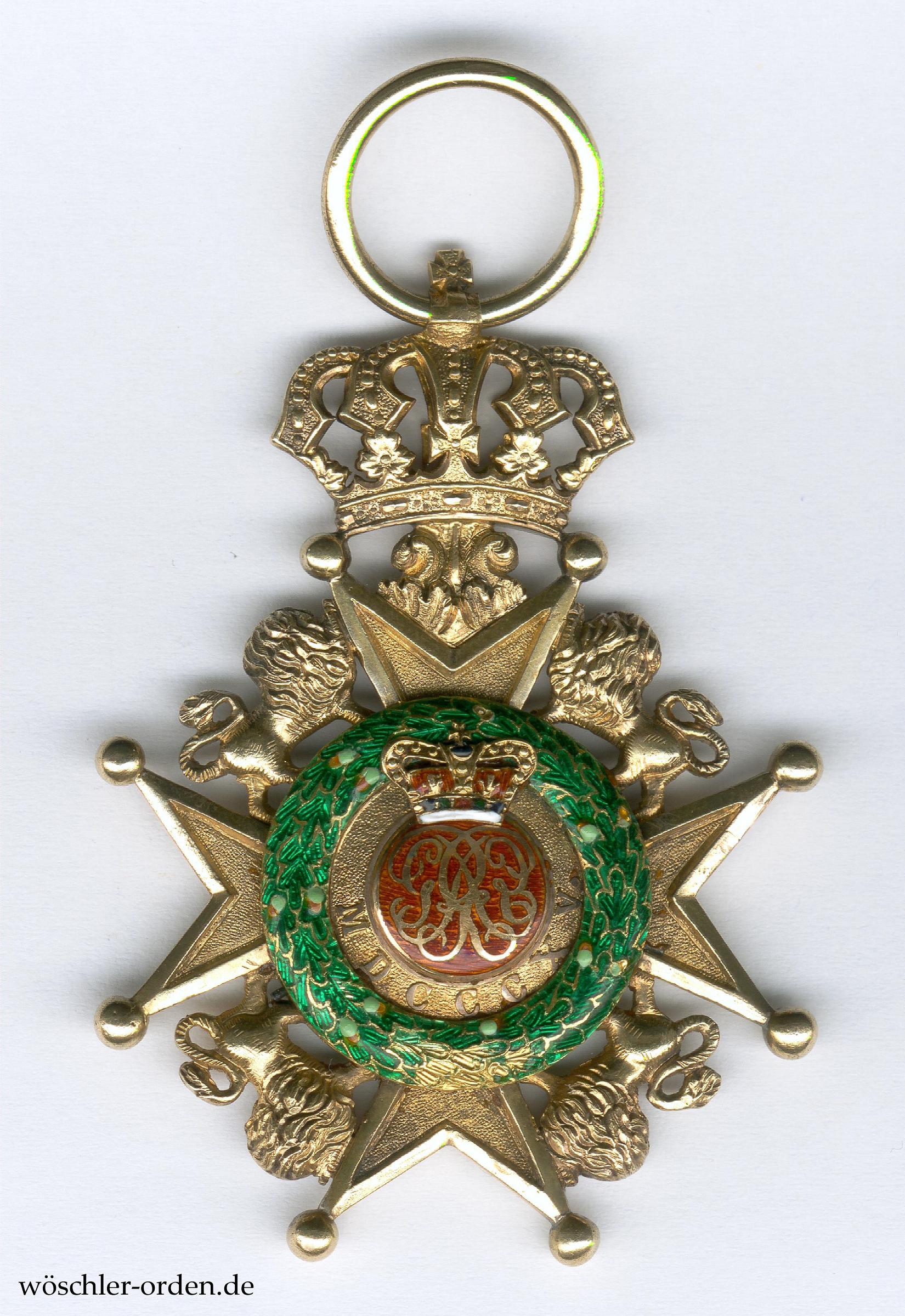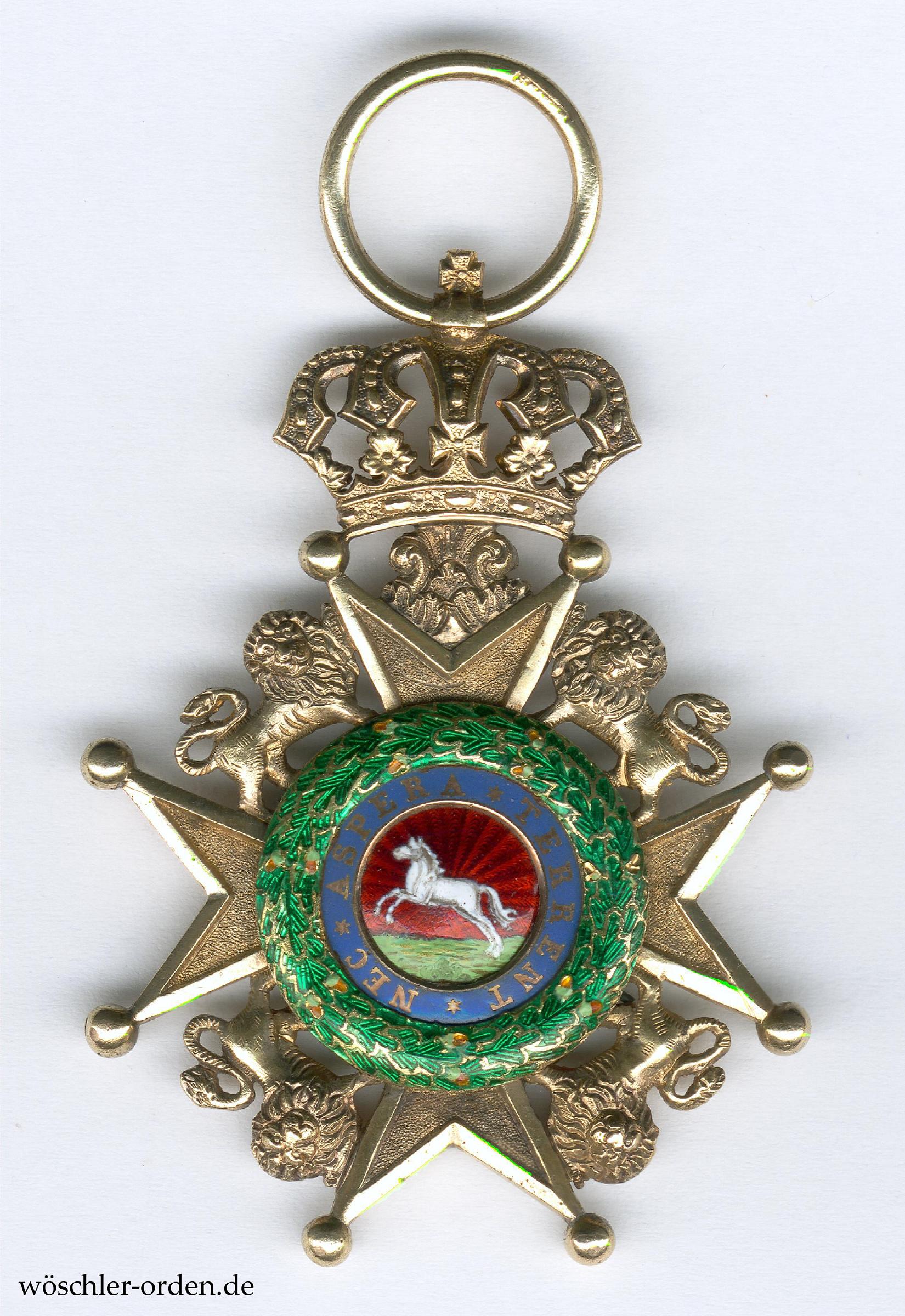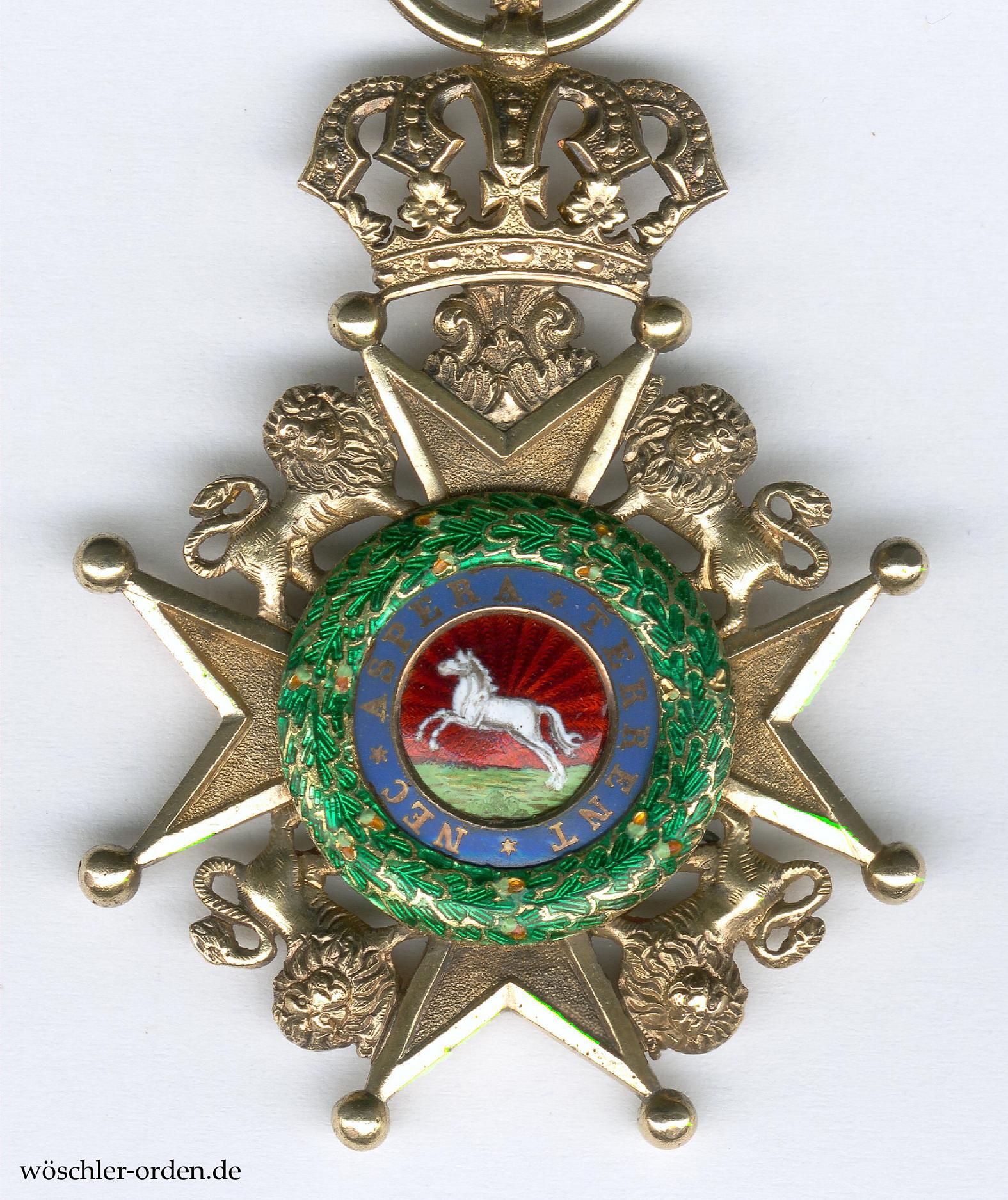Kleinere Ausführung für nichtfürstliche Personen in deutscher Fertigung. Gold und Emaille, die Medaillons aufwändig flinkiert und polychrom emailliert, die Malerei des Welfenrosses im Aversmedaillon besonders fein ausgeführt; insbesondere die Löwen zwischen den Kreuzarmen feinst nachbearbeitet, wohl graviert. Im Bandring Punzierung „KNAUER“ entweder des Georg Julius Friedrich Knauer (1790–1855) oder dessen Sohnes Georg Friedrich Wilhelm (1830–1905), beide Hannover – nicht zu verwechseln mit dem erst später tätigen Namensvetter in Oldenburg.
