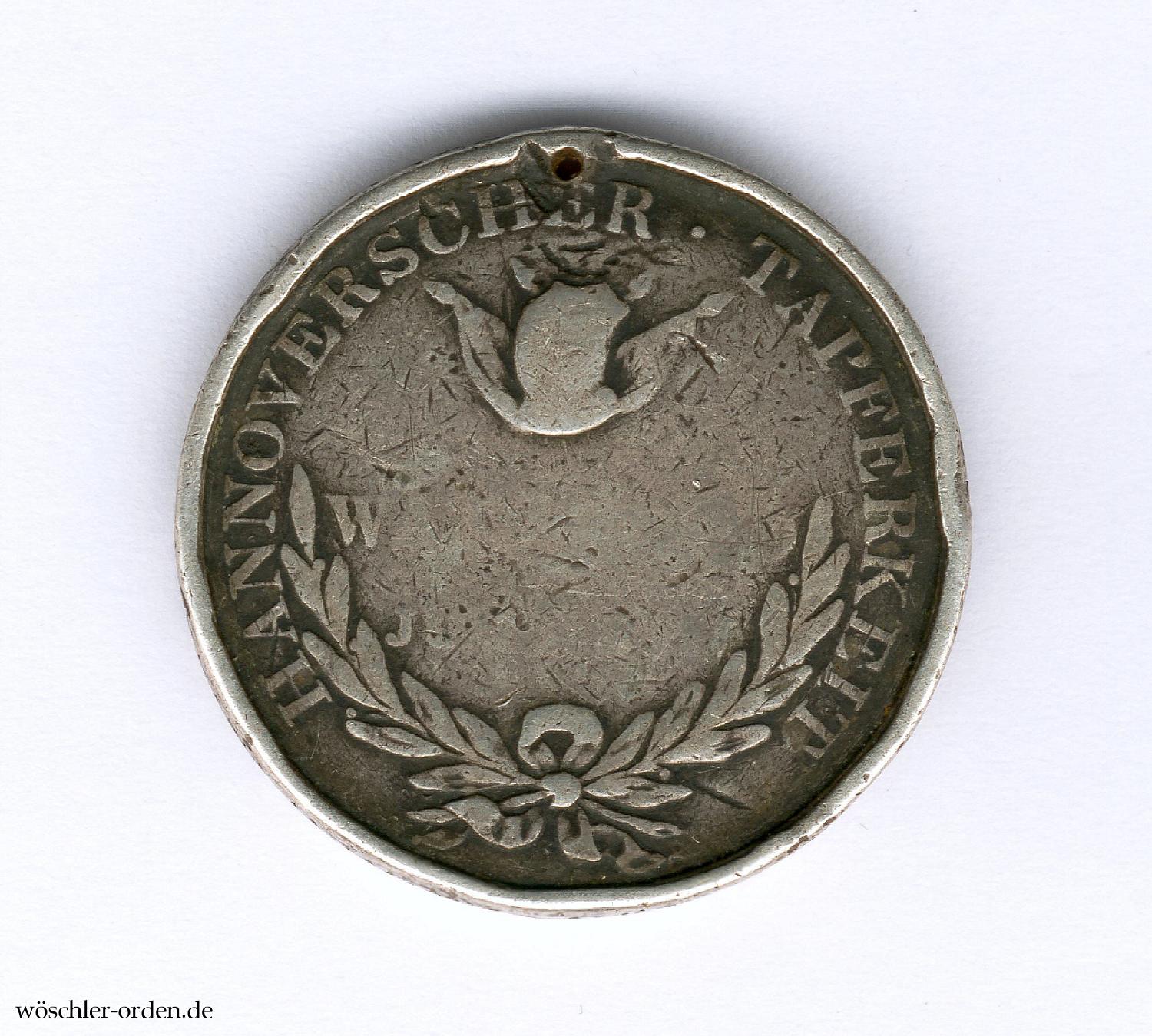 Silber geprägt, vorderseitig das nach rechts blickende Portrait des Stifters in antiker Gewandung mit Lorbeerkranz, darum Umschrift „GEORG . PRINZ . REGENT“, unten „1815“, unter dem Halsabschnitt Signatur „W. WYON“. Rückseitig unter einer kleinen Trophäe, bestehend aus Kürass und zwei gekreuzten Fahnen, in zwei Zeilen „WATERLOO / JUN. XVIII“, darunter zwei mit Schleife zusammengebundene Lorbeerzweige, darum Umschrift „HANNOVERSCHER . TAPFERKEIT“. Im Rand in lateinischen Versalien „SOLDAT JOHANN HEIMLICHER , GRENADIER BAT . OSTFRIESLAND“ eingeschlagen.