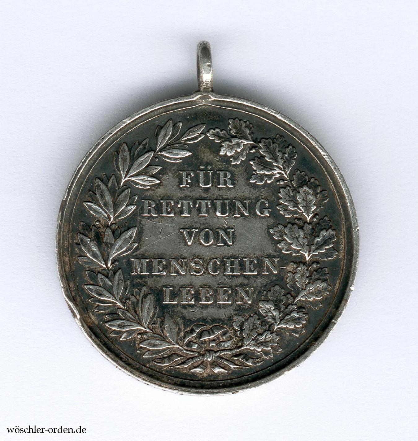 Ausgabe mit der Inschrift Für Rettung von Menschenleben aus der Zeit des ersten, bis 1889 verliehenen Modells mit dem Portrait Großherzog Ludwigs III., in einer besonders frühen Verleihung mit Namensgravur „JOSPH LEMAITRE ZU HAVRE“ auf dem Rand. Silber geprägt, an angelöteter Ringöse.