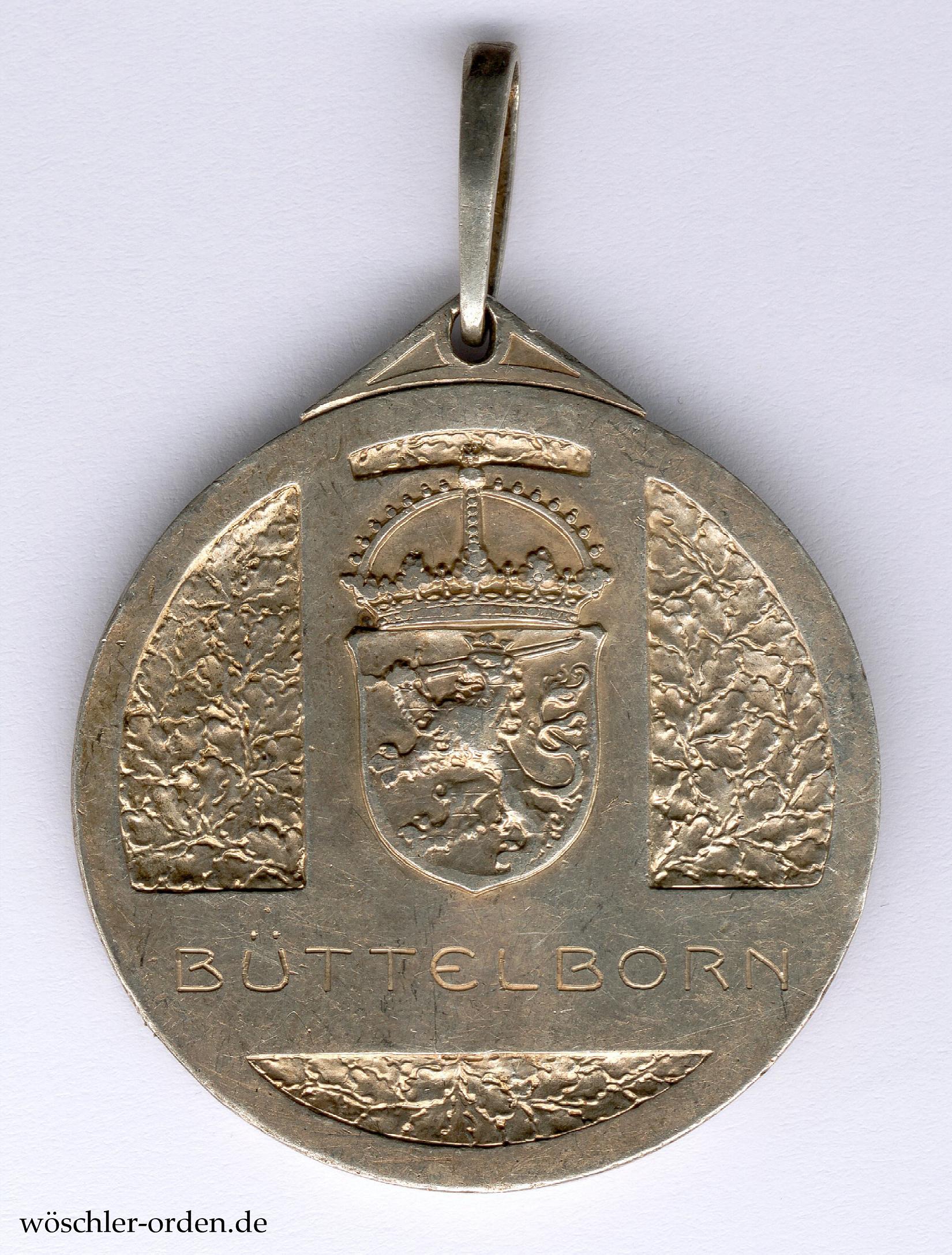 Exemplar des zweiten, 1906 eingeführten Modells mit dem Portrait des Großherzogs Ernst Ludwig, für die Gemeinde BÜTTELBORN, mit entsprechender Gravur auf der Rückseite. Silber geprägt, an gelochtem Ösensegment, dadurch ein länglicher, geschlossener Bandring. Am Rand, auf etwa elf Uhr, die Feingehaltspunzierung „990“. Gefertigt wurde das zweite Modell durch die Berliner Medaillen-Münze Otto Oertel.