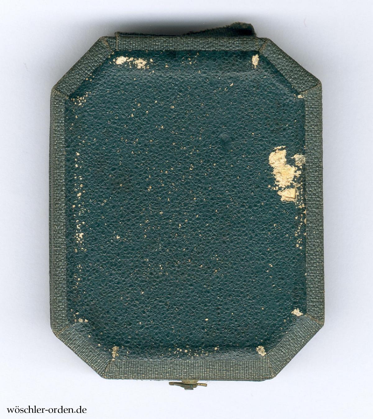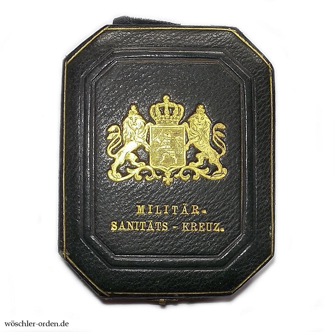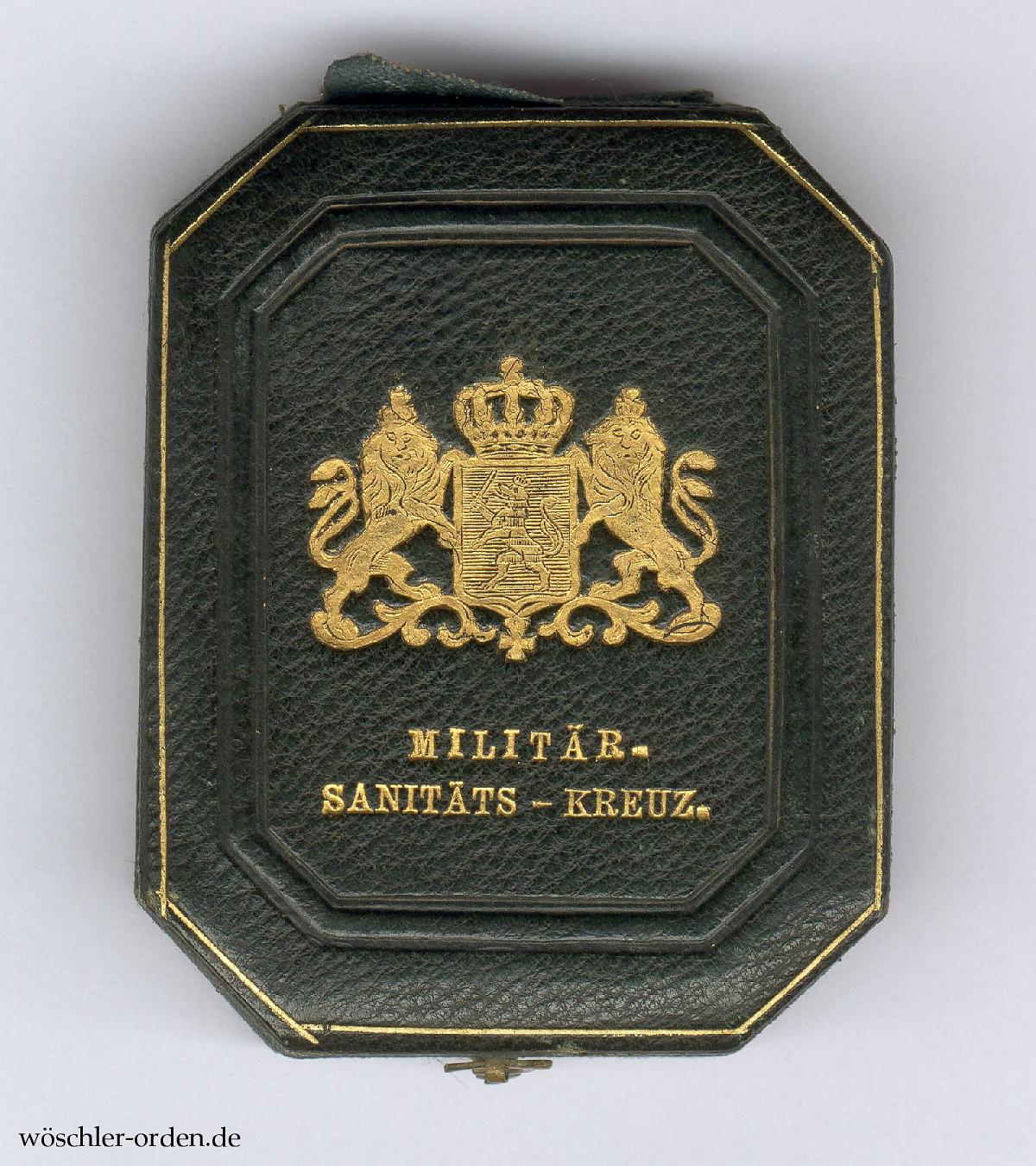 Leeres Verleihungsetui in der für die Verleihungszeit typischen achteckigen Form. Der Deckel in dunkelgrünem Leder mit goldgeprägtem Wappen und zweizeiliger Zweckinschrift „MILITÄR- / SANITÄTS – KREUZ“ zwischen teils goldenen, teils geprägten Zierlinien. Die Seiten und der Boden in grünem Lederimitat. Innen grüner Samt mit Aussparung für das Kreuz und den Bandring, der Deckel grün gefüttert mit vertikalem Bändchen als Bandhalter. Der Verschluss mit Häkchen.