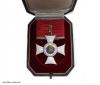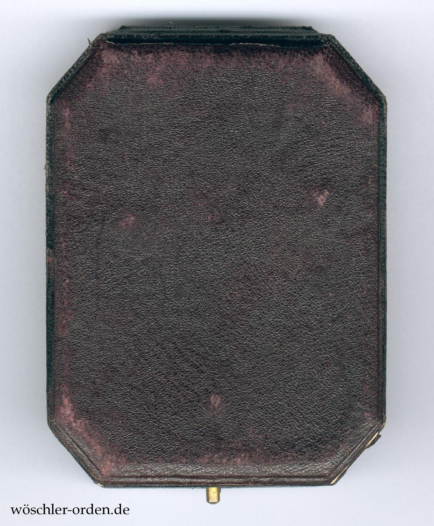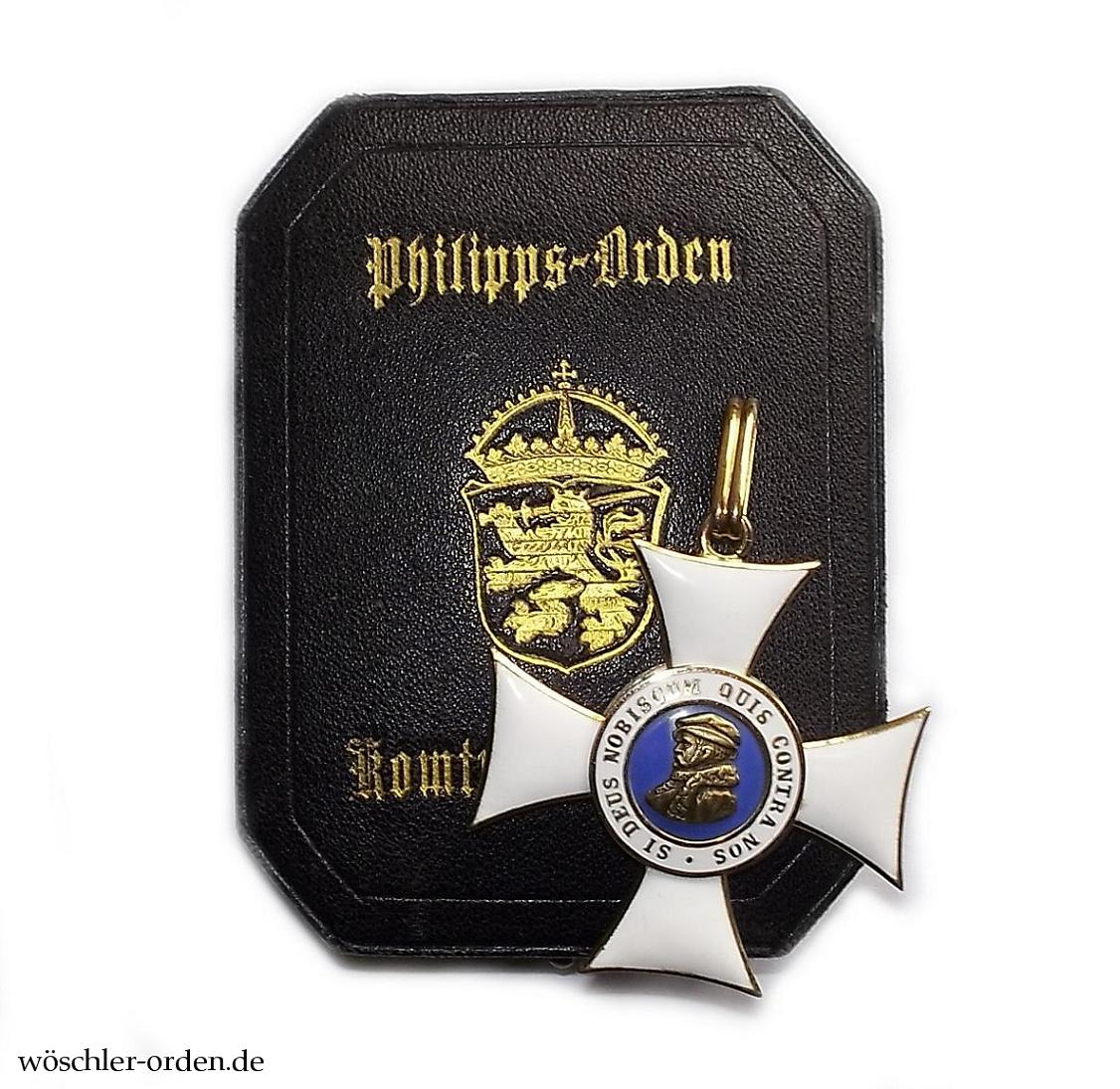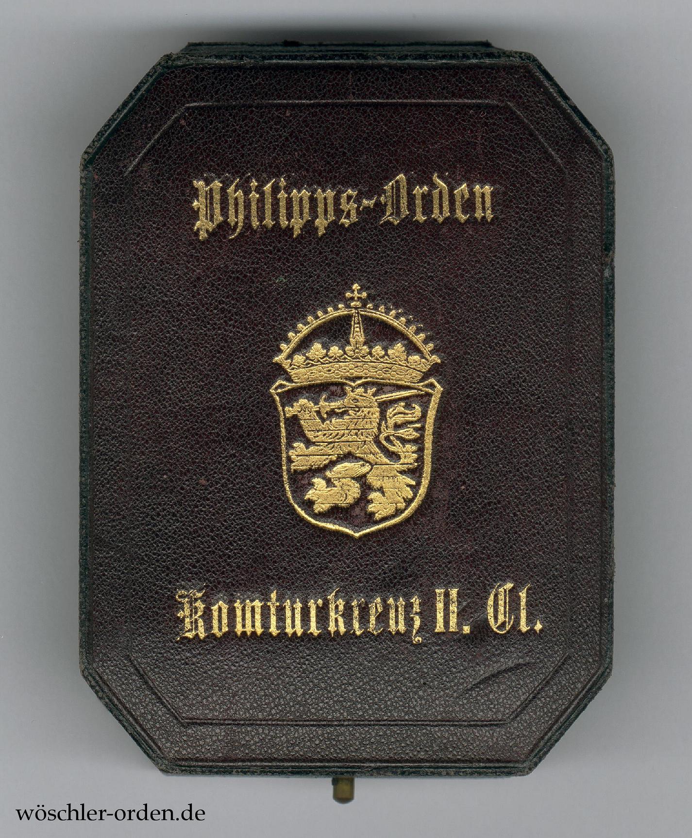 Dazu das oktogonale Verleihungsetui aus der Regierungszeit Großherzog Ernst Ludwigs, in dunkelrotbraunem Leder, goldfarben mit dem hessischen Wappen und der zweizeiligen Zweckinschrift „Philipps-Orden / Komturkreuz II. Cl.“ bedruckt. Innen altweißer Seidenhimmel und rote Samteinlage mit Aussparung für das Ordenskreuz und den Bandring.