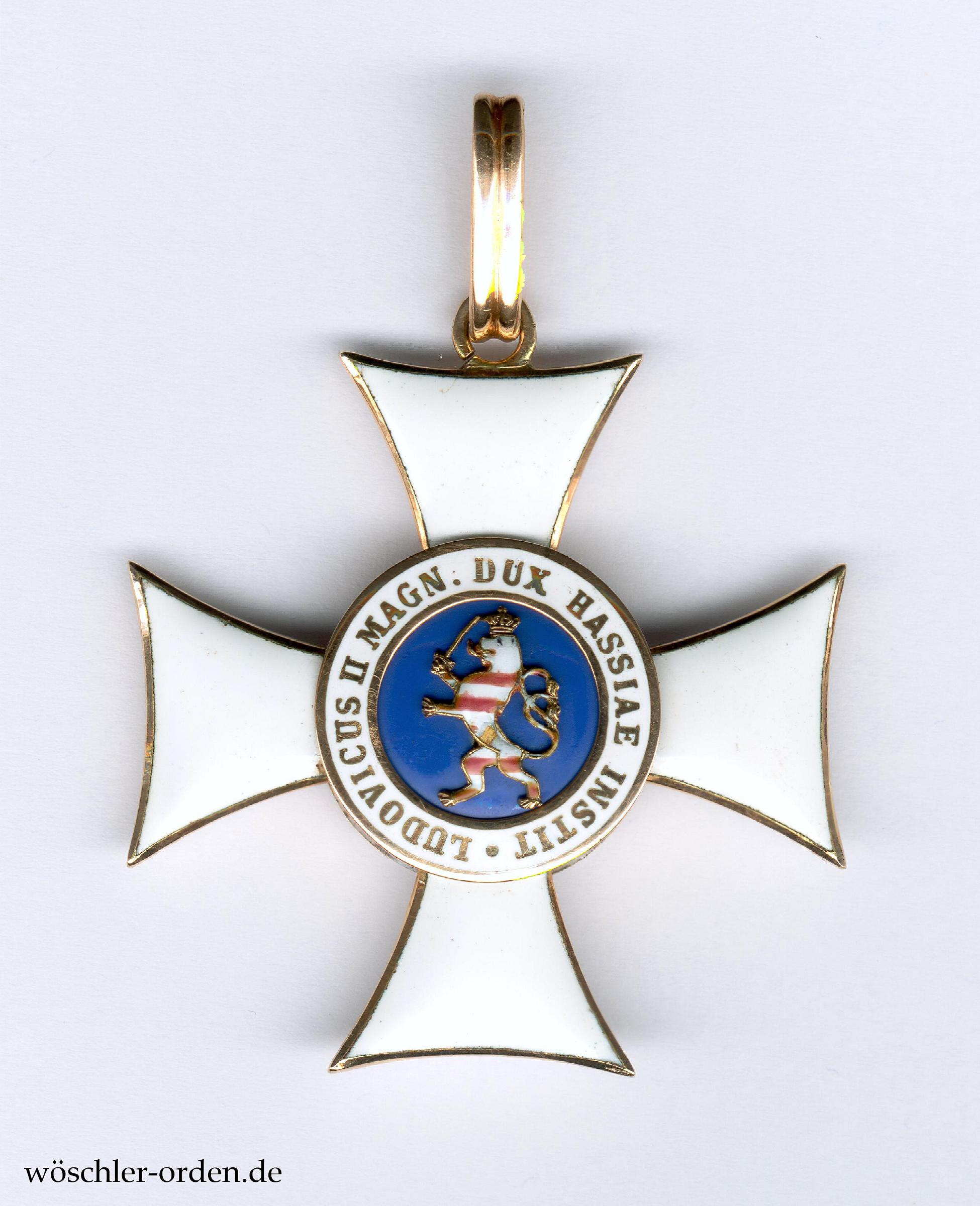 Exemplar des zweiten, ab 1849 verliehenen Modells mit der Büste des Landgrafen Philipp im Vorderseitenmedaillon. Gold und Emaille, mehrteilig gefertigt, an gekehltem Bandring für das Halsband. Fertigung der Firma C. F. Zimmermann, Pforzheim, etwa aus der Zeit um 1900/1910, ohne jegliche Punzierungen.