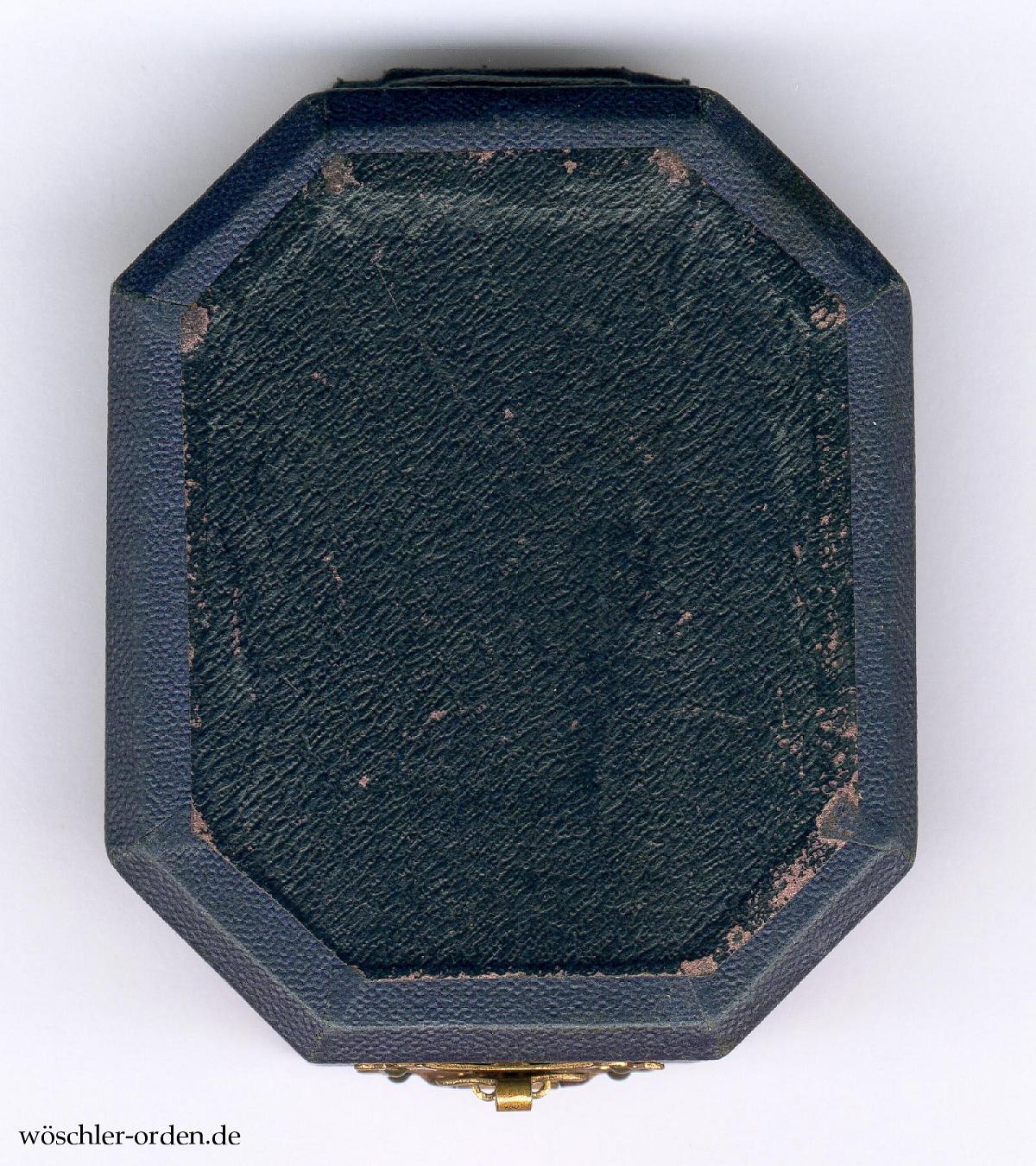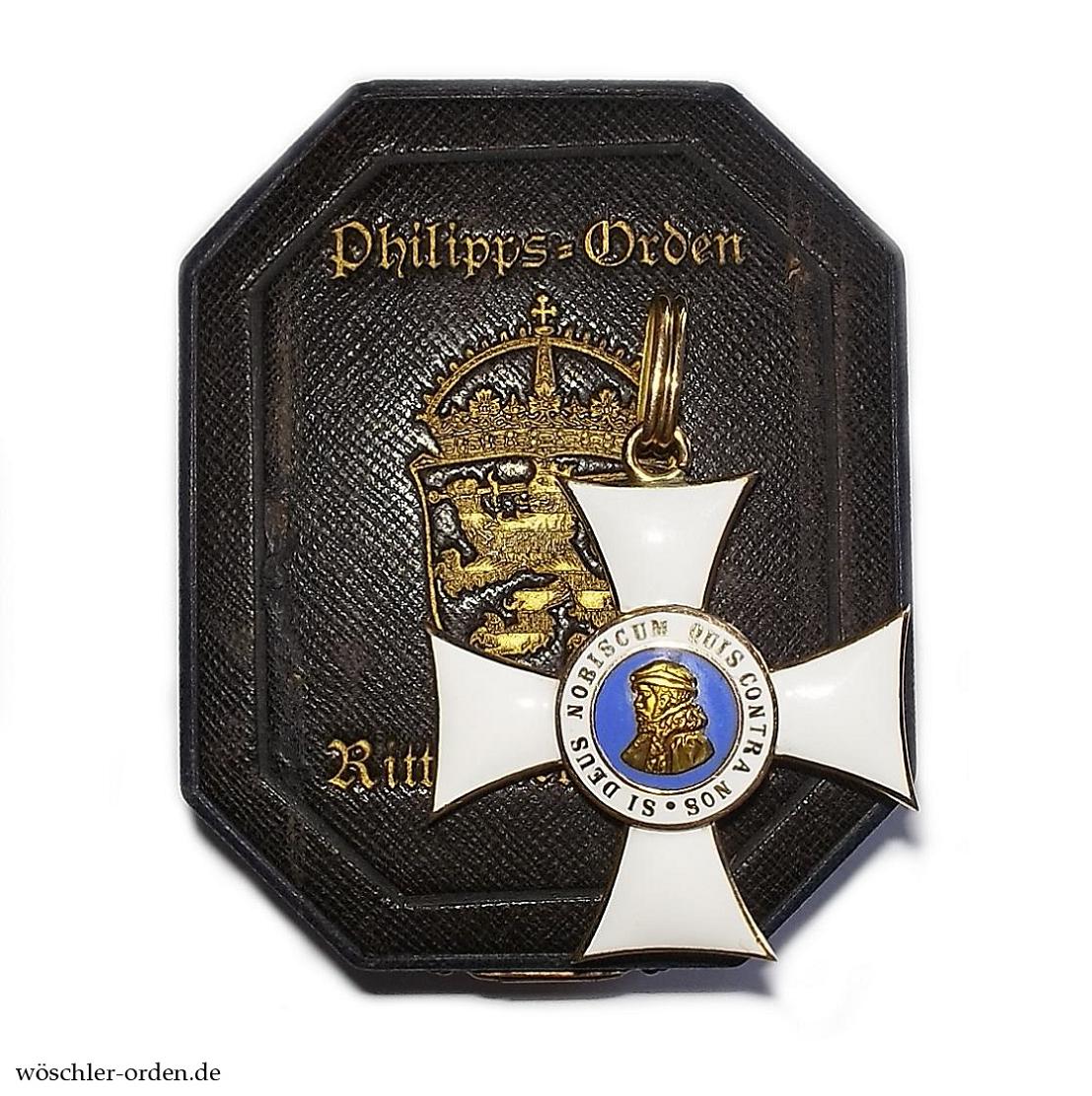 Dazu das oktogonale Verleihungsetui aus der Regierungszeit Großherzog Ernst Ludwigs, in dunkelrotbraunem Leder, goldfarben mit dem hessischen Wappen und der zweizeiligen Zweckinschrift „Philipps-Orden / Ritterkreuz I. Cl.“ bedruckt. Innen altweißer Seidenhimmel mit seidener Halterung für das Band und blaue Samteinlage mit Aussparung für das Ordenskreuz und den Bandring.