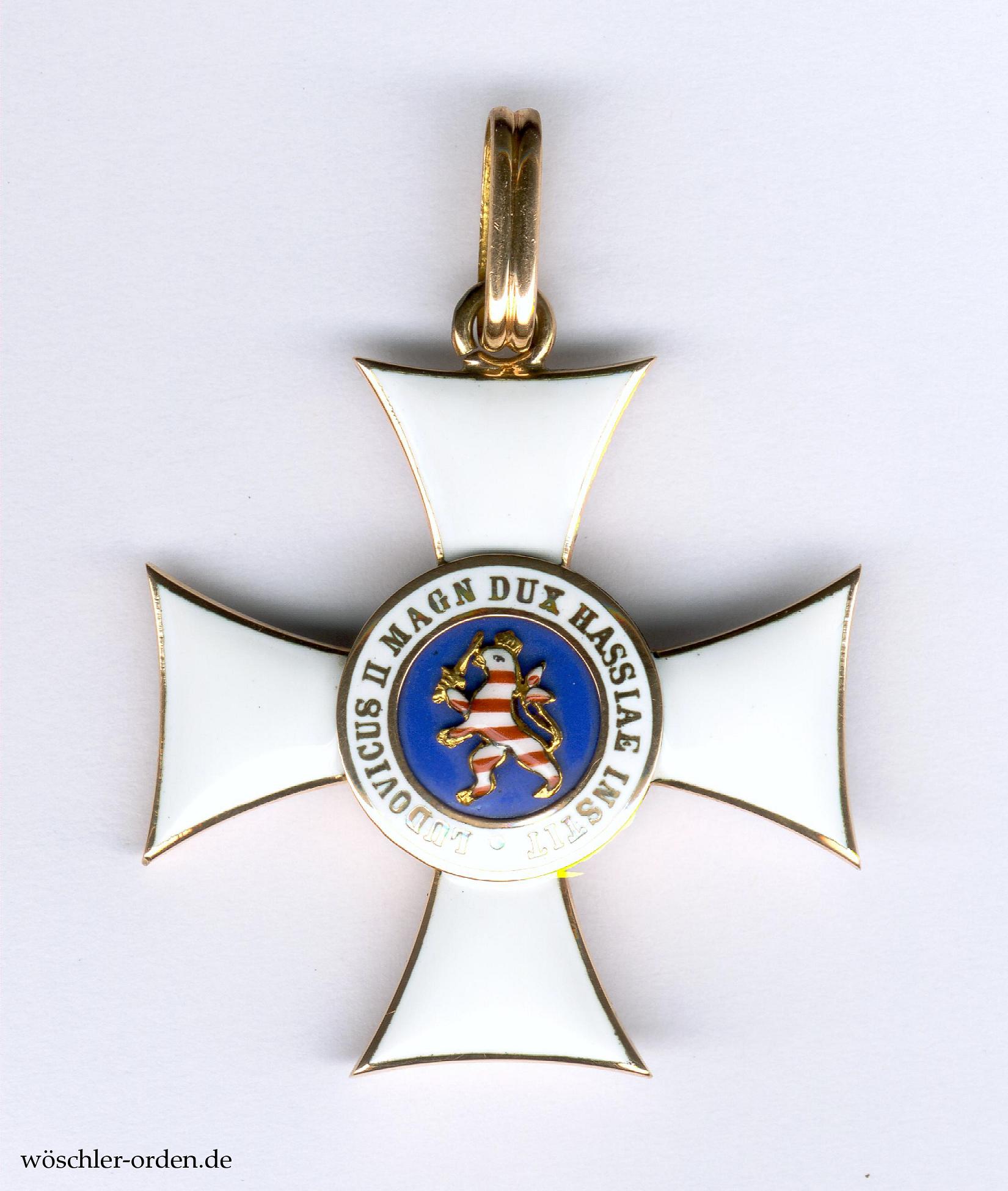 Exemplar des zweiten, ab 1849 verliehenen Modells mit der Büste des Landgrafen Philipp im Vorderseitenmedaillon. Gold und Emaille, mehrteilig gefertigt, an gekehltem Bandring. Fertigung der Firma C. F. Zimmermann, Pforzheim, etwa aus der Zeit um 1900/1910, ohne jegliche Punzierungen.